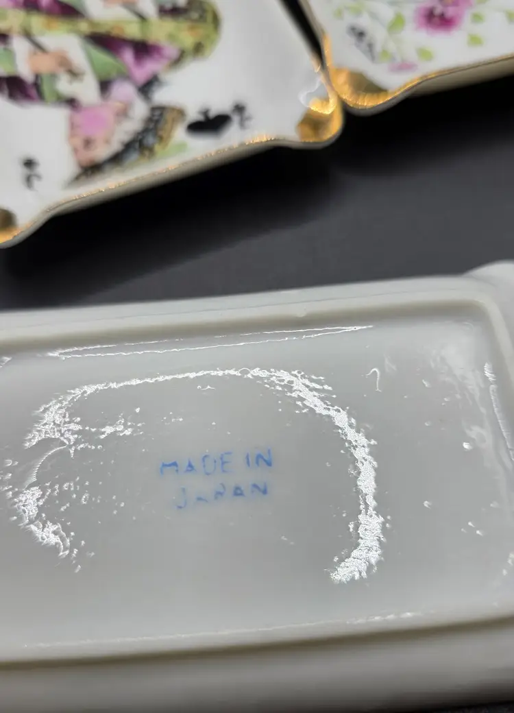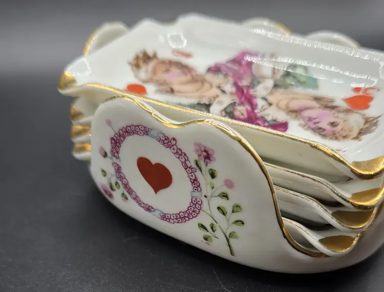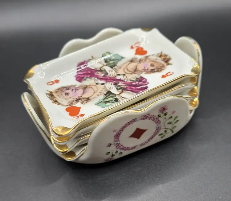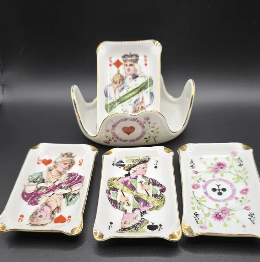 This whimsical porcelain trinket set is a delightful fusion of elegance and playfulness. Crafted in Japan, likely during the mid-20th century, the set features four rectangular dishes stacked inside a scalloped holder, each adorned with vibrant playing card illustrations. The top dish showcases a mirrored Queen of Hearts in regal Victorian attire, while the holder displays a red diamond emblem framed by delicate floral detailing.