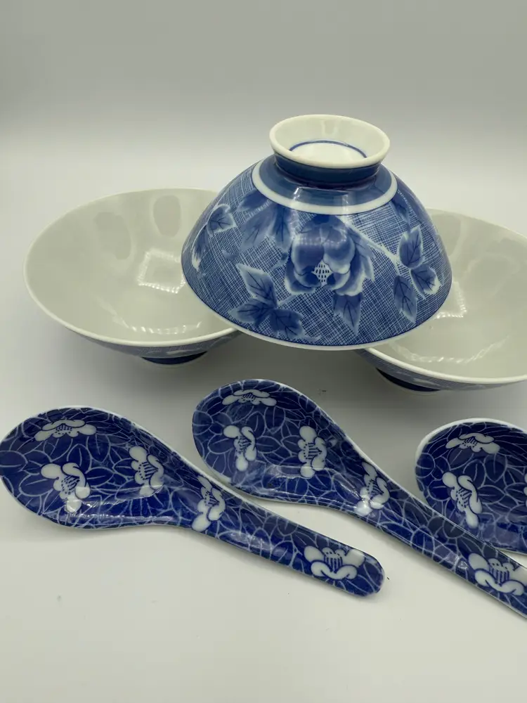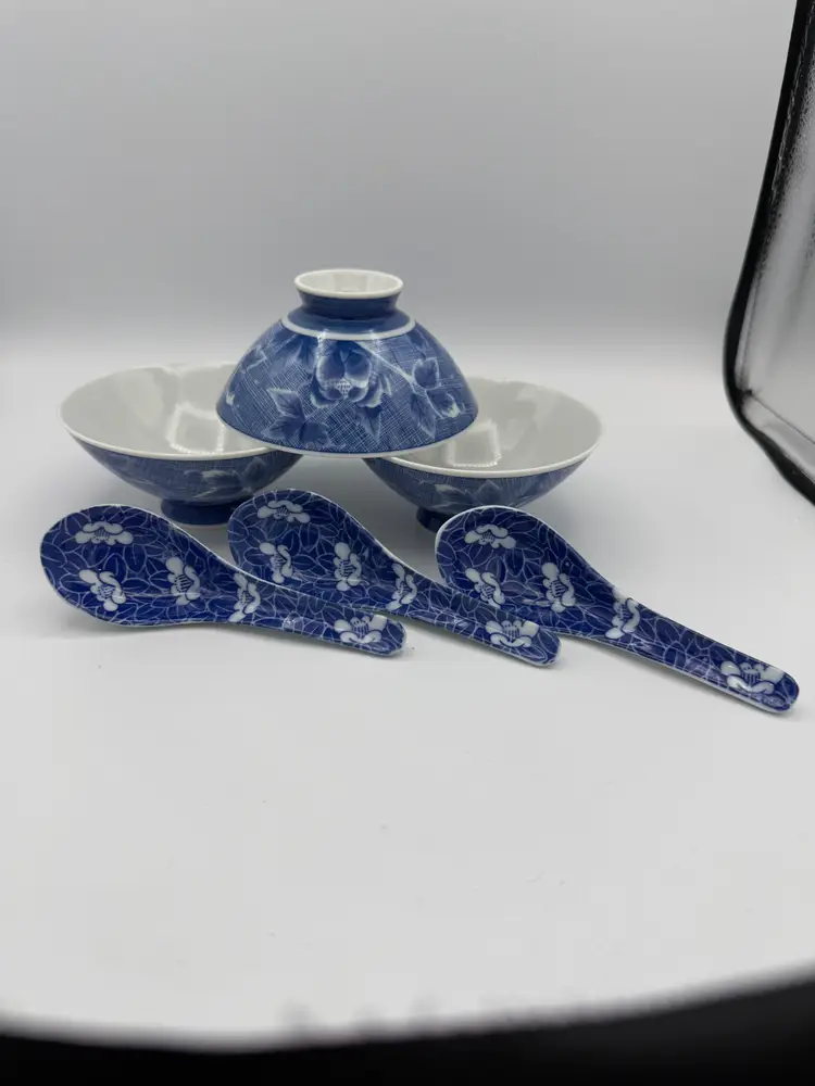 Vintage Japanese Porcelain Set of 3 Footed Rice Bowls and 3 Spoons. Floral/Leaf Design. No Chips/Cracks.