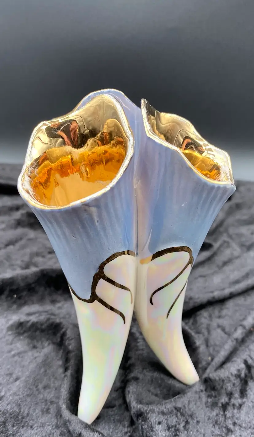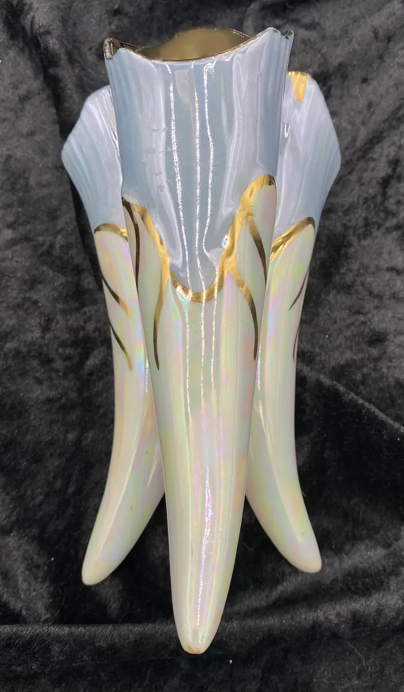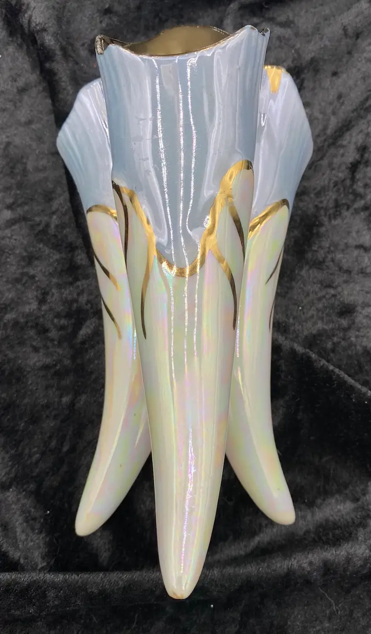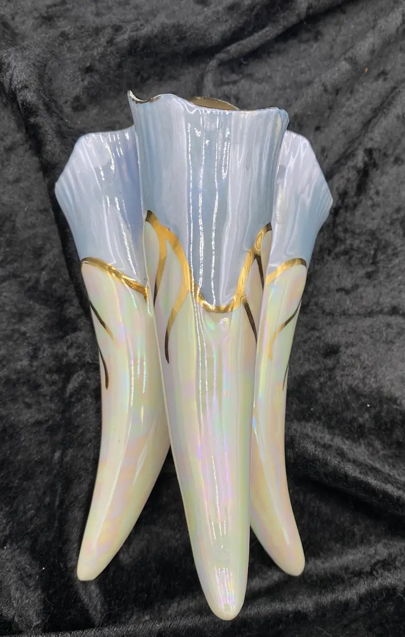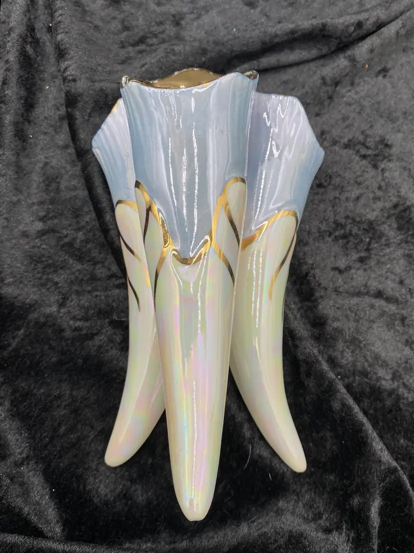 This vintage Japanese 3-horn flower vase is a stunning piece of art. The beautiful purple lusterware and white iridescence make it a must-have for collectors. The vase stands at 6.5 inches tall and measures 4.25 inches in width. Handmade in Japan, this vase weighs 10.3 ounces and features a three-horn shape. Each horn has an upper portion of purple iridescence with a gold filigree design giving way to white iridescence. The inside of each horn is painted gold, as are the edges. The vase is perfect for displaying flowers or as a standalone decorative piece. It is also possible that it was designed as a tussy mussy (portable bouquet holder), although it would be for a very large bouquet, such as a bride's bouquet. The piece's design and exquisite beauty make it a valuable addition to any collection.