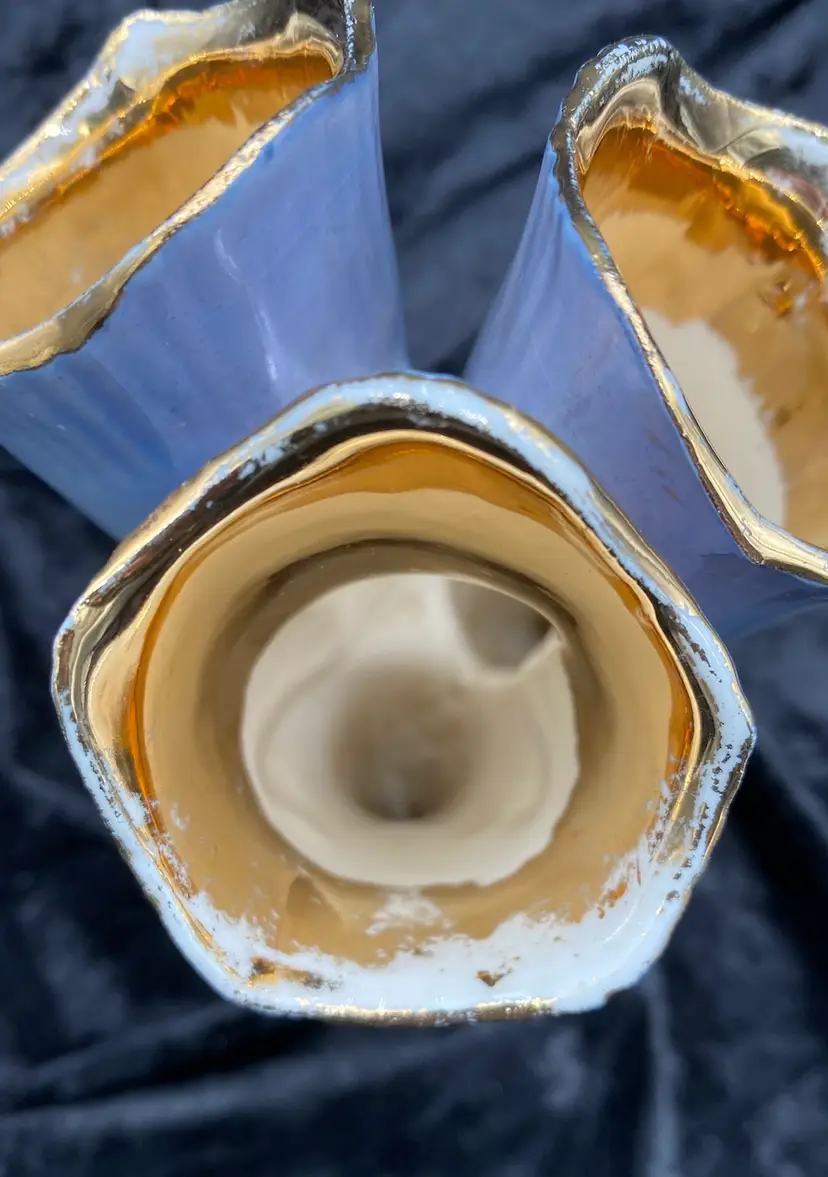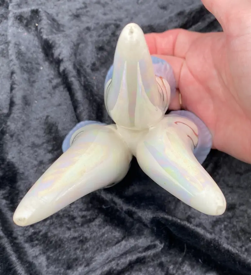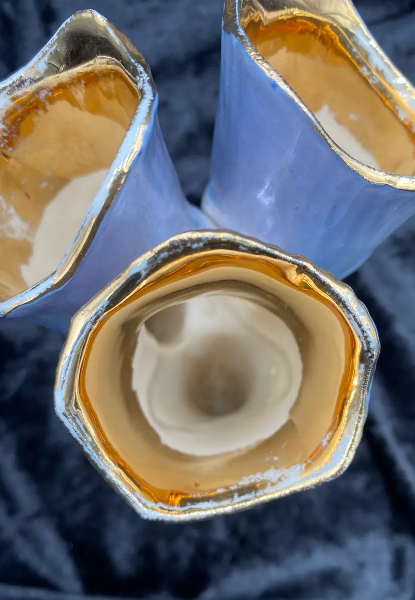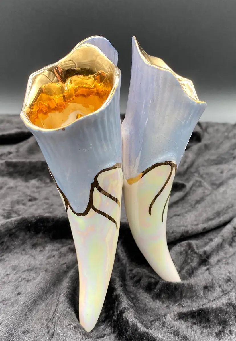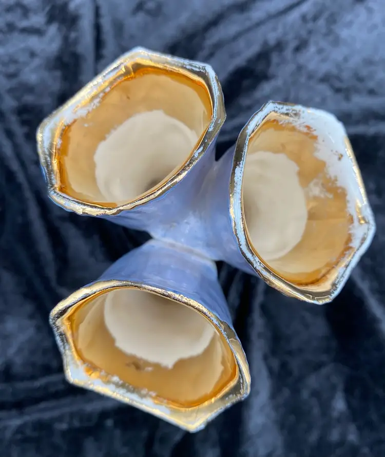 This vintage Japanese 3-horn flower vase is a stunning piece of art. The beautiful purple lusterware and white iridescence make it a must-have for collectors. The vase stands at 6.5 inches tall and measures 4.25 inches in width. Handmade in Japan, this vase weighs 10.3 ounces and features a three-horn shape. Each horn has an upper portion of purple iridescence with a gold filigree design giving way to white iridescence. The inside of each horn is painted gold, as are the edges. The vase is perfect for displaying flowers or as a standalone decorative piece. It is also possible that it was designed as a tussy mussy (portable bouquet holder), although it would be for a very large bouquet, such as a bride's bouquet. The piece's design and exquisite beauty make it a valuable addition to any collection.