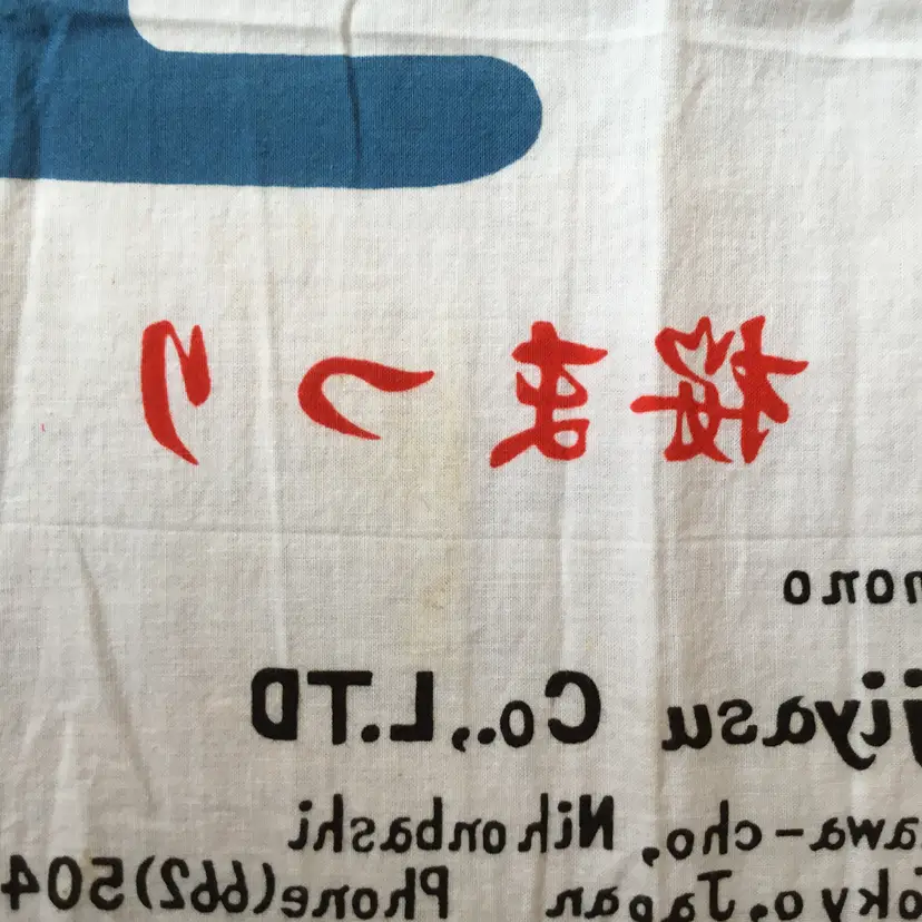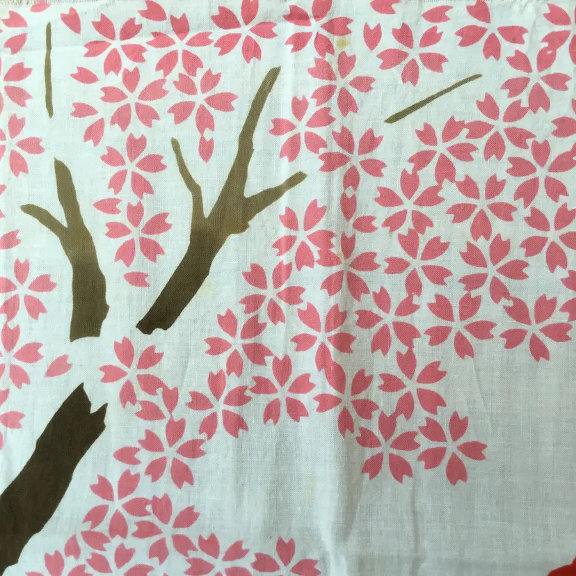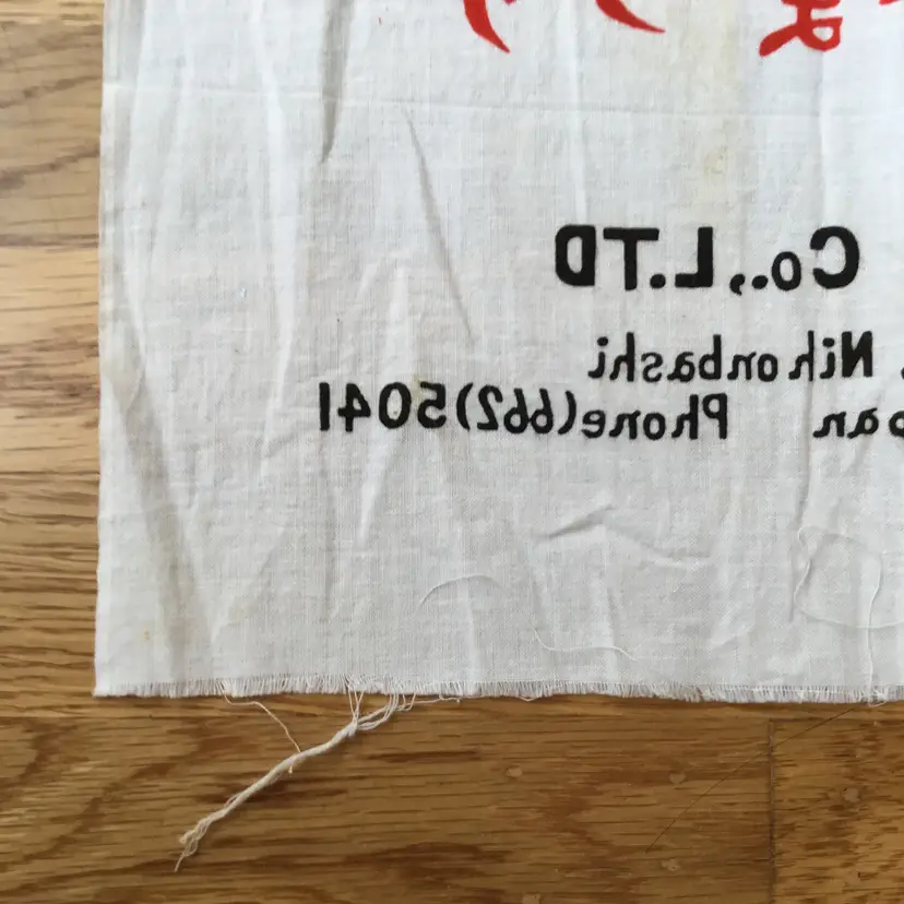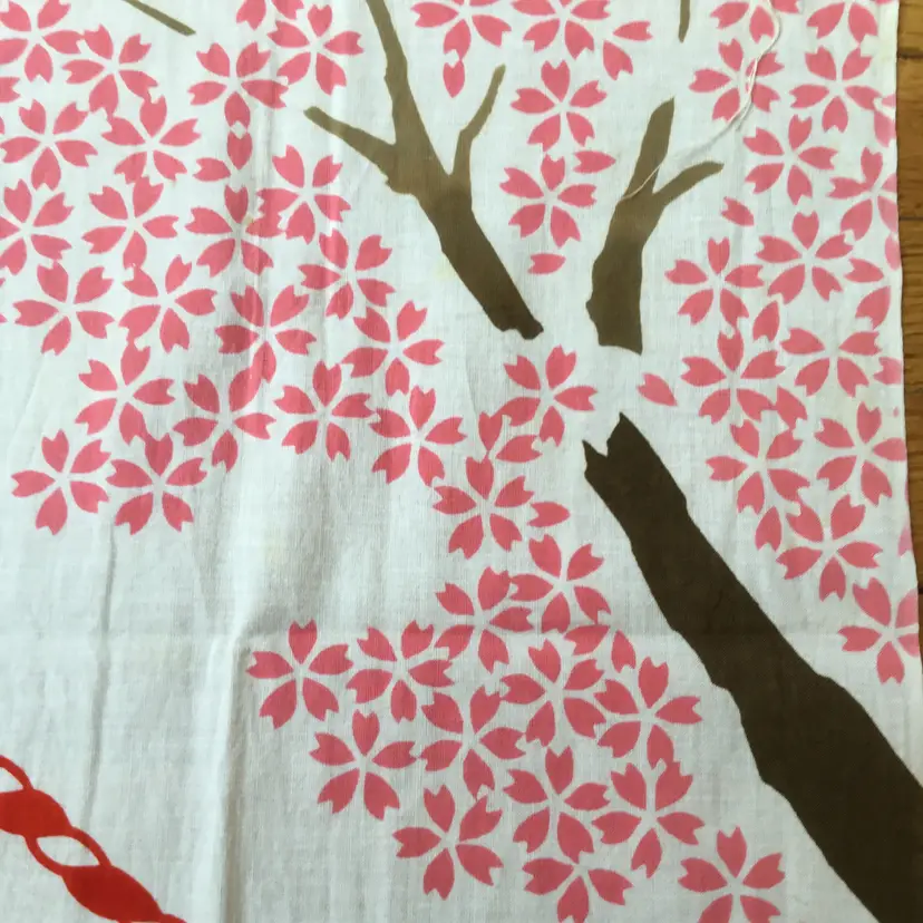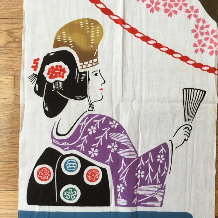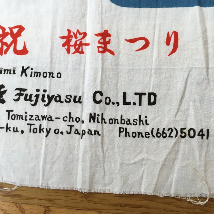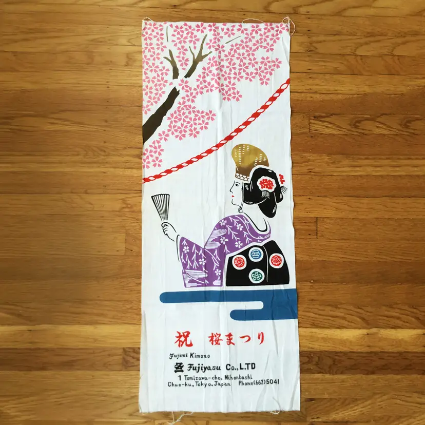 This is a screen printed fabric panel that features a geisha and a cherry blossom tree. It is a promotional piece for Fujiyasu Co., a Japanese retail store. This perhaps was a former noren, or door curtain due to its size.