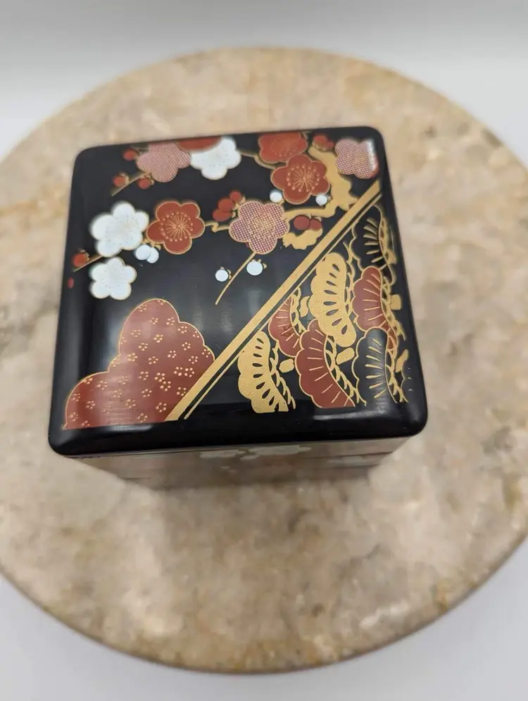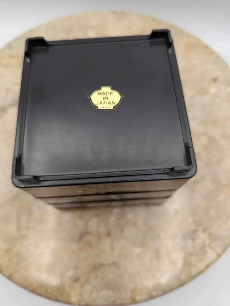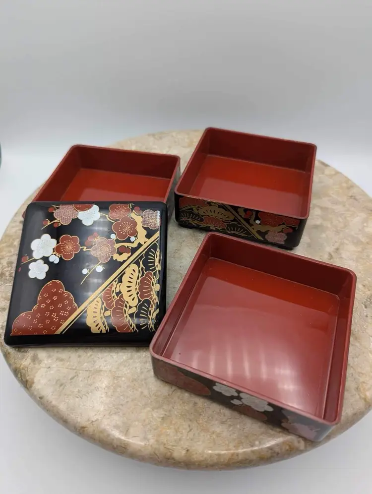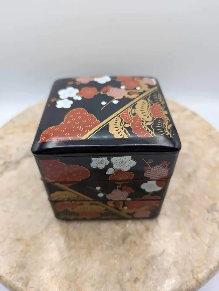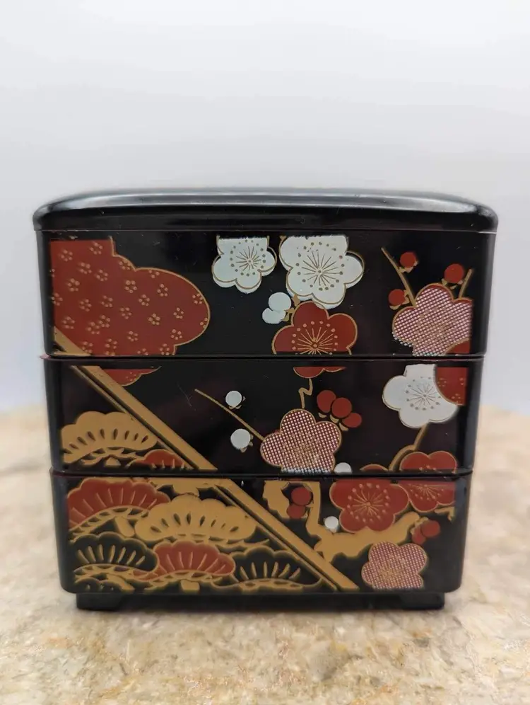 This Japanese Stack Bento Box Lunch Container is a perfect addition to your collection. Made in Japan and marked Yamanaka, this 3-tier box is ideal for storing your lunch essentials. Jewlery and trinkets. The box is made of plastic with a glossy finish and features a multicolor design that is perfect for any Asian-themed decor. 3 1/4” X 3 1/2”