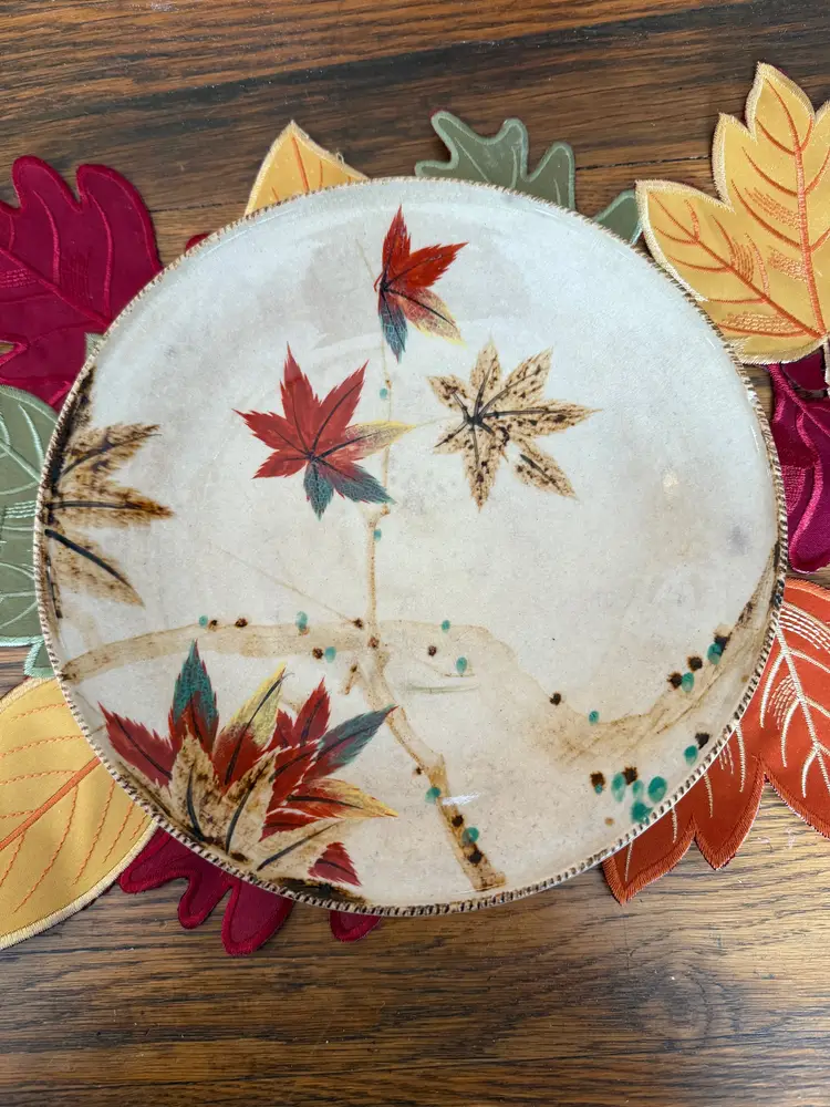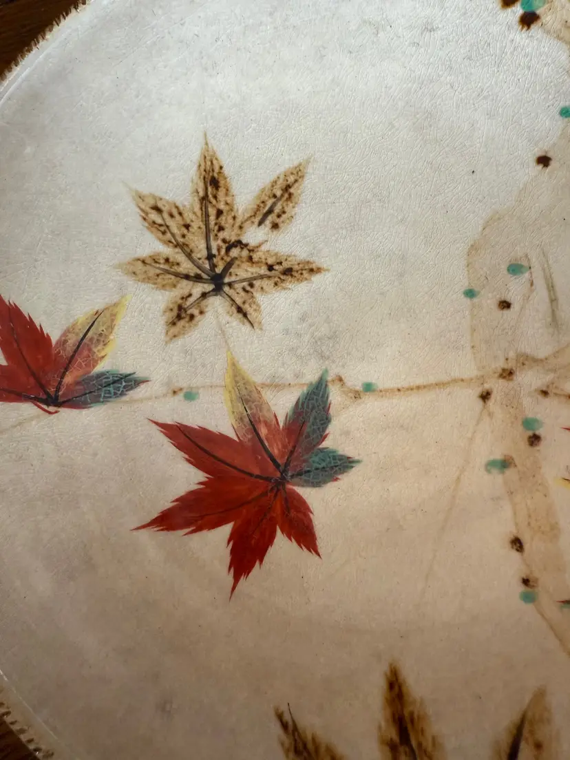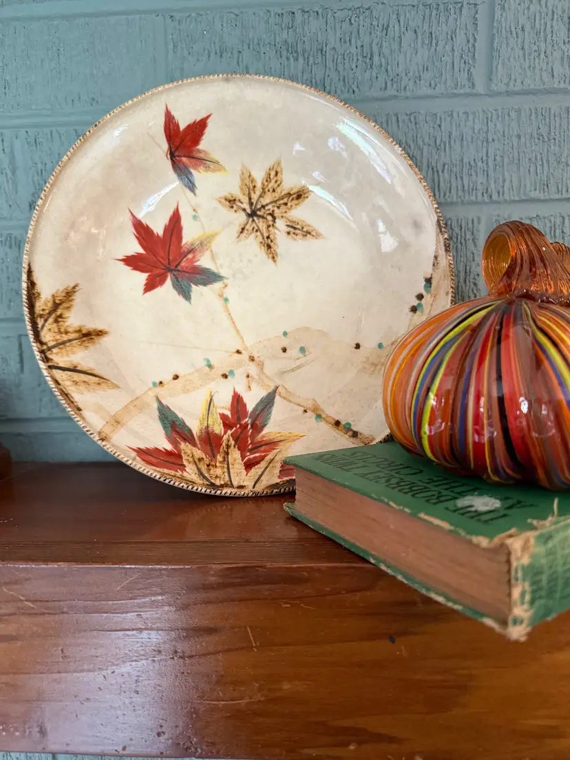 Add a touch of Japanese folk artistry to your collection with this beautiful vintage Yamamoto pottery shallow bowl. Measuring approximately 9 inches across and 2 inches tall, this hand-painted piece features a striking maple leaf (momiji) motif in warm autumn tones of red, brown, and green. The maple leaf is a beloved seasonal symbol in Japanese culture, representing the beauty of autumn and the passage of time.