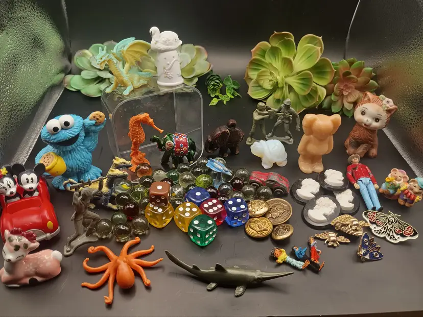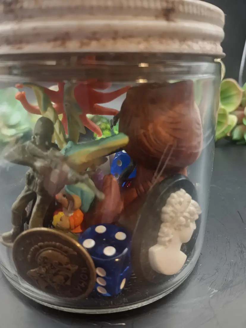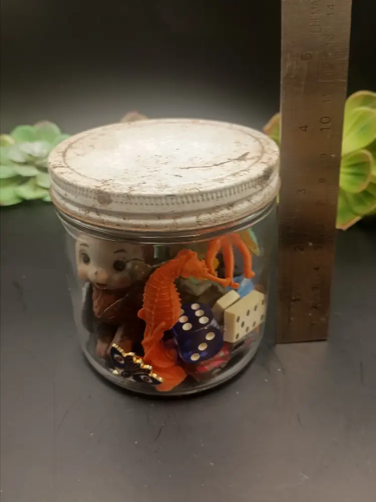 Hi in this listing you will receive 1 vintage jar full of trinkets/miniatures perfect for your trinket shelf. You will receive the exact jar pictured. The picture with the trinkets out of the jar are examples of what you might get. The green flowers are not included. Inventory changes often. You will receive approximately 25 items. You may receive items like vintage porcelain animals, vintage metal toys, vintage plastic toys, vintage glowy marbles, vintage buttons, vintage glass dice, vintage cameos, vintage pendants, pins, and broaches, vintage game pieces, vintage carved animals, and much more. I have more of these jars coming. Please let me know if you have any questions.