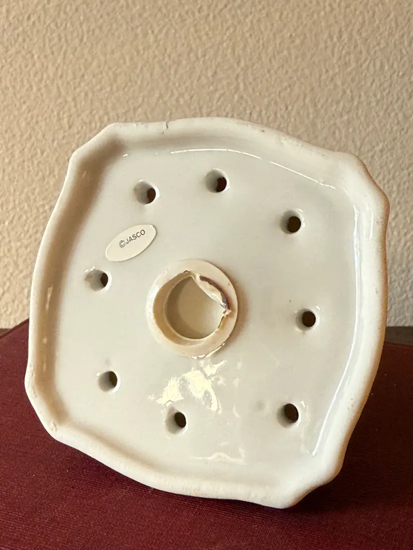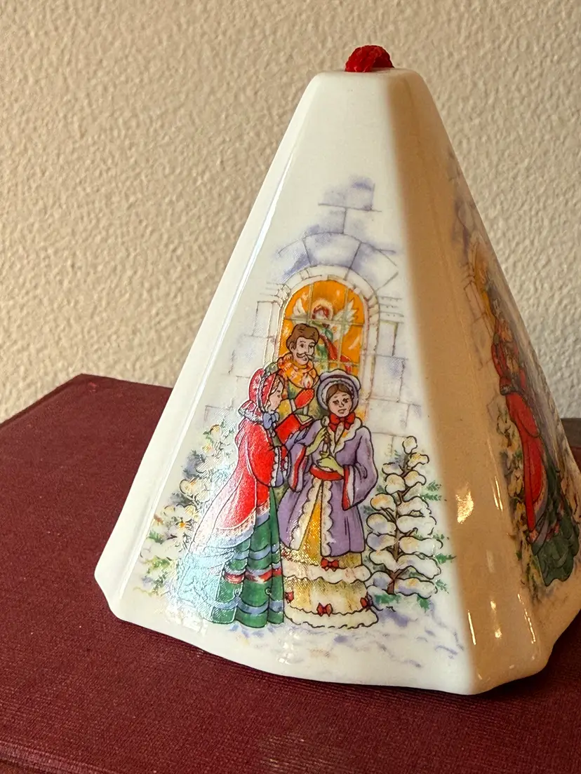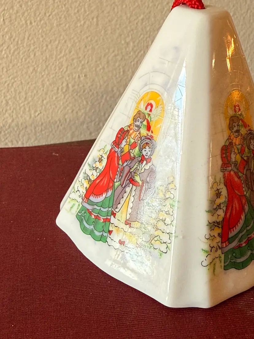Pair of vintage Jasco Festive Fragrant porcelain Christmas ornaments, also known as potpourri or pomander holders. These pyramid-shaped ornaments feature Victorian carolers in a snowy church window scene and include their original red hanging cords. Both are marked © JASCO on the base.