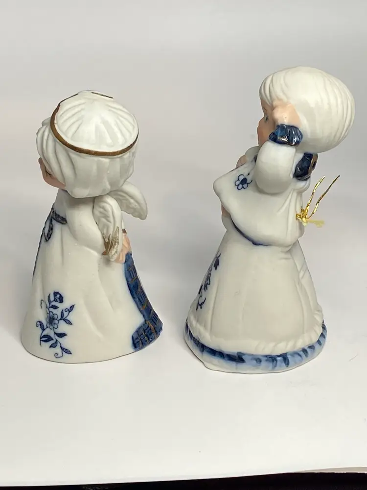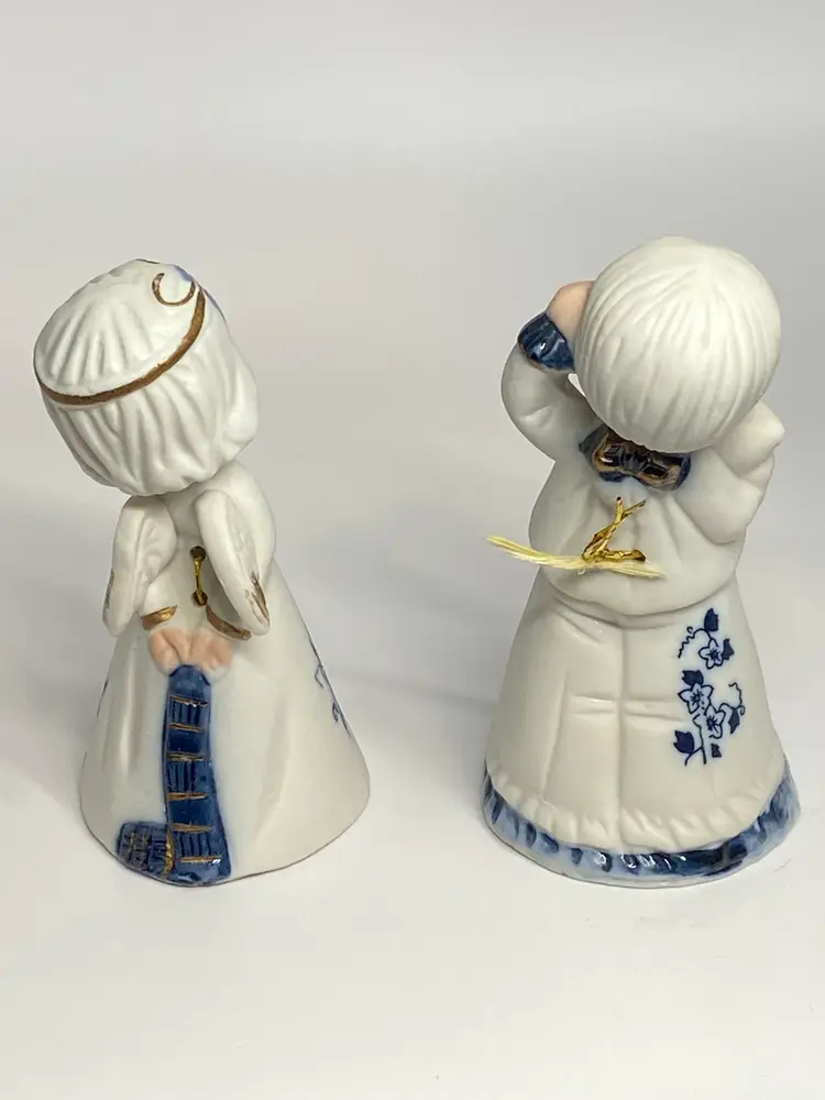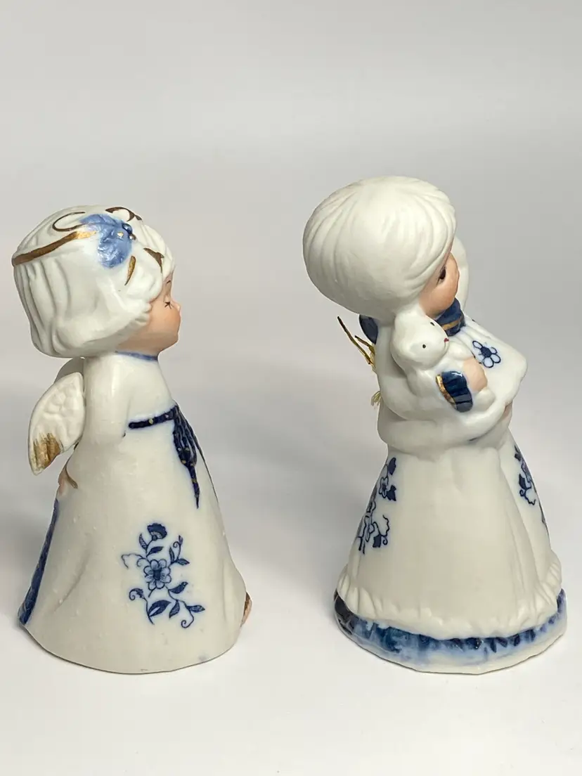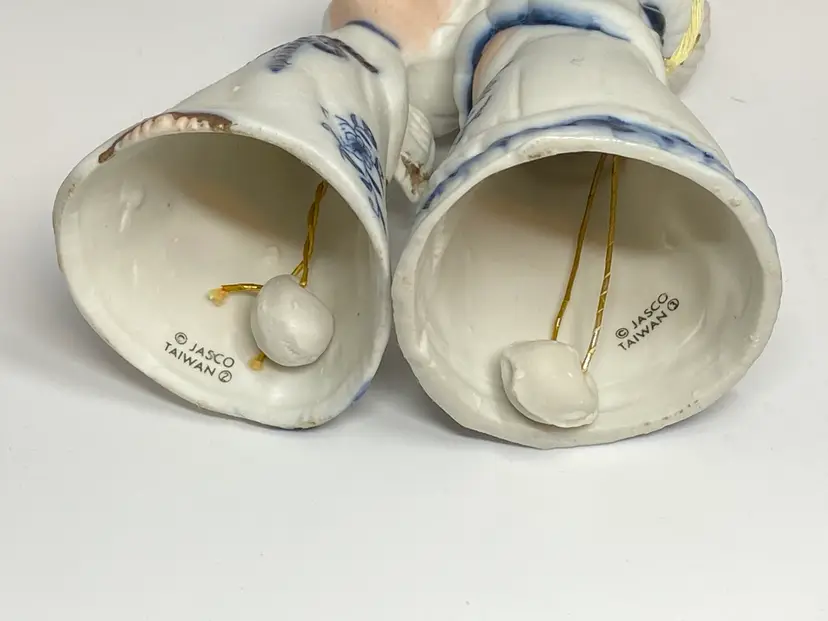 The Vintage Jasco Porcelain Boy & Girl Angel Bells stand at 4.25" tall and are made of delicate porcelain material. These charming bells feature a blue and white color scheme, perfect for any room. The set includes two bells, one with a boy angel design and the other with a girl angel design, making them a sentimental addition to any collection. The JASCO brand adds a touch of authenticity to these late 20th-century collectibles.