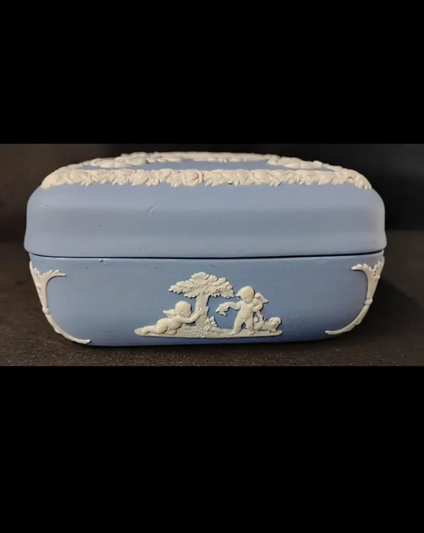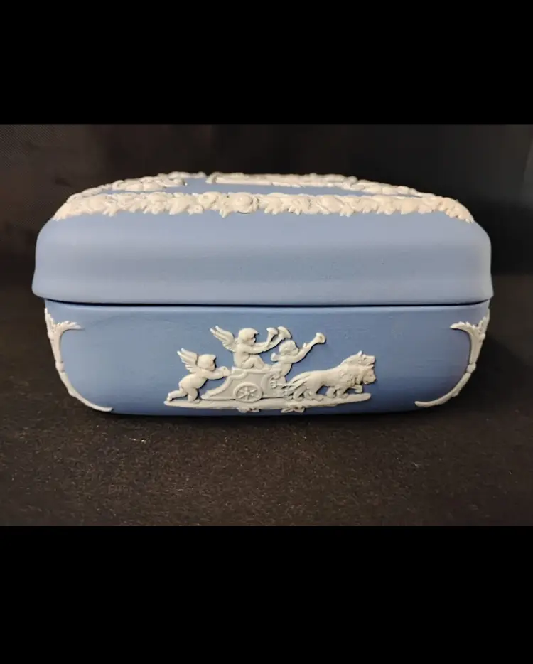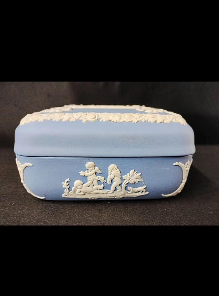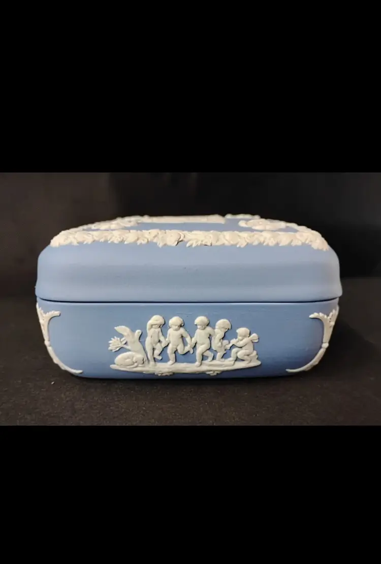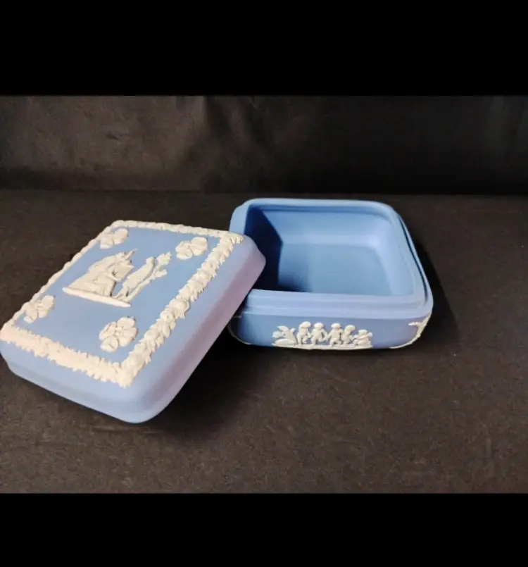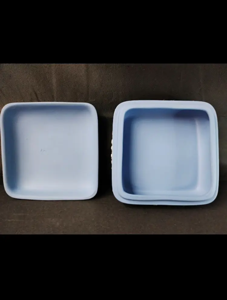 This beautiful 4" x 2" Wedgwood England blue and white jasperware trinket box with lid is a perfect addition to any collection. The square shape and matte finish of this small box make it suitable for all occasions and easy to store on a window, bin, or furniture. The box features a Greek design, with a subject of boxing, and is made of high-quality ceramic material.