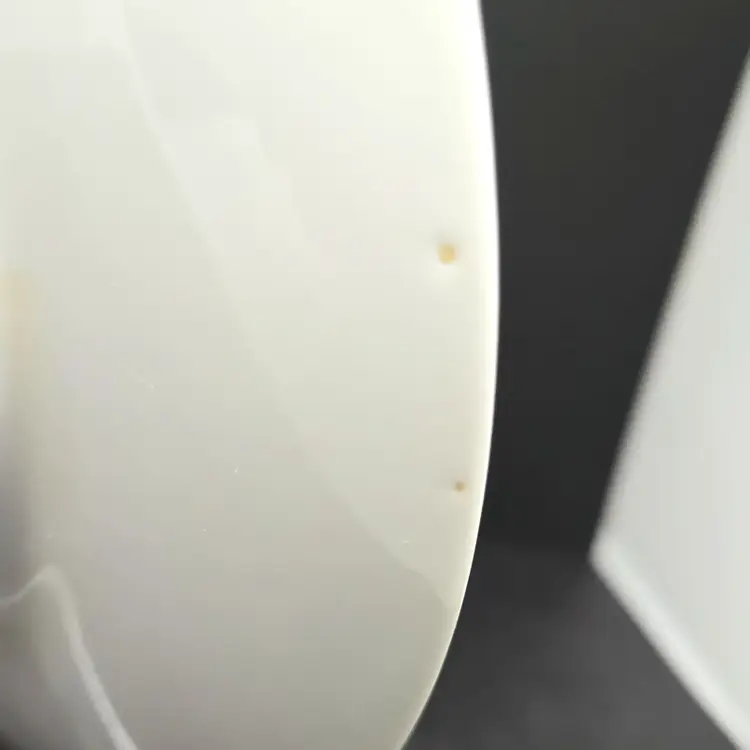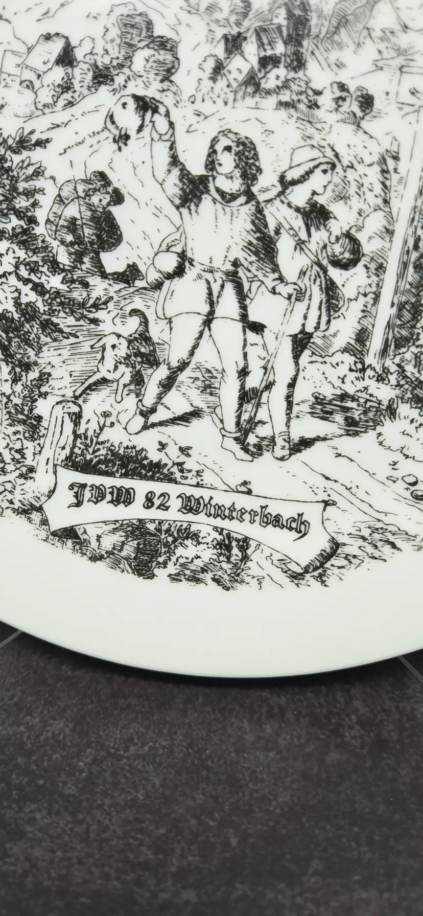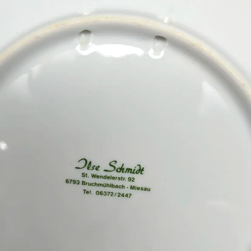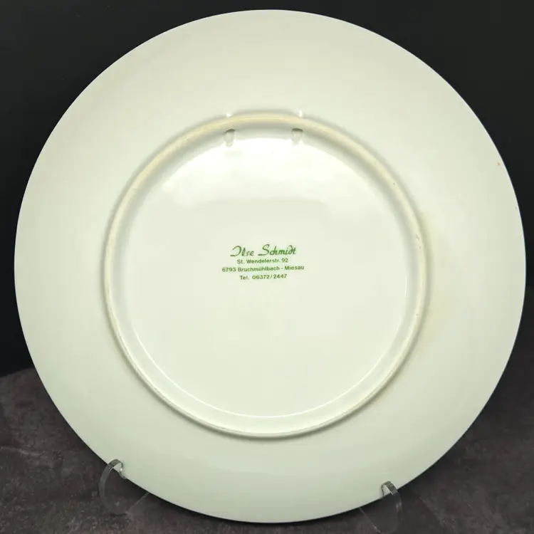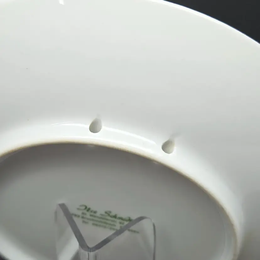 No chips or cracks. There are divots on the back of the plate, last photo. There are 2 intact holes for wall hanging.