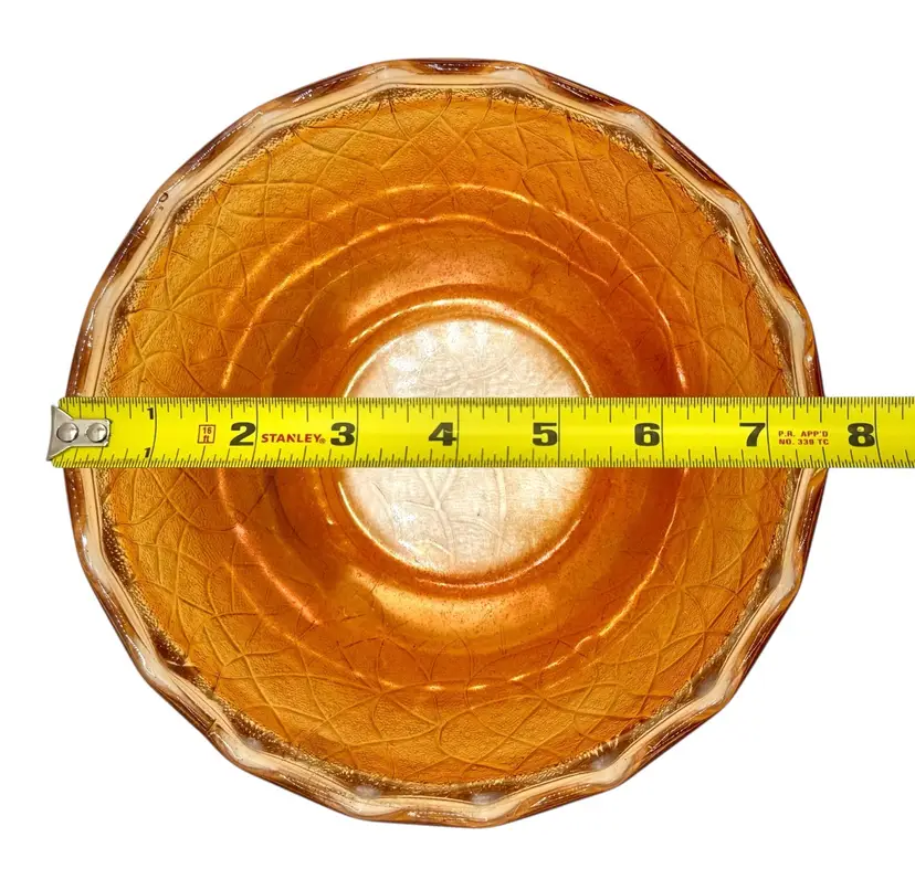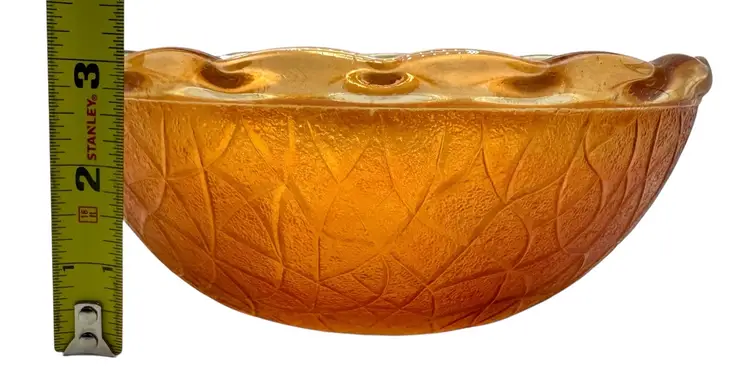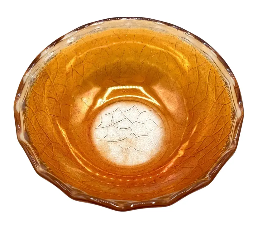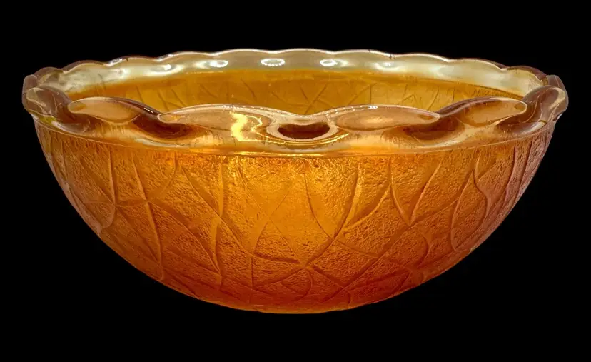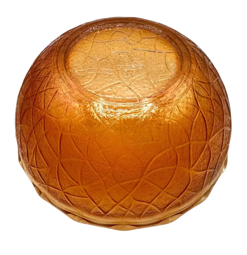 Iridescent orange glass bowl with a raised crackle texture on the outside.