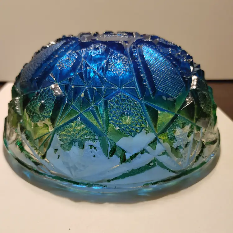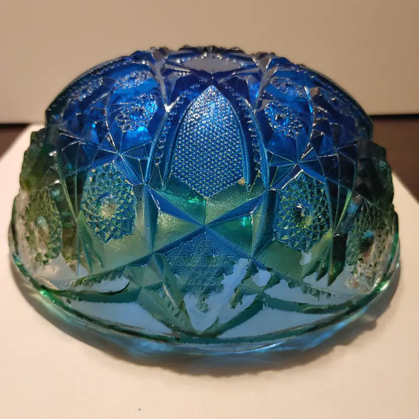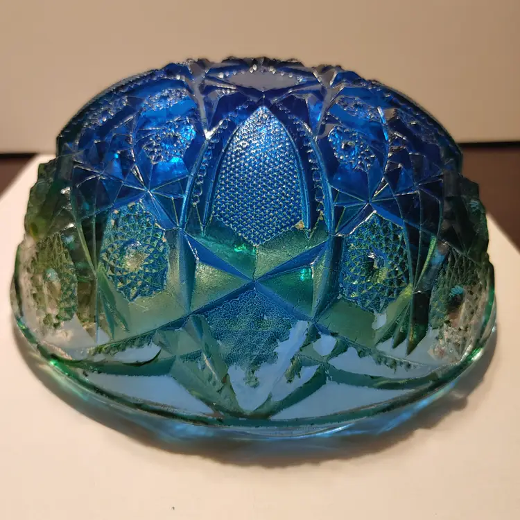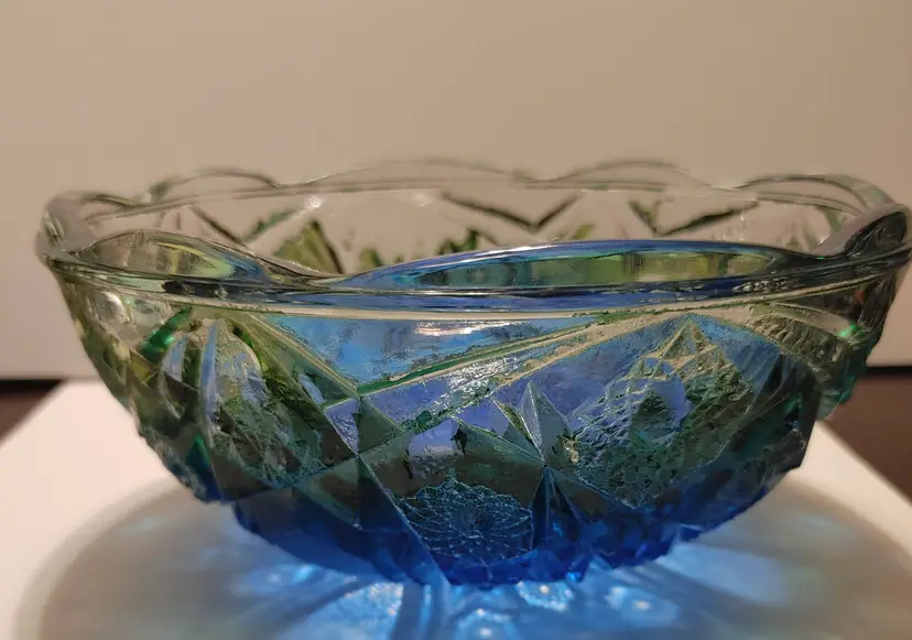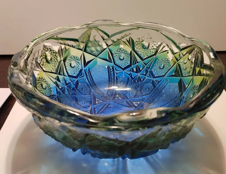 Vintage Jeanette Glass Flashed Bowl- blue and green. 7x3 in. *Some flea bites on rim but no chipping. Some flashing missing.