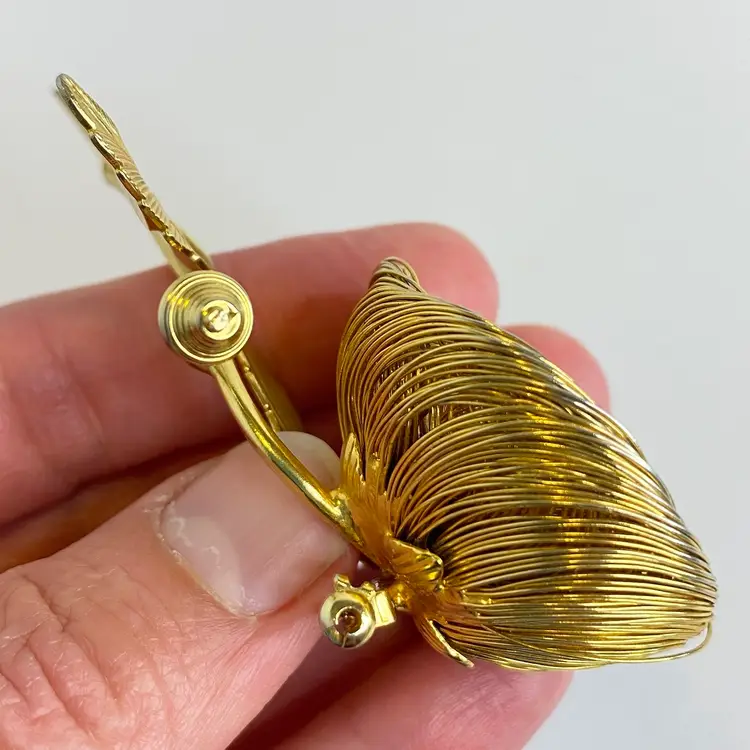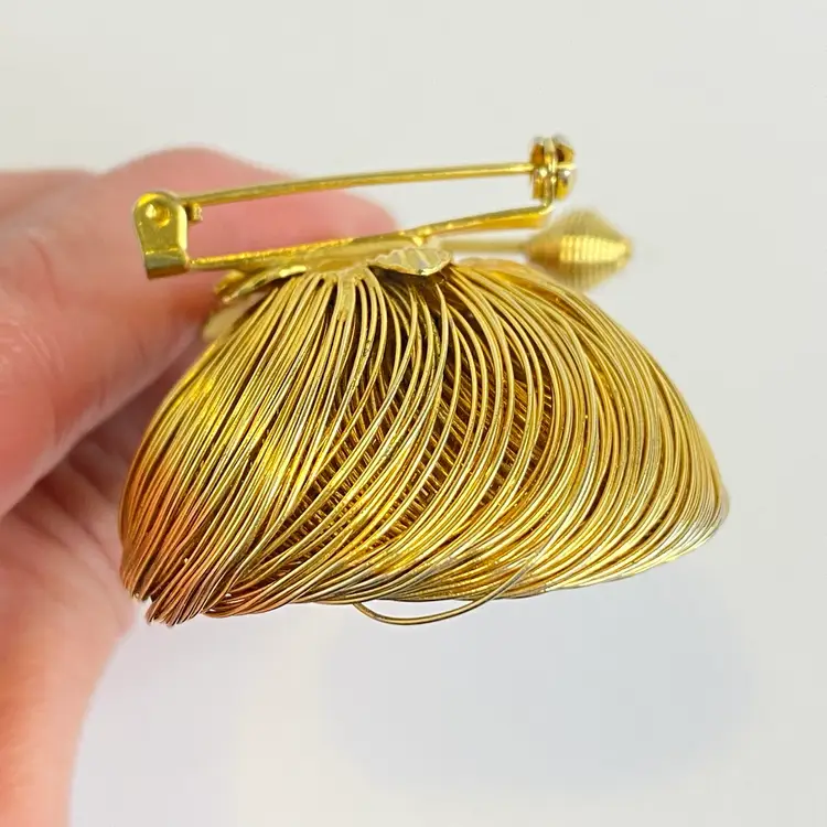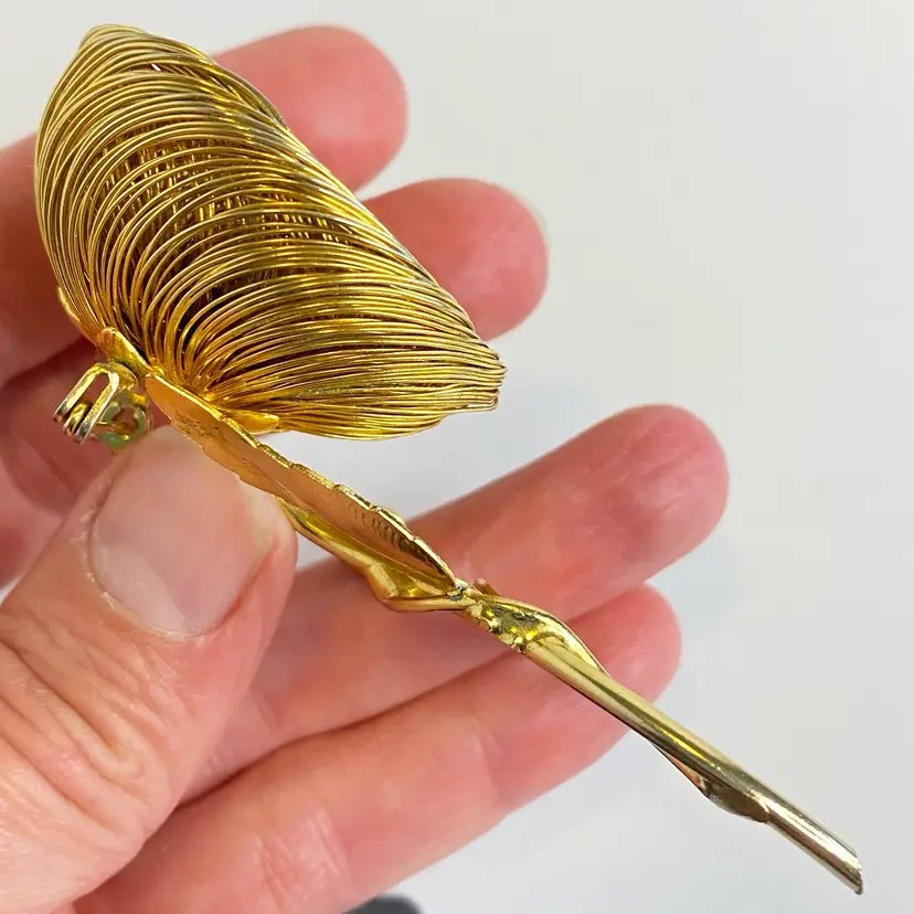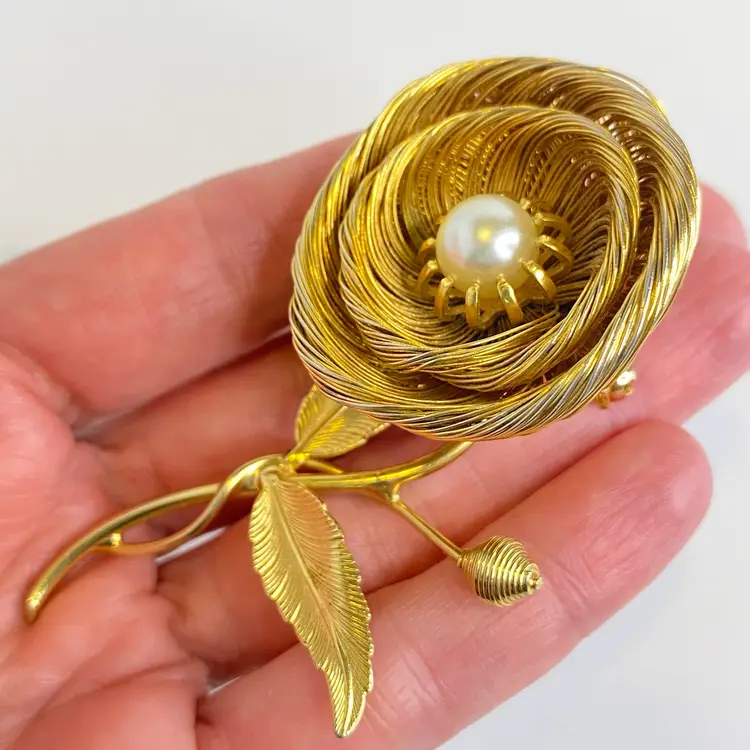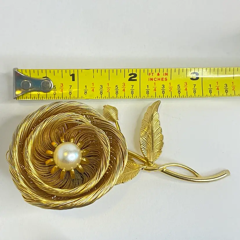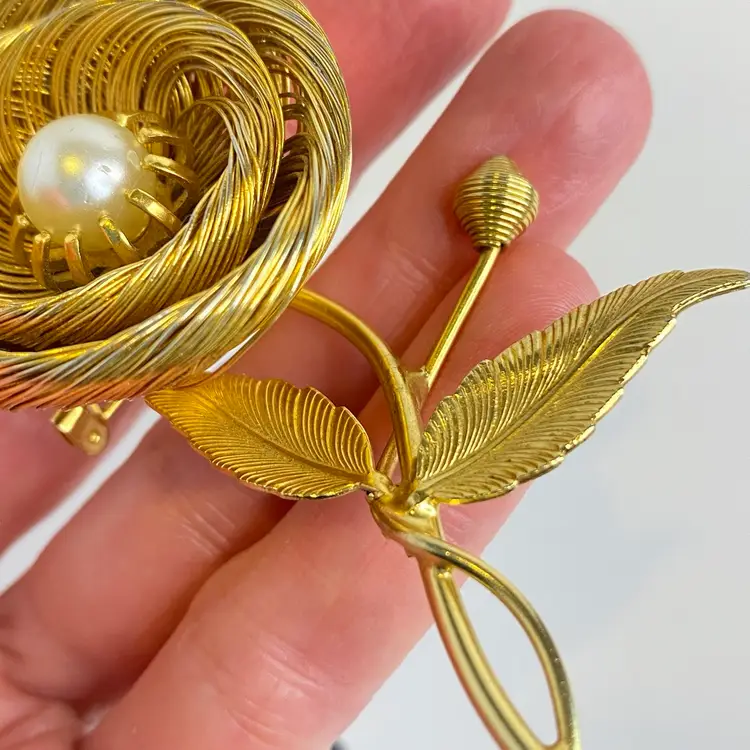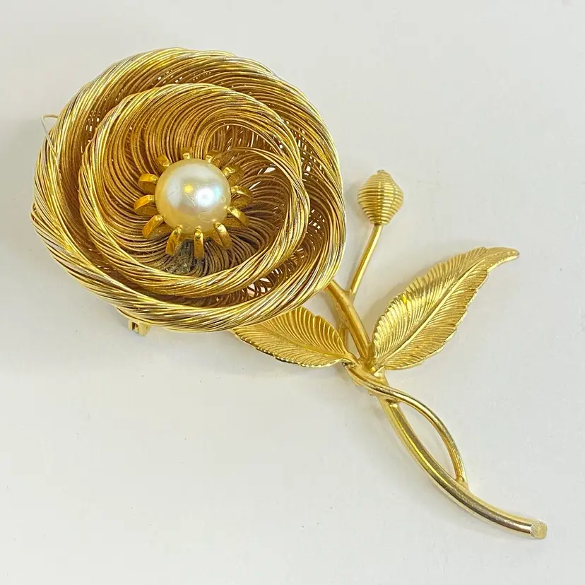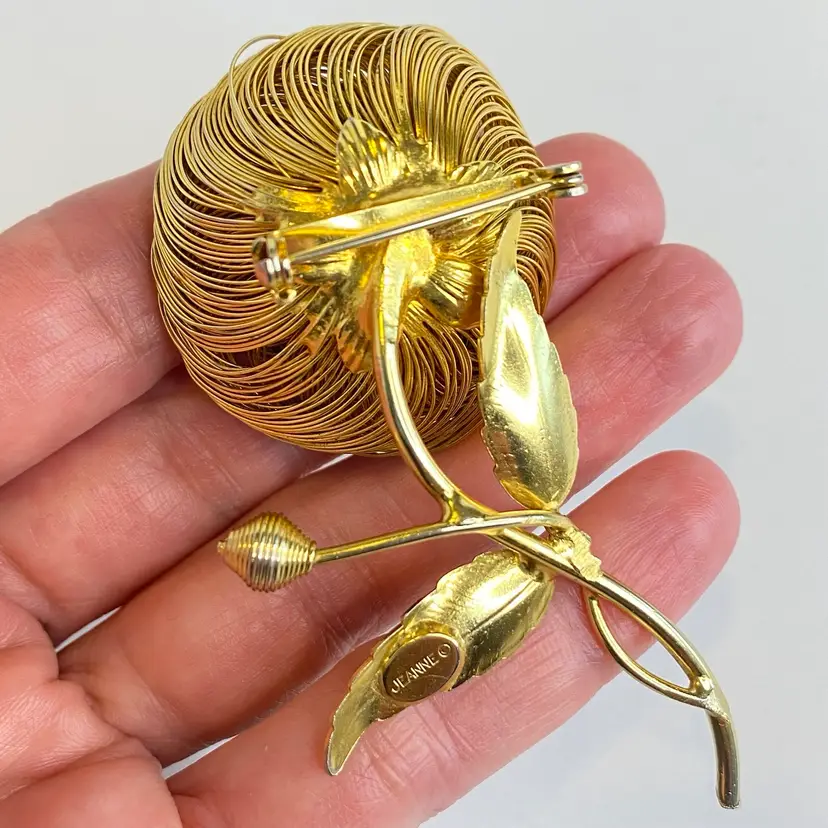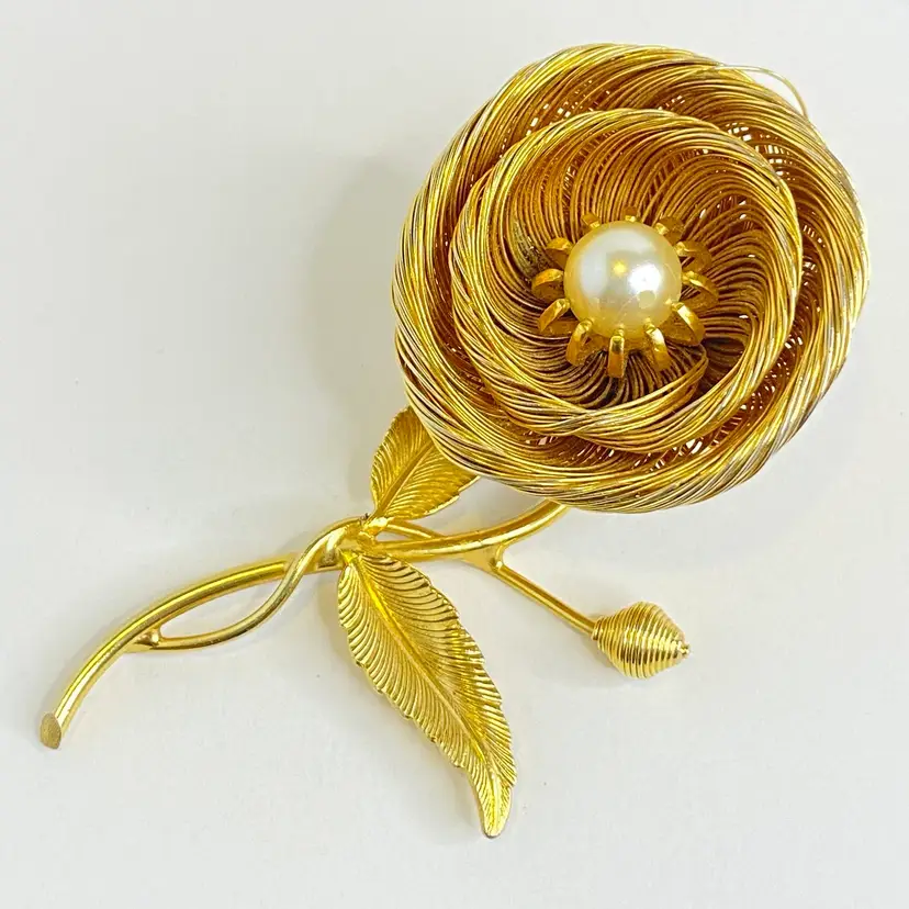 Vintage Jeanne Brooch Floral Signed Gold Tone Wire Flower Faux Pearl Center 3.25". This elegant vintage brooch by Jeanne features layered gold tone wire petals forming a dimensional flower with a luminous faux pearl center. The stem includes detailed textured leaves and a budding flower, capturing a delicate and timeless floral motif. Jeanne pieces are known for their high-quality design and are prized by collectors of mid-century costume jewelry. Signed "Jeanne" on the back. Good vintage condition consistent with age. Please see pictures for details. SMOKE FREE / PET FREE HOME