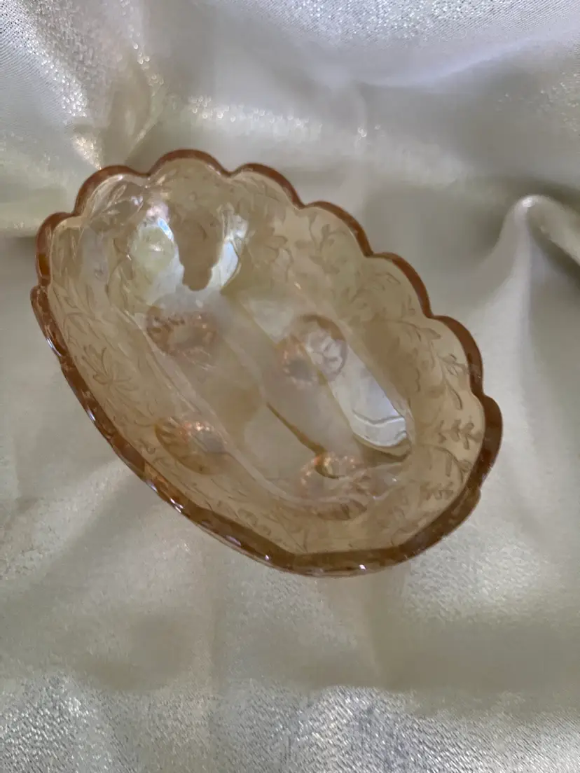 This beautiful peach colored iridescent glass was made in the 1950s by Jeannette Glass.The feet on the beauty are uniquely curved inward. The dish is 5 3/4 inches long 3/14 inches wide and 2 inches tall. It is in excellent condition. A second dish is also available. Let’s talk.