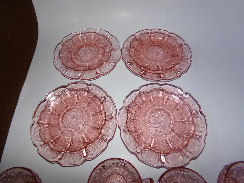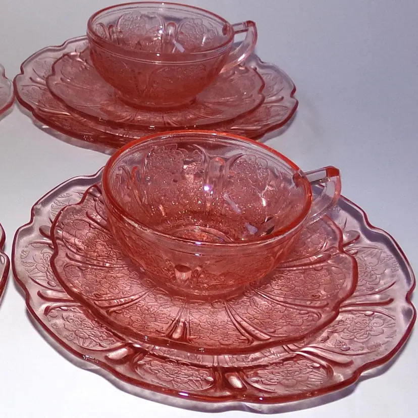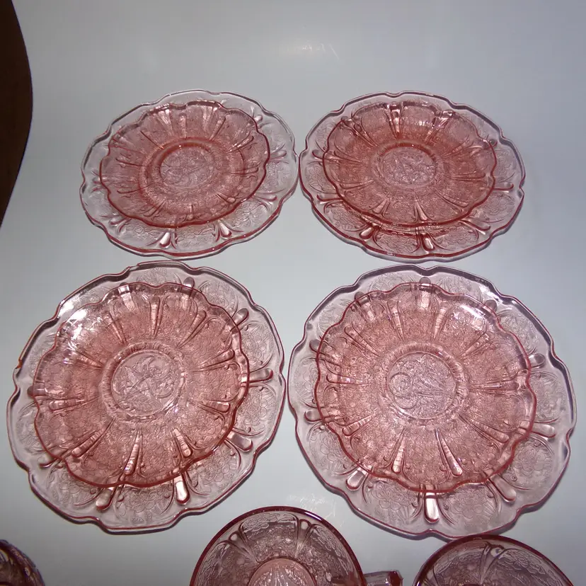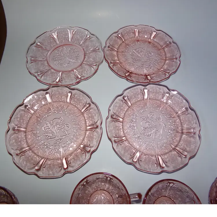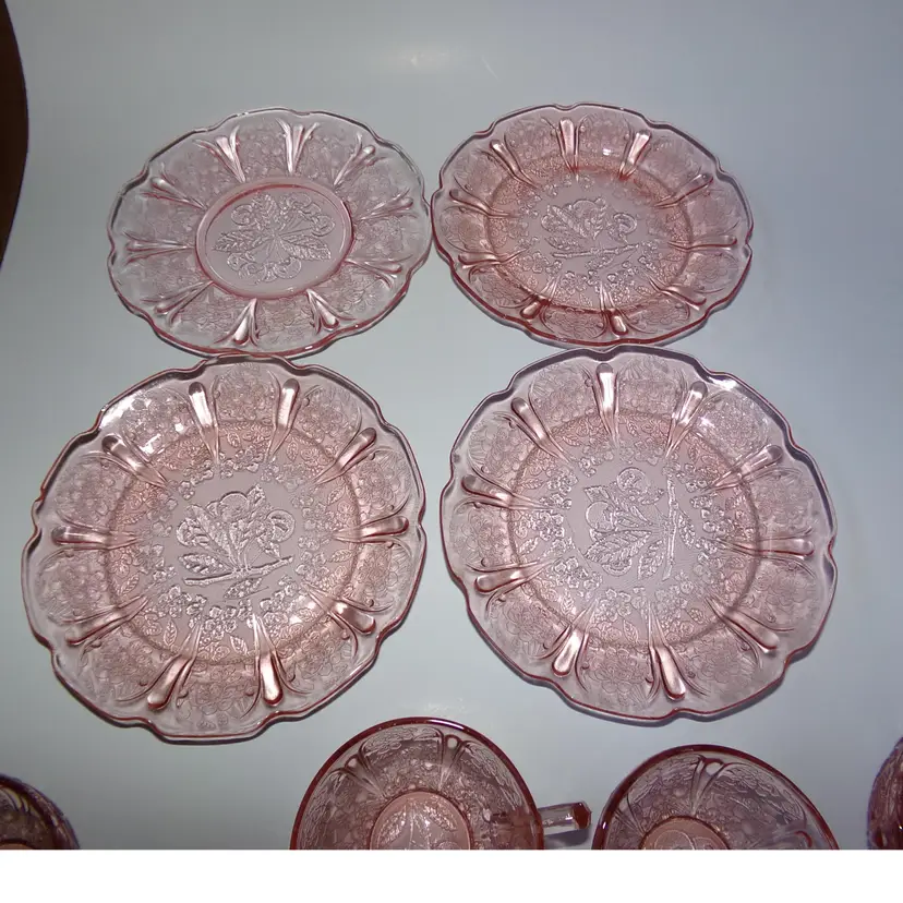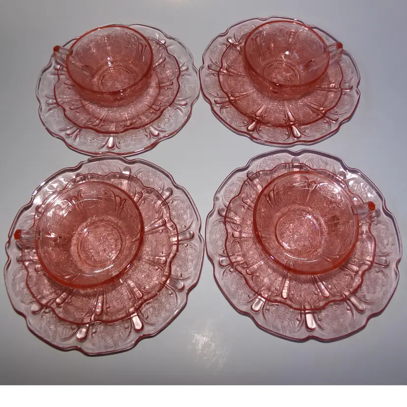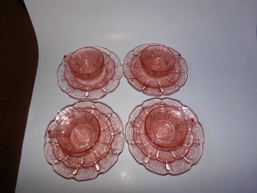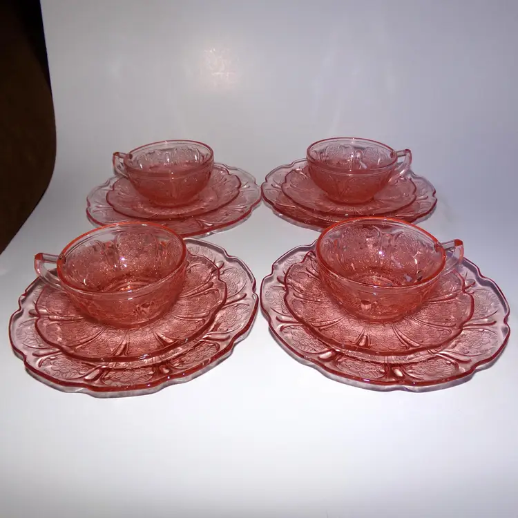 This is a gorgeous and HTF, vintage #Jeannette Glass 12 Pc. Cherry Blossom Junior #Dinner Set, circa 1930s! It is the real deal and not a repro!! Measurements: 4 Dinner Plates: 5 7/8" dia. each. 4 Saucers: 4.5" dia. each. 4 Cups: 1.5" high, each. It is all in great condition-there is just one plate with 2 small time-smoothed chips. Please see all pics, as they are part of the description.