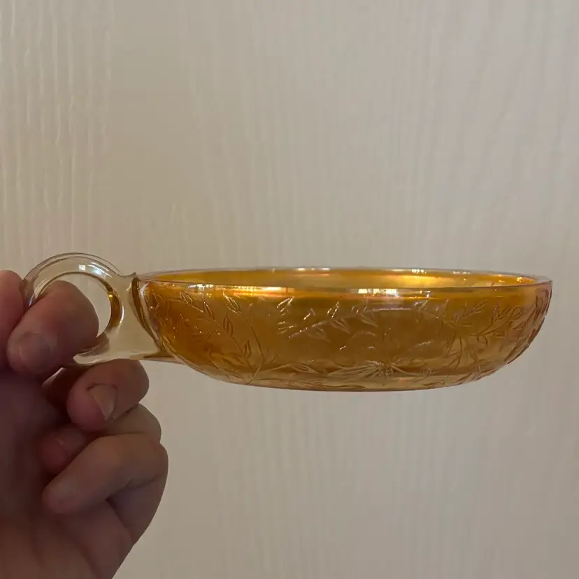 1”tall x 6 1/4” across including handle Vintage wear & patina as shown- some scratching inside