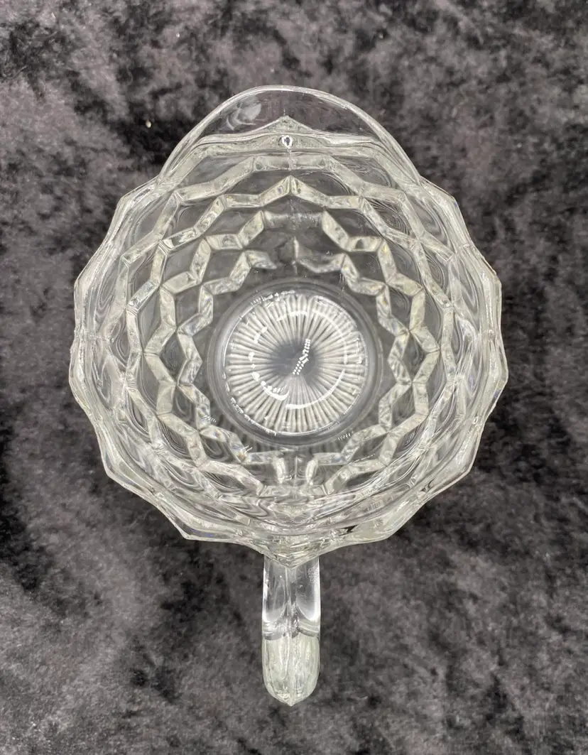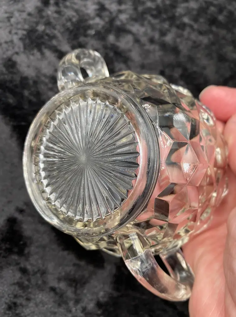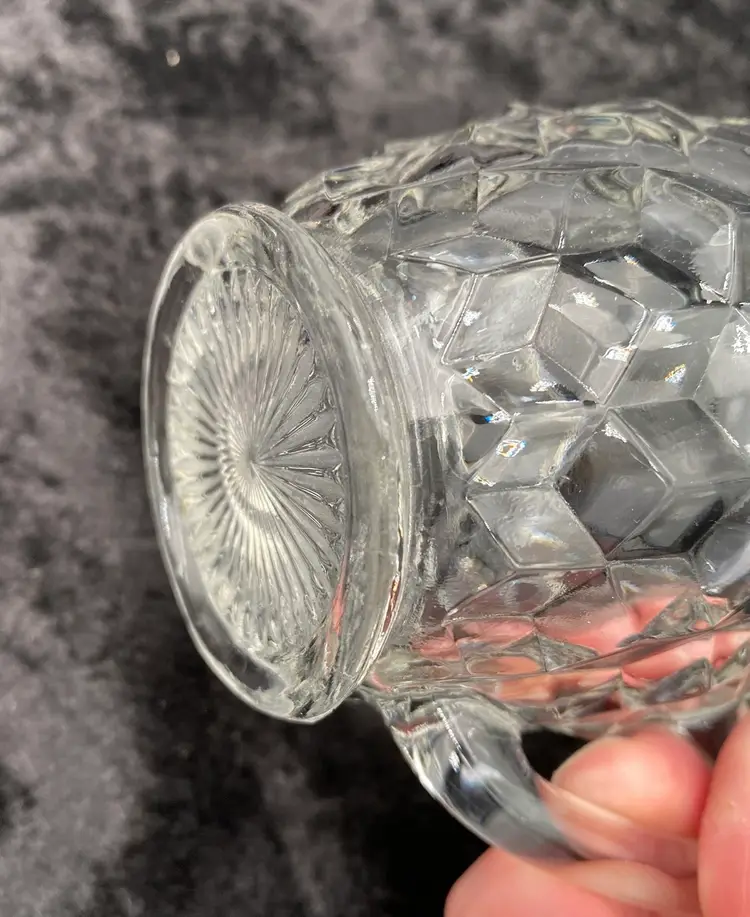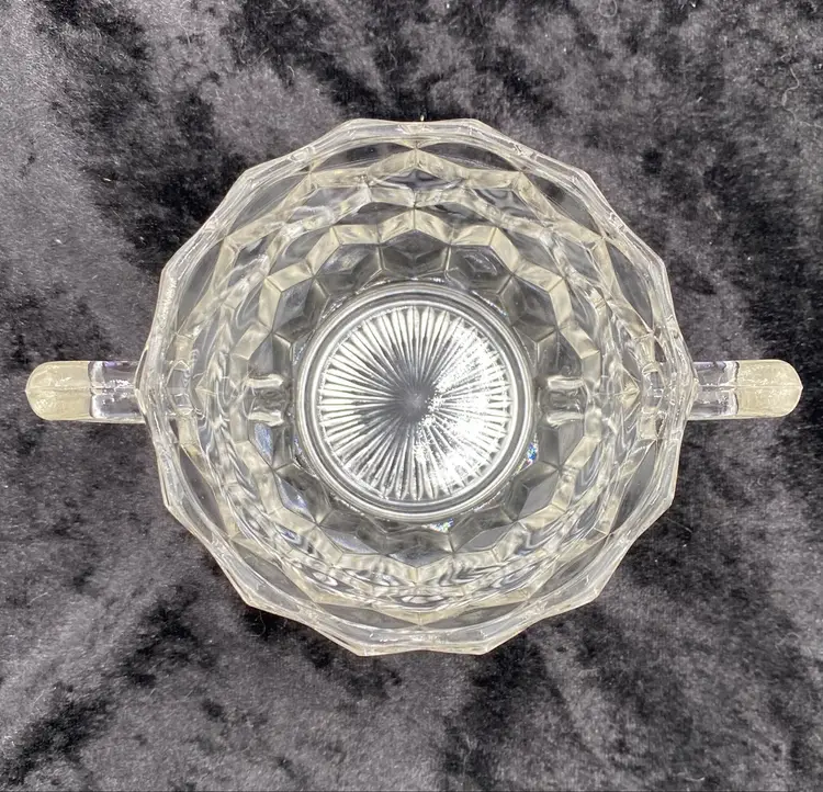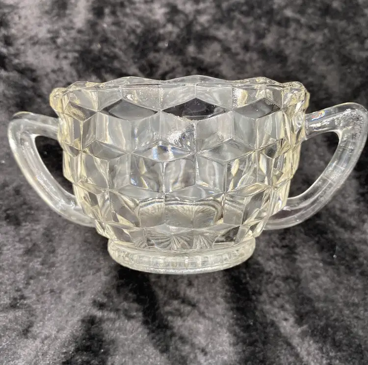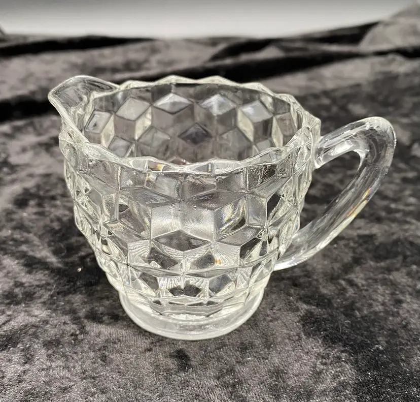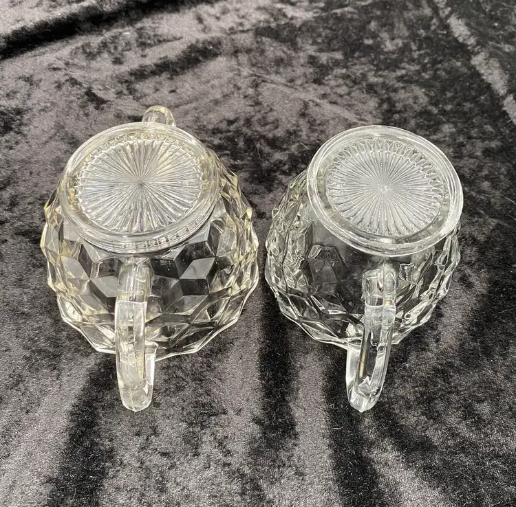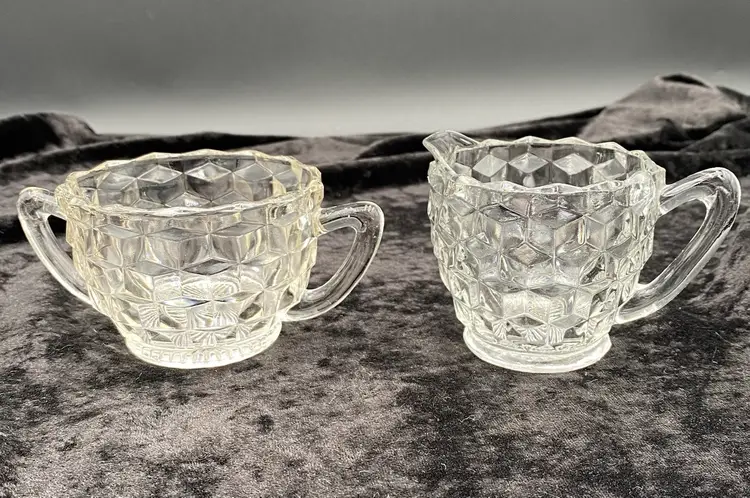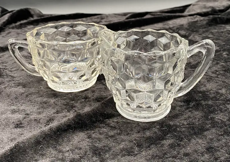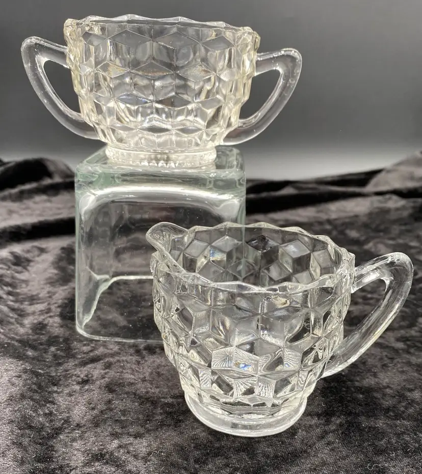 This creamer and sugar set is nearly antique! The Jeannette Glass company produced the Clear Cube (also known as Cubist) pattern from 1929-1933, during the early Great Depression. The glossy finish on the pressed glass gleams subtly, adding a touch of elegance to your serveware collection. Proudly made in Jeannette, Pennsylvania in the United States, this original duo from 1931 is a testament to the artisanal craftsmanship of the period. Each piece showcases the timeless beauty of the pattern, bringing a sense of nostalgia to any occasion.