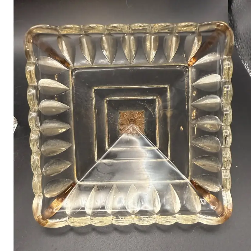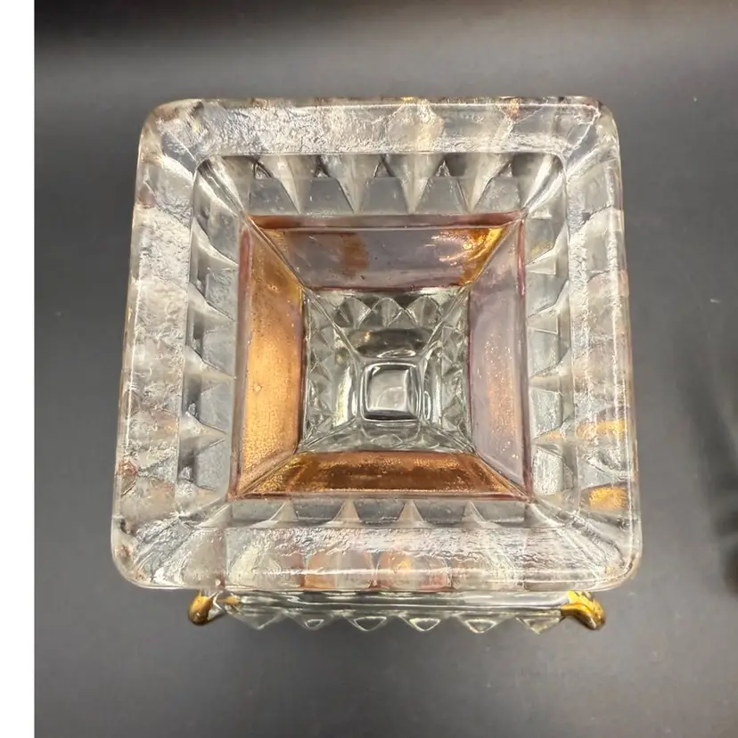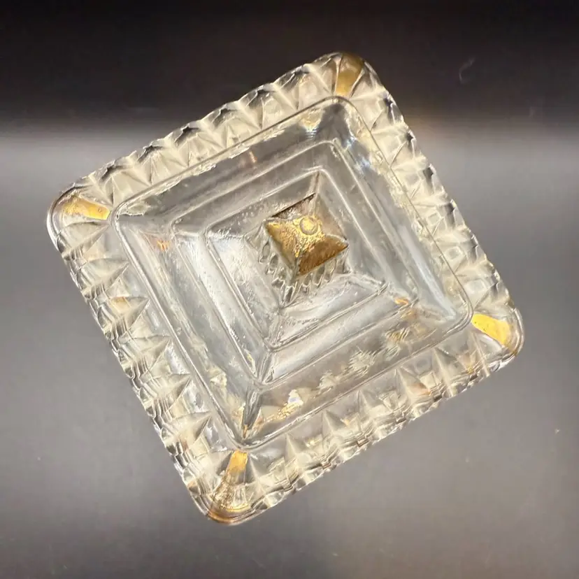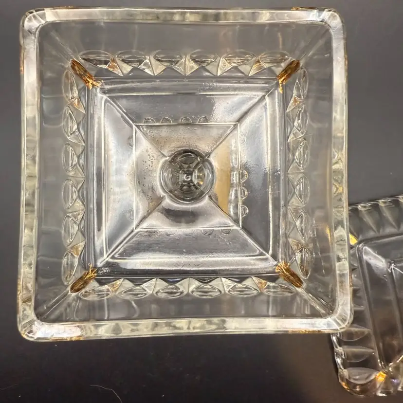 The Jeannette Glass "Wedding Box" pattern, produced in the mid-20th century, is characterized by its clear glass, square shape, and gold trim, often used for candy dishes or compotes. These pieces were popular as wedding gifts and for special occasions, adding a touch of elegance to any table setting. The gold accents and intricate glasswork reflect the design aesthetics of the mid-century era.