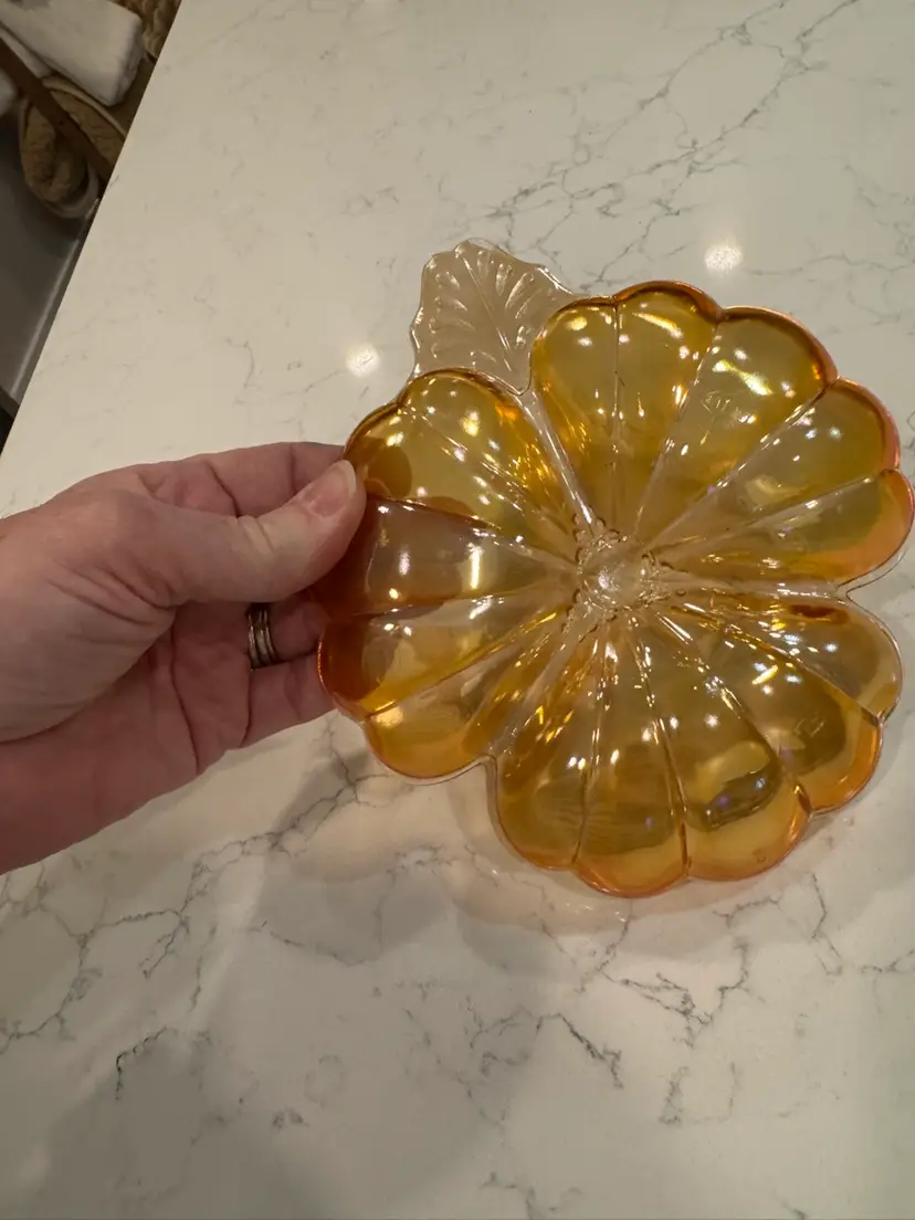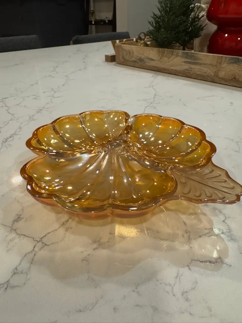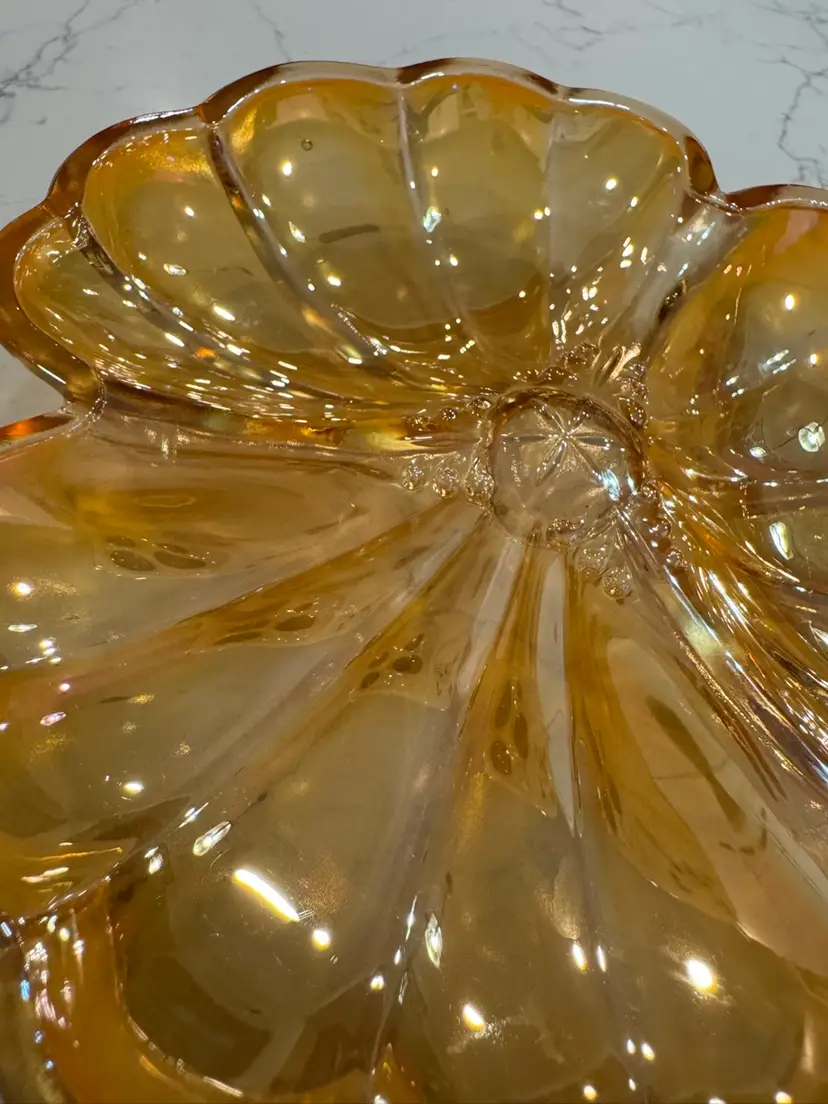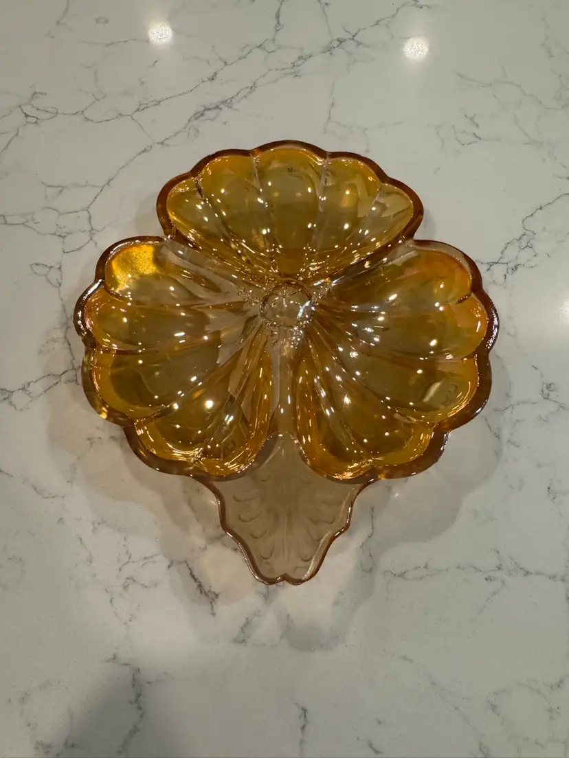 This beautiful piece features a radiant marigold finish, showcasing iridescent hues that glimmer in the light. The clover leaf design is divided into three sections, making it ideal for serving candies, nuts, or small trinkets. An excellent example of classic carnival glass craftsmanship, this dish is a collectible item that brings a unique vintage aesthetic. No chips or cracks.