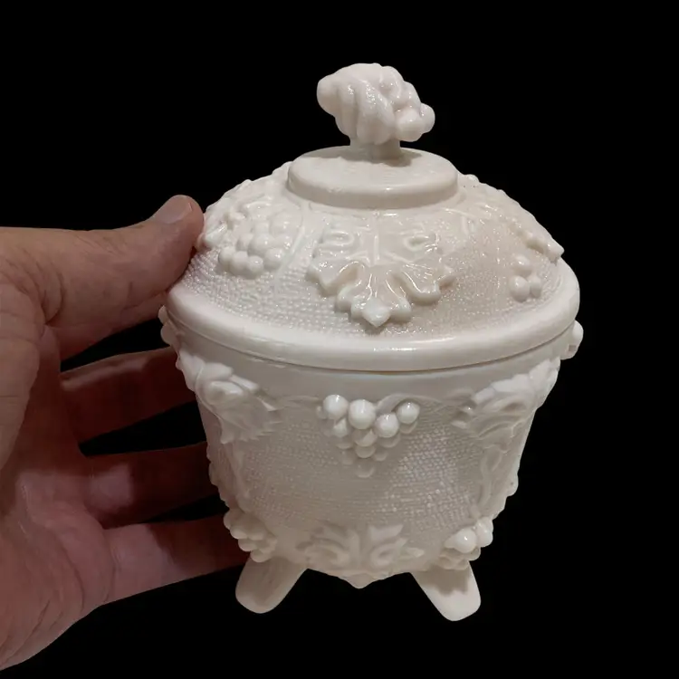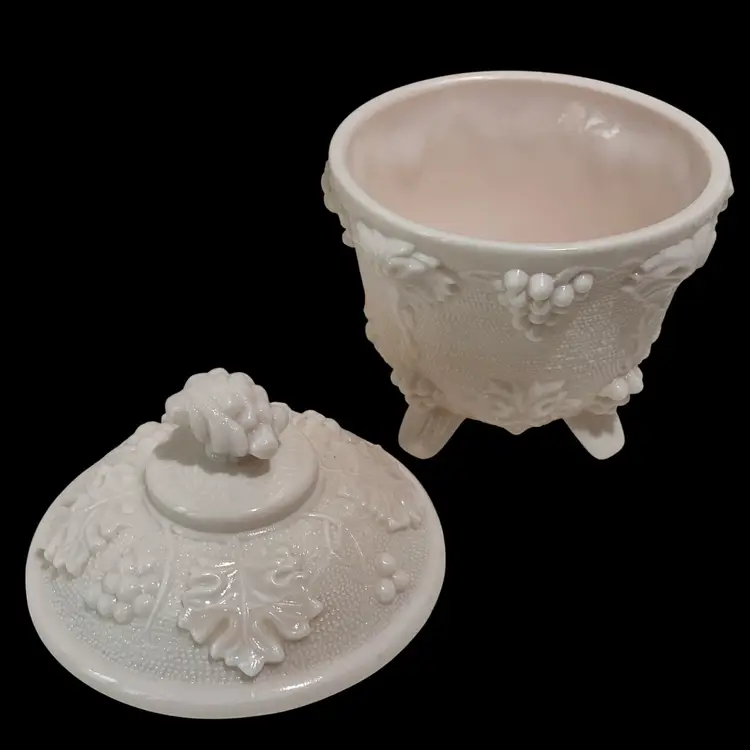 Vintage Jeannette Shell Pink Milk Glass Footed Candy Dish W/ Lid 6” Tall. Used pre owned no chips or cracks. Thanks and enjoy…