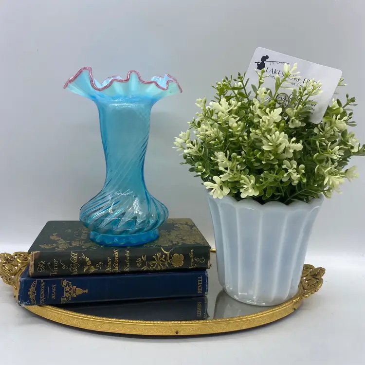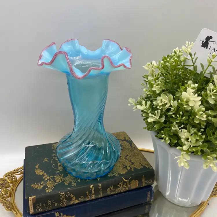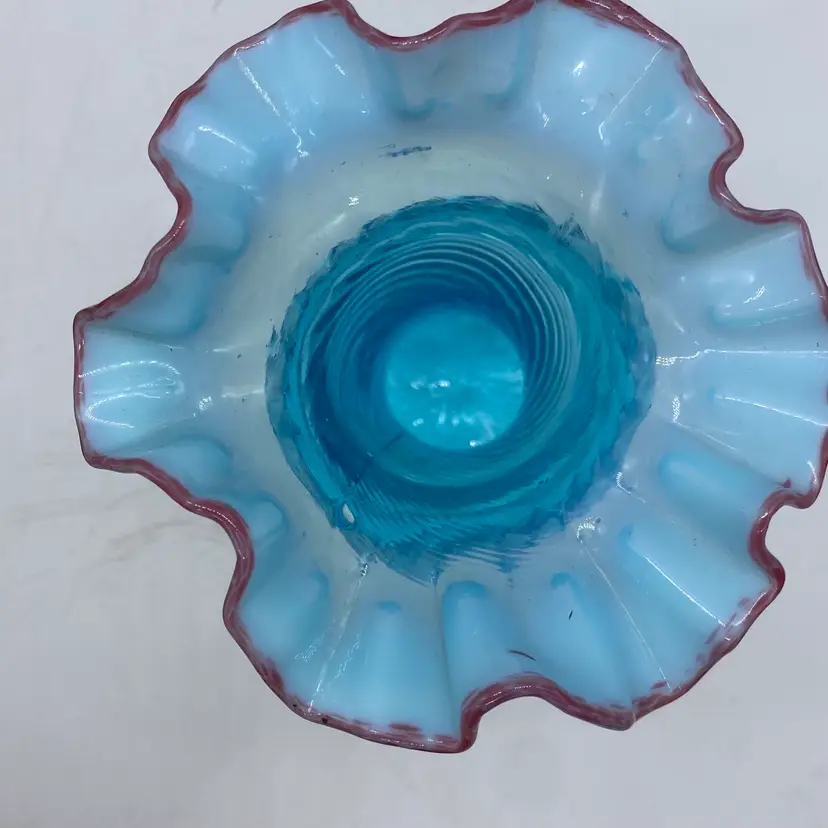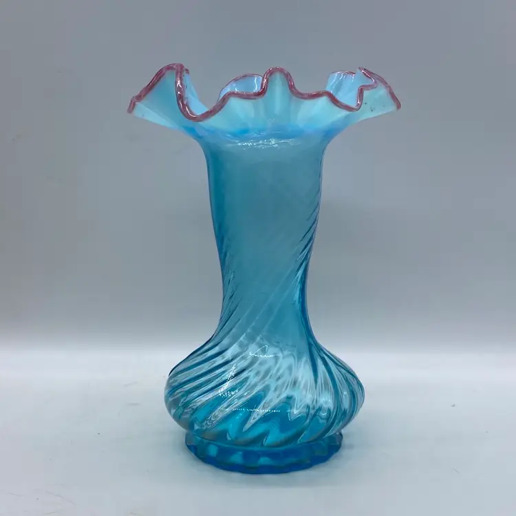 This beautiful vintage vase by Jefferson Glass features a mesmerizing swirl pattern in opalescent blue glass with a cranberry rim.