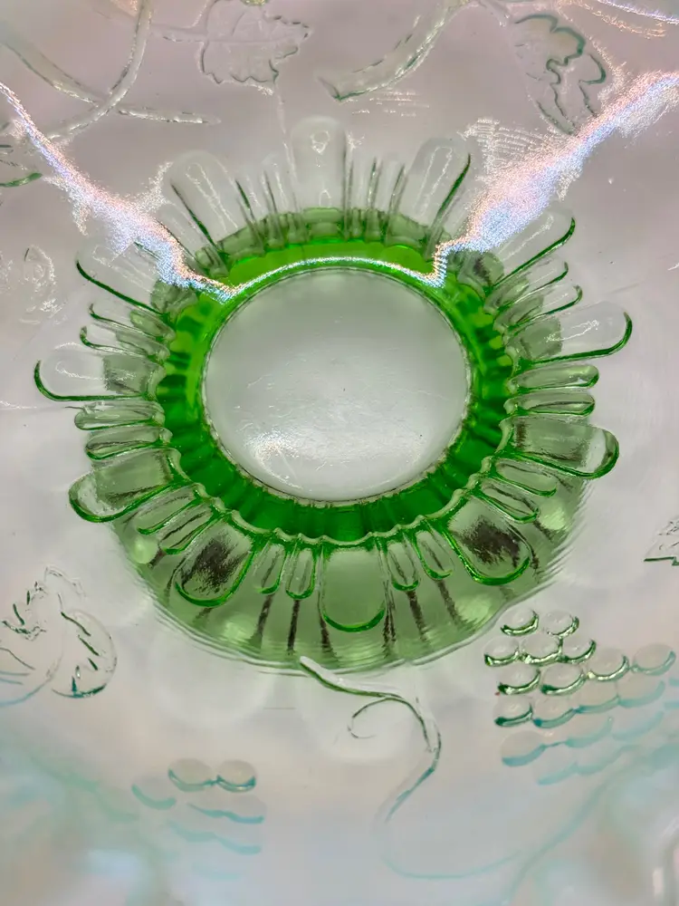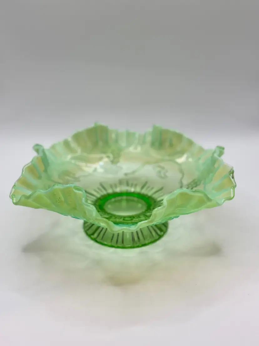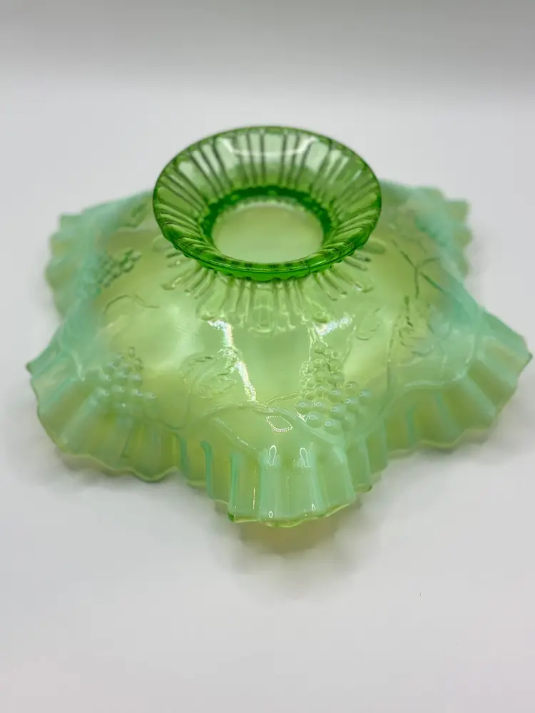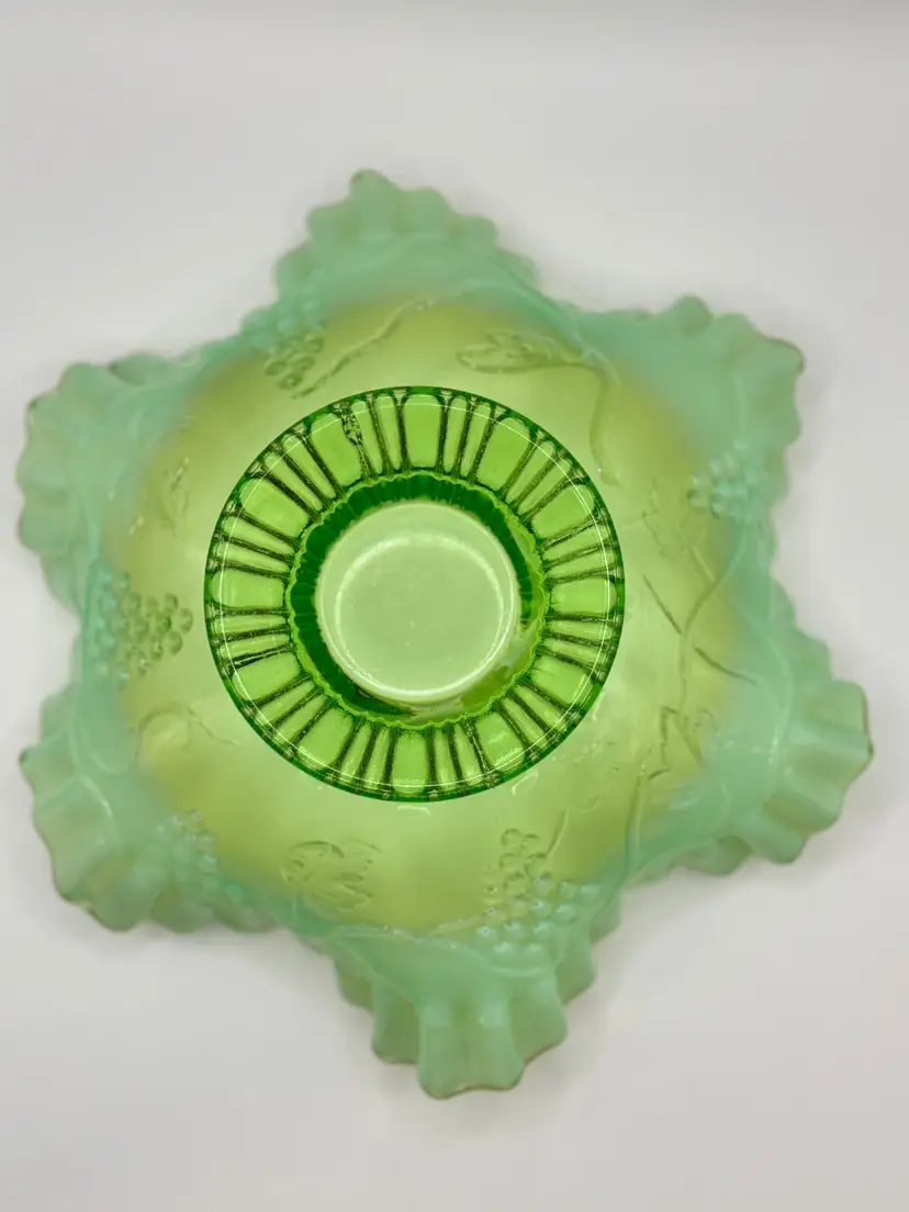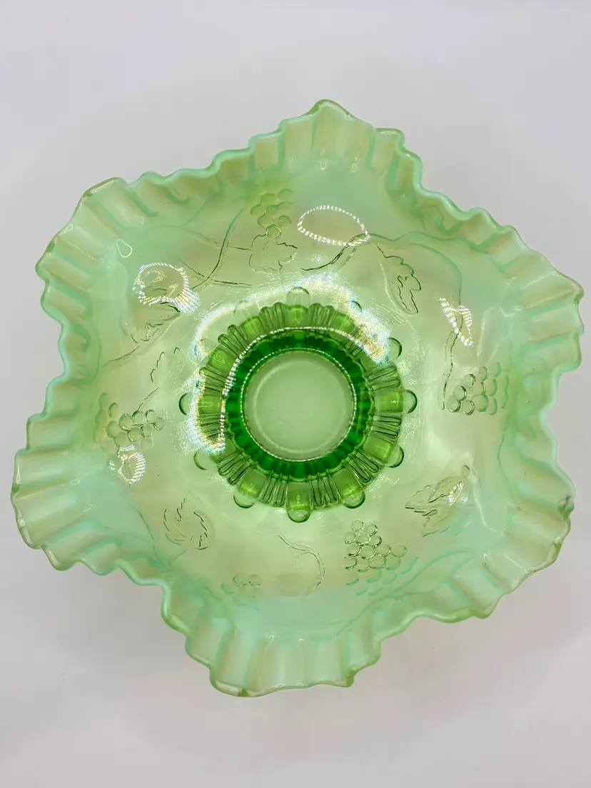 Vintage Northwood green opalescent glass footed ruffle bowl grape pattern, made in USA. Very beautiful, perfect for any occasion or room. No chips or cracks. Measures 8x3. Weighs 1lb.