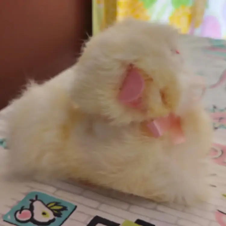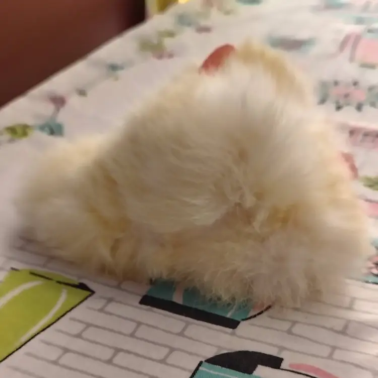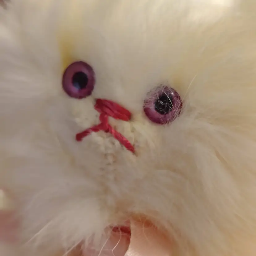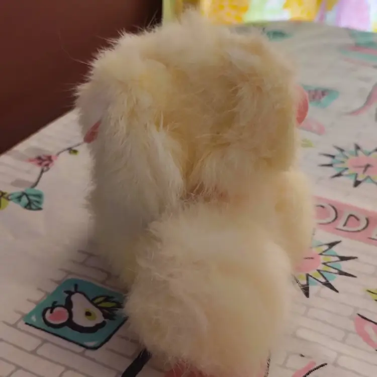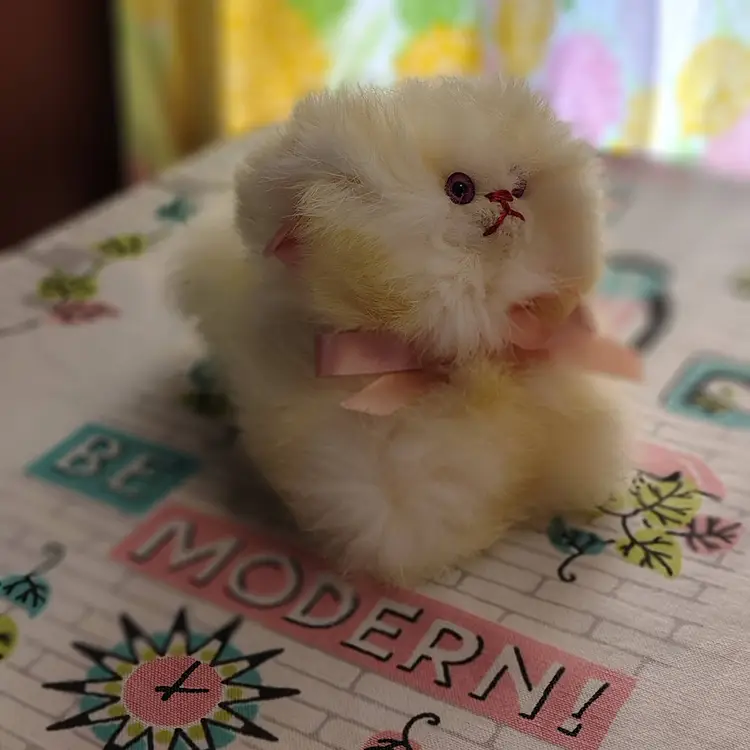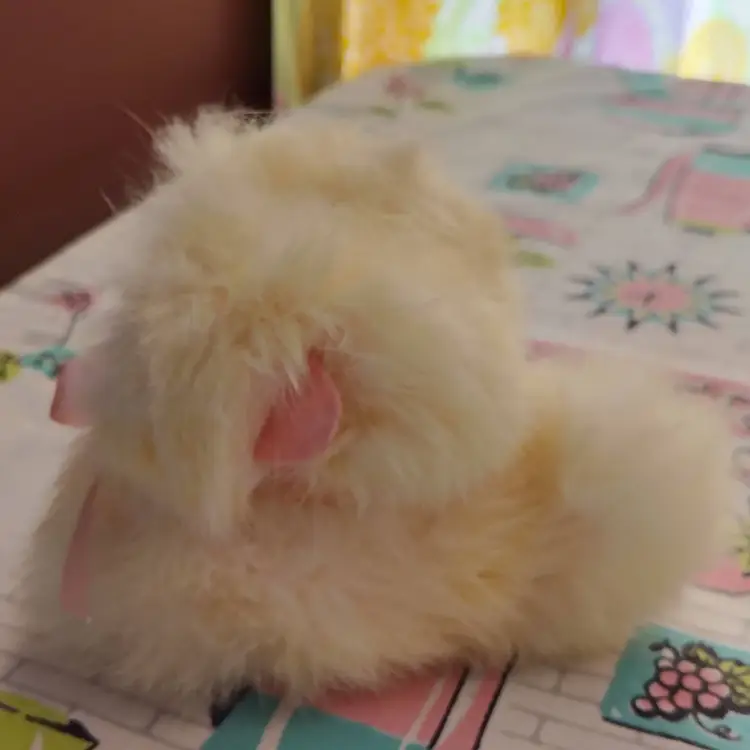This is a vintage toy kitten that is supremely fluffy! Made in USA during the 1950s for Jerry Elsner's "Jerry Pets" line, this sweet lil kitty was hand sewn from dyed rabbit pelts. She has some gorgeous purple glass eyes hiding in her pastel yellow fur, and soft pink felt ears as well. She is SO SOFT! Condition: She is in Very Good shape! She has no tears, repairs or any serious fur loss. I have petted her quite a bit and I think only a single hair was shed. Her stitching, ears and original ribbon are all still a lovely pink. I do think that her fur may have been just a bit brighter yellow when she was new, but she was never a screaming yellow! She was obviously treasured and well kept by her previous owners! Size: She is the 6" size, measured from face to tail. She measures about 3" across, and lays 4" tall, give or take a little on account of fluff!