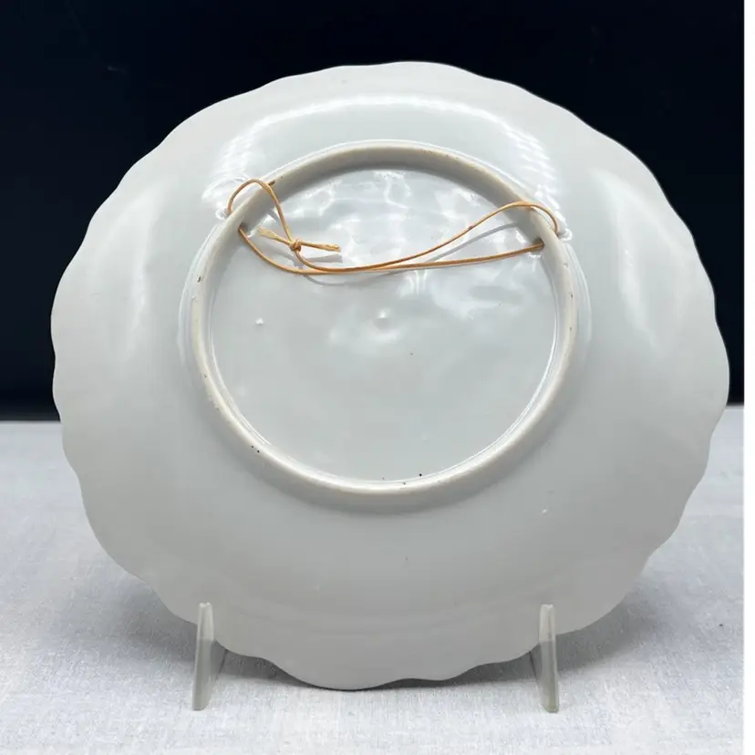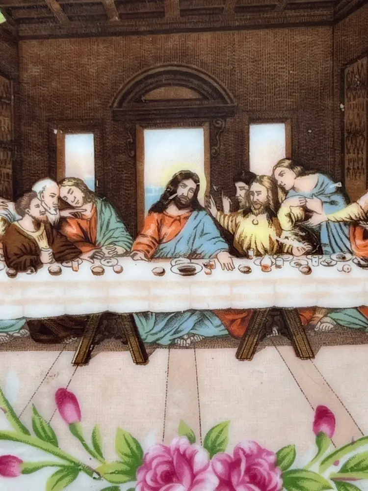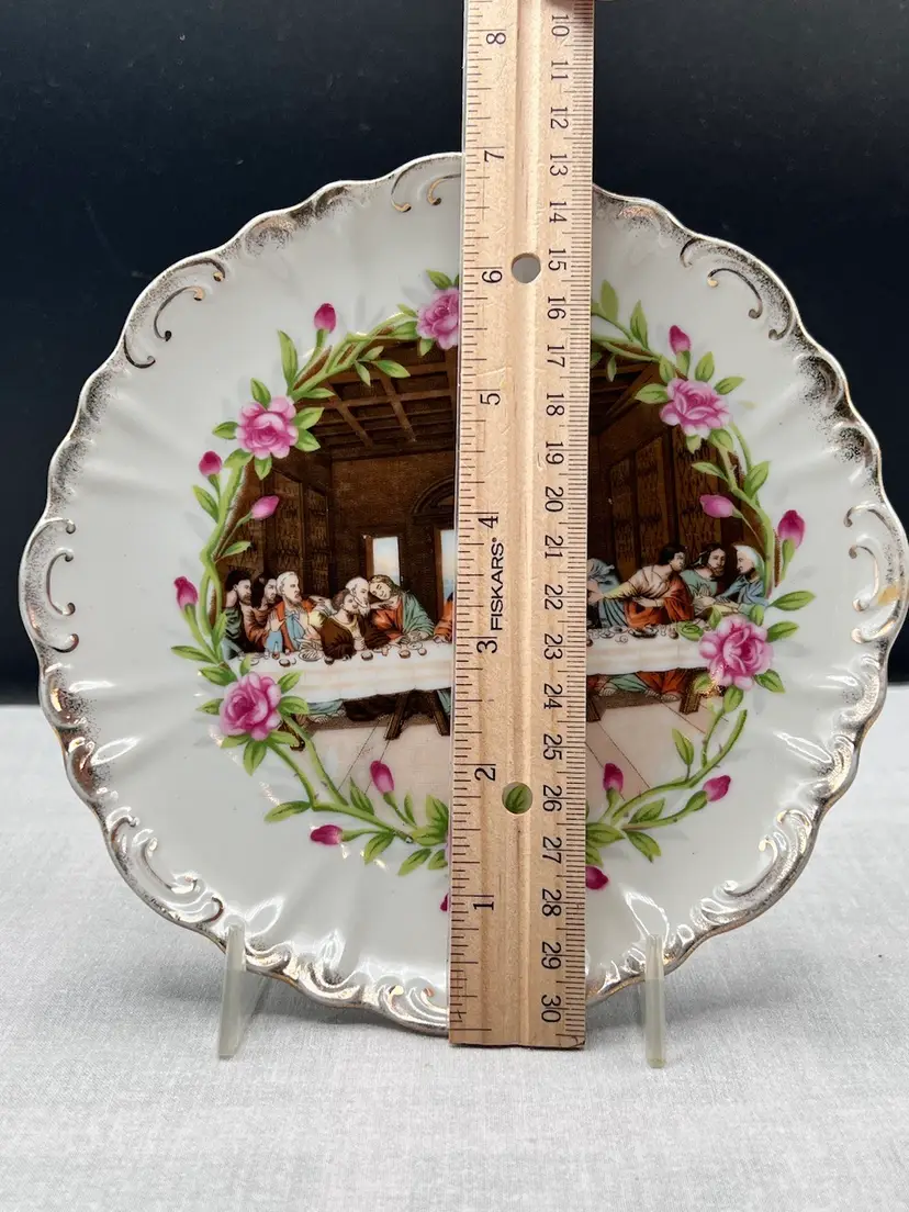Beautiful vintage display/collector plate with ruffled edge and 18k gold applied around rim Picture of Jesus and the Last Supper surrounded by pink roses/flowers No chips, cracks or crazing, there are a few surface scratches, see pictures for details Measures 7” in diameter Not makers mark, possibly Japanese import