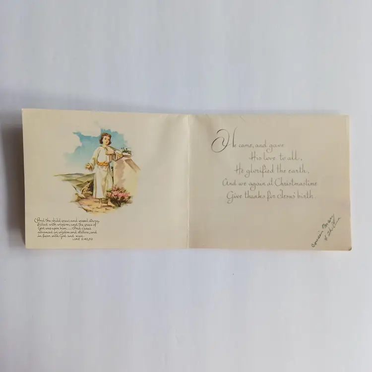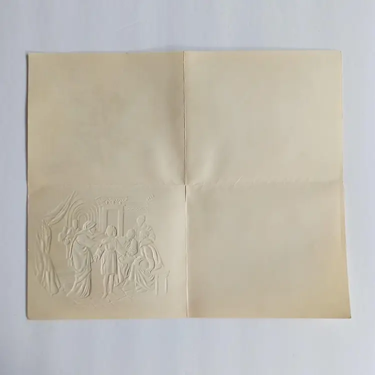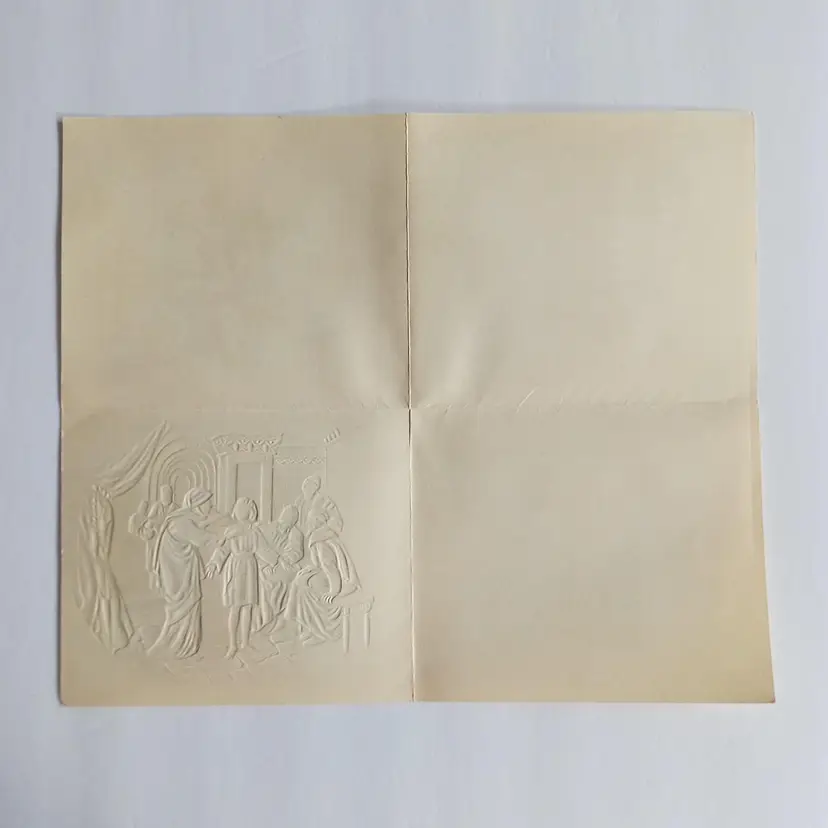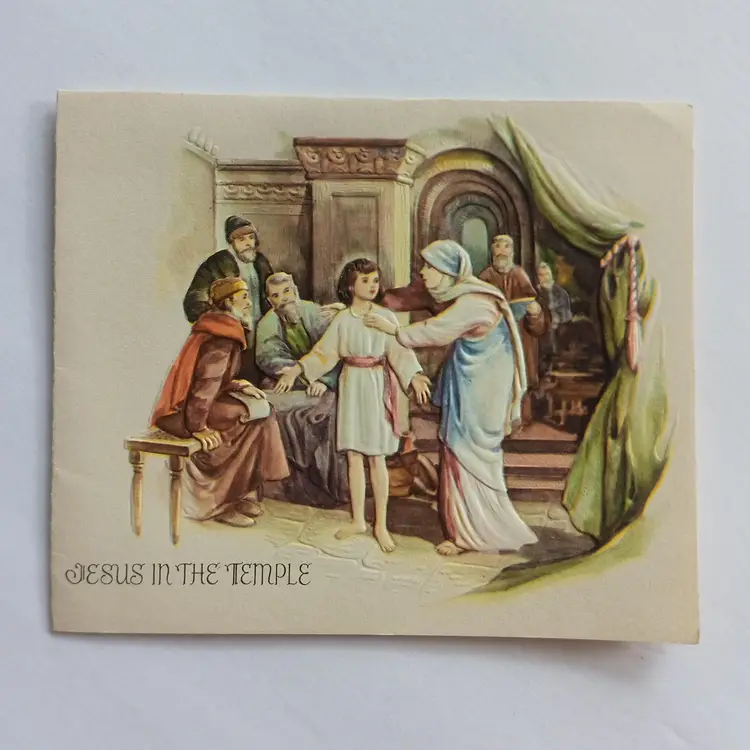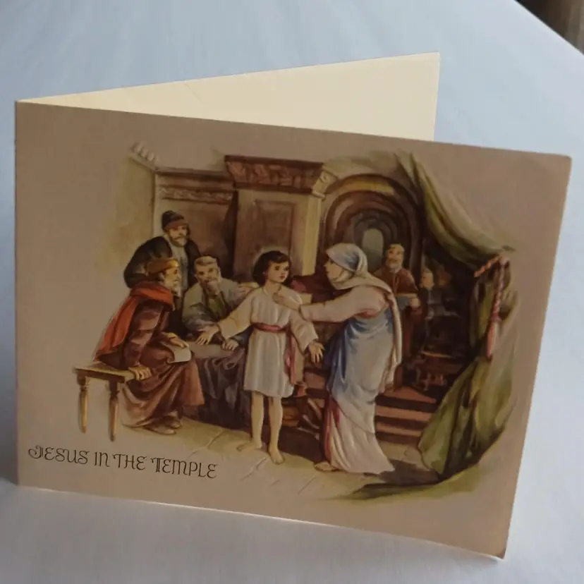 This vintage Christmas greeting card features an embossed image of Jesus in the temple, beautifully lithographed with raised details. Measuring 5 3/4 inches in width and 4 3/4 inches in height, this collectible card was made in Canada and adds a unique touch to any holiday celebration. With its multi-coloured design and nostalgic charm, this handmade card is the perfect addition to any vintage greeting card collection. Bring a touch of history and tradition to your holiday season with this one-of-a-kind card.