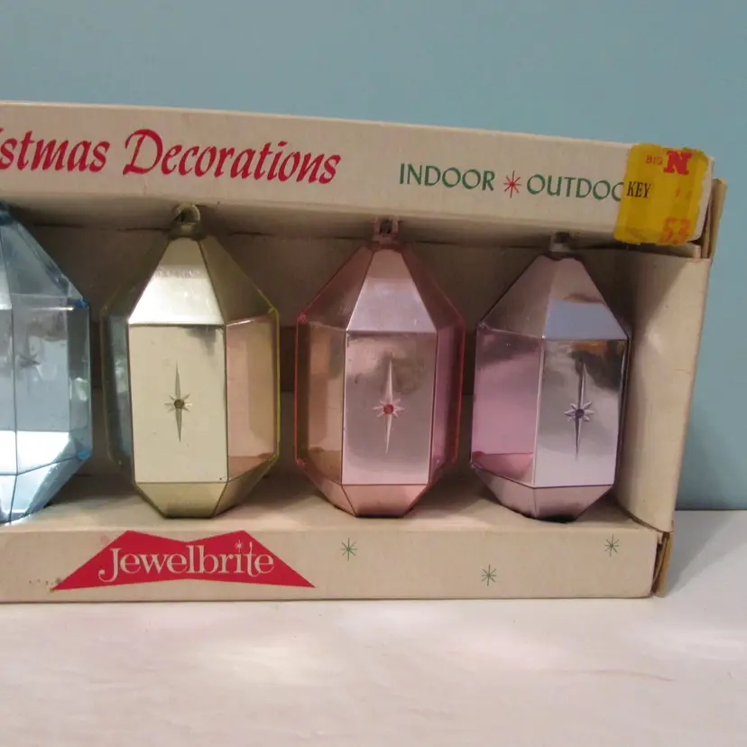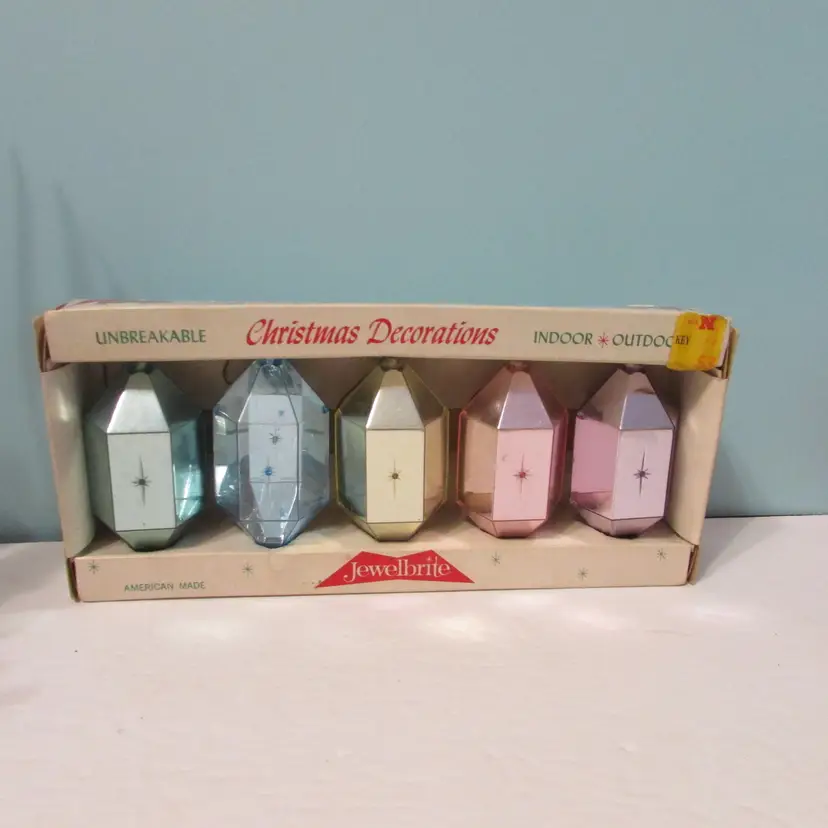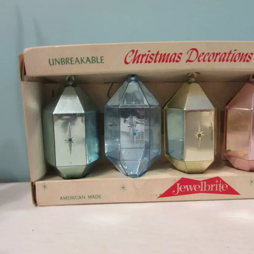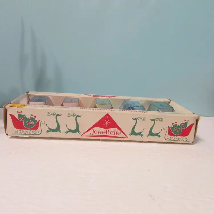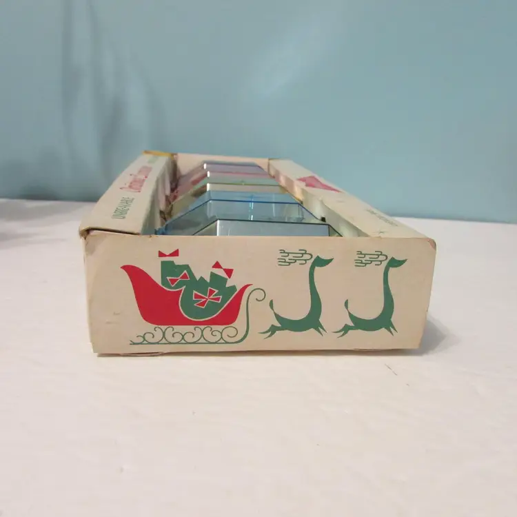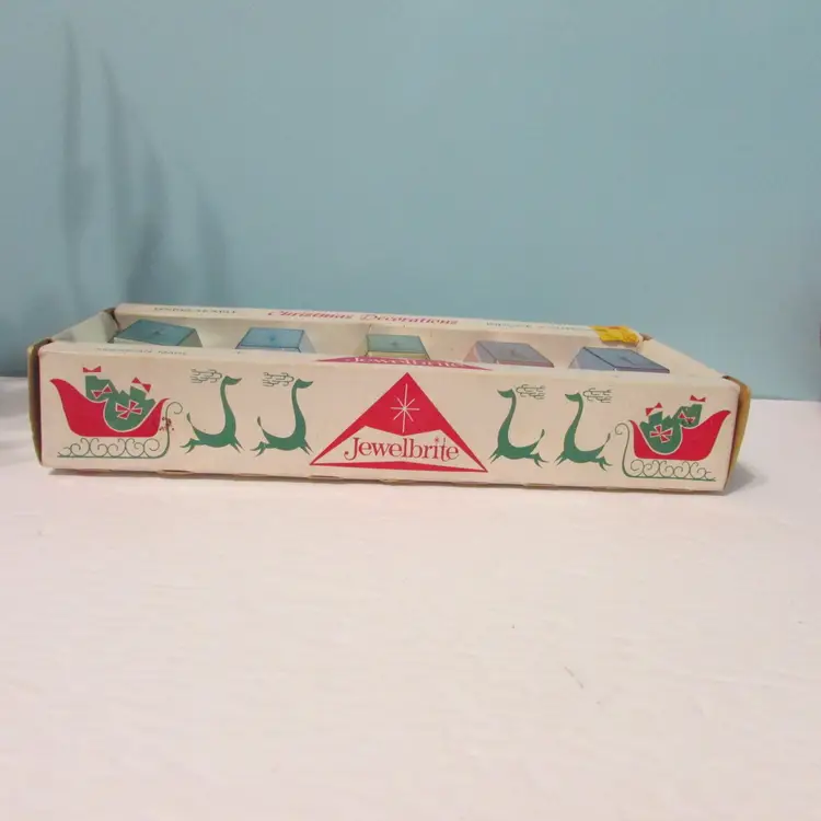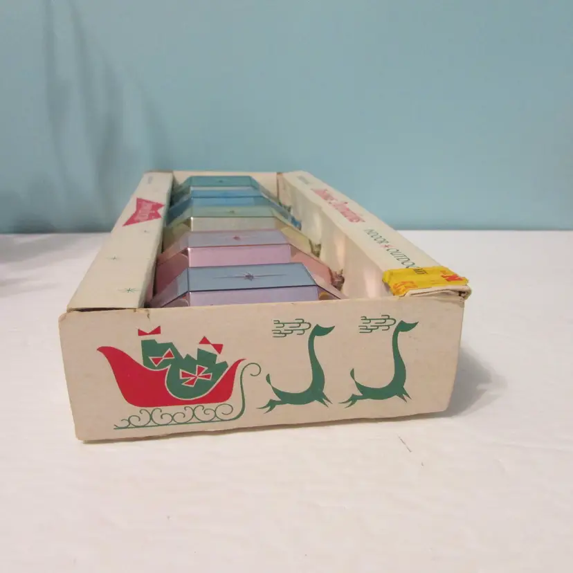 This lovely set has some wear, but still a nice set to display and the box is nice to display as well. The ornaments come out of the box early, they are not attached. The box is about 10" x 4 1/2" x 2". This is shipped from a smoke free home. Thanks for looking!