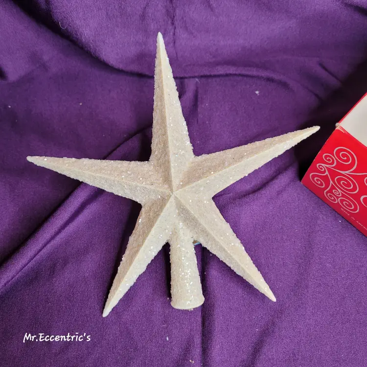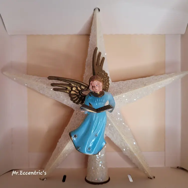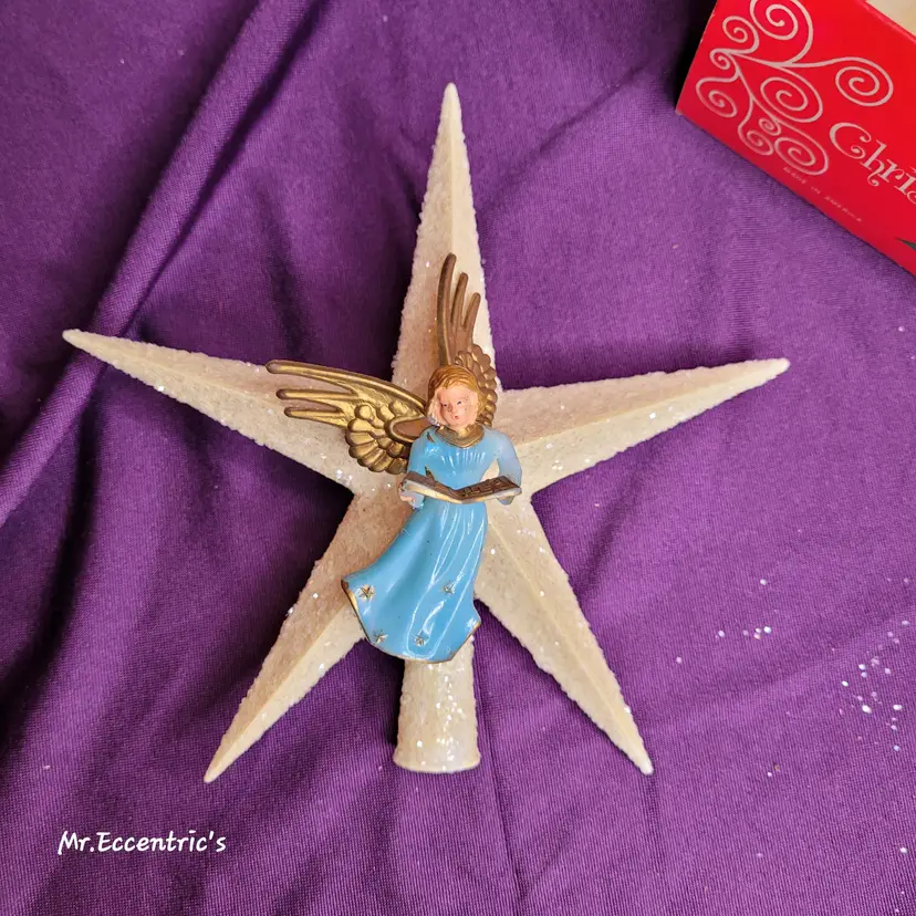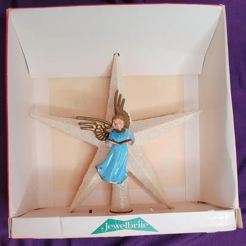 Add a heavenly touch to your holiday decor with this vintage Jewelbrite angel tree topper. Featuring a charming angel in a blue dress with golden wings, set against a sparkling star. Perfect for bringing a nostalgic vibe to your Christmas celebrations.