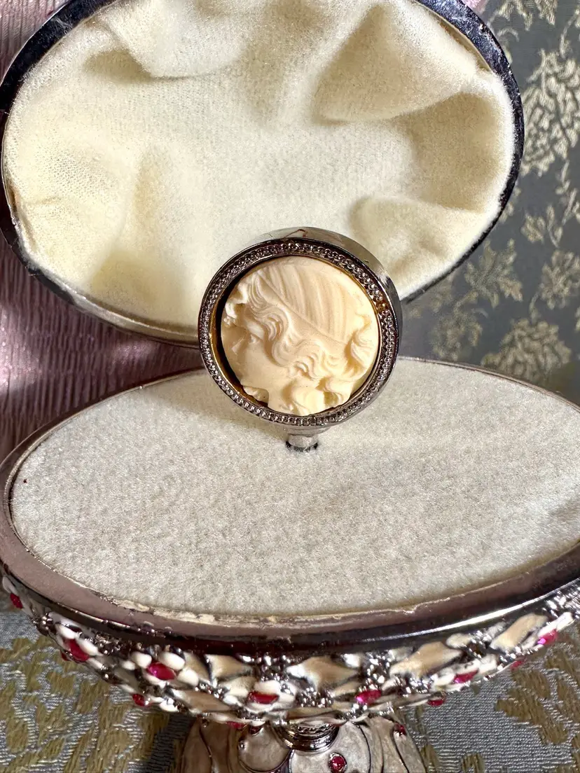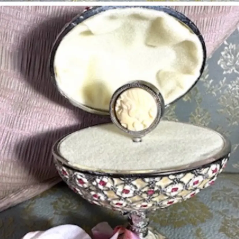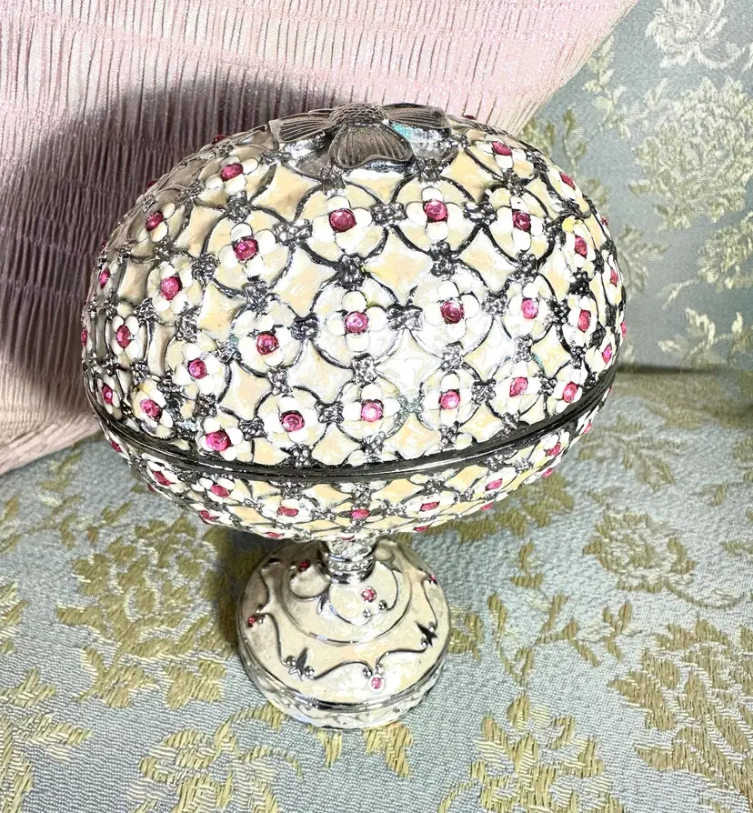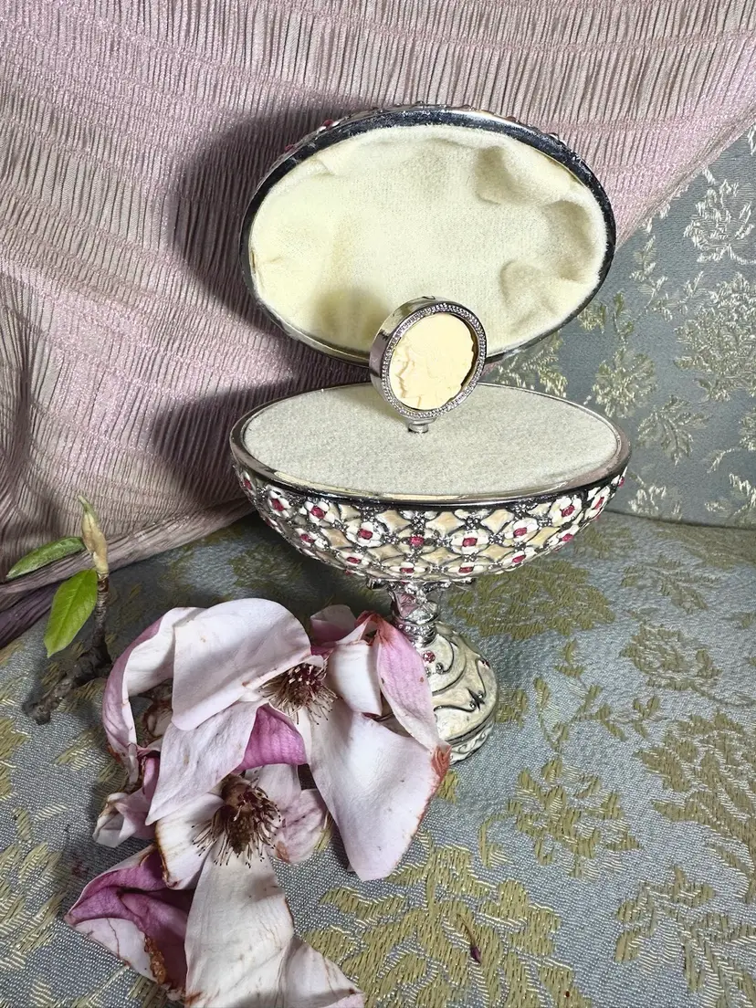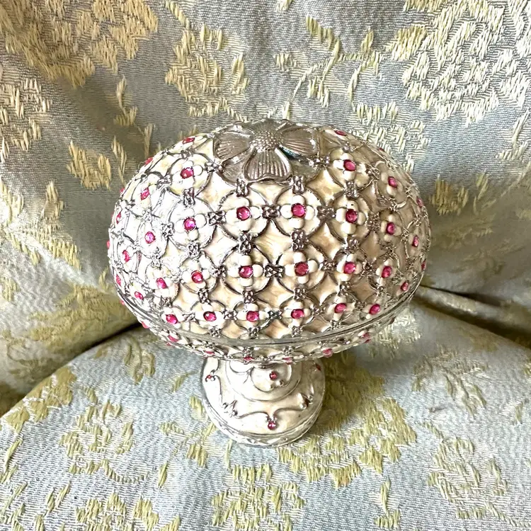 Crazy over the top egg shaped pedestal music treasure box for someone who likes sparkle and glitz and glamor Pink rhinestones set in silvery tone metal Out of this world No maker marks found Music box works not sure of tune🌸 1970s 6” tall 4 3/8” wide 2 pounds Enamel on metal Seems like inspired by Faberge eggs🌸