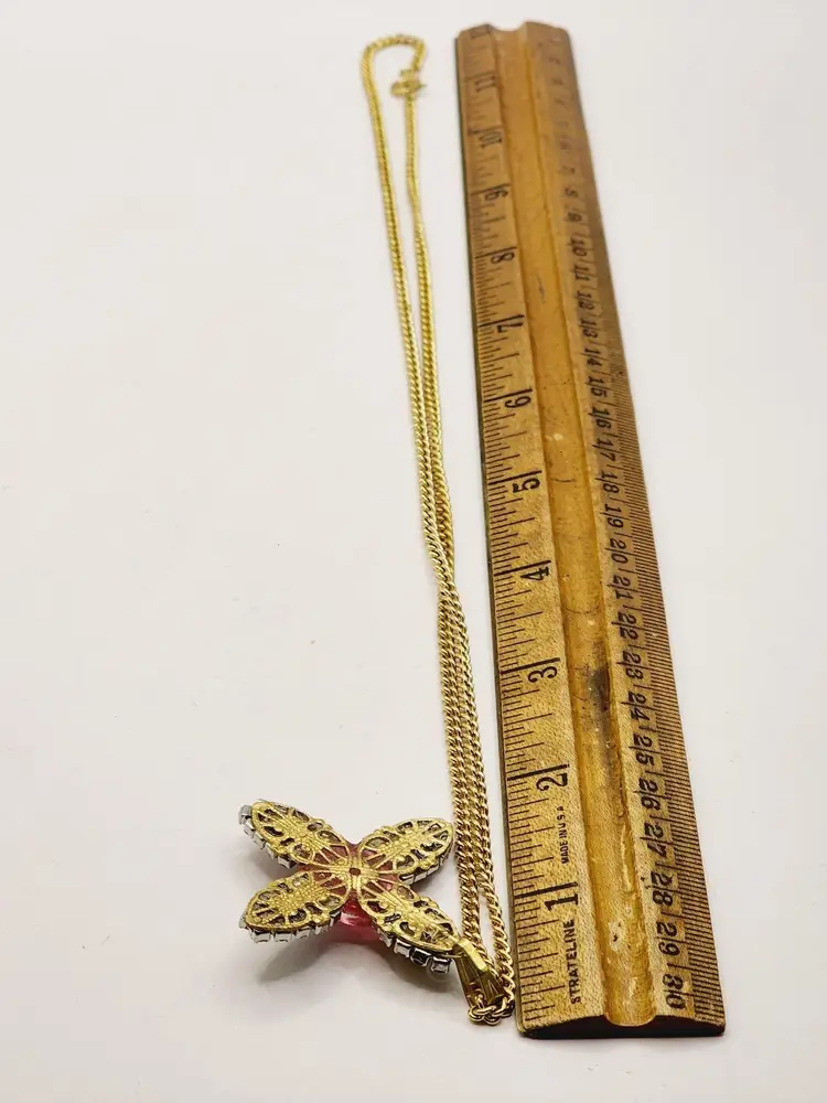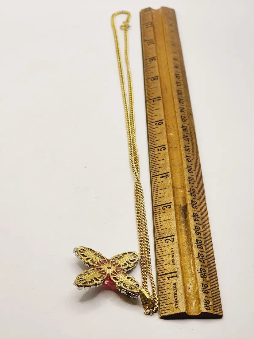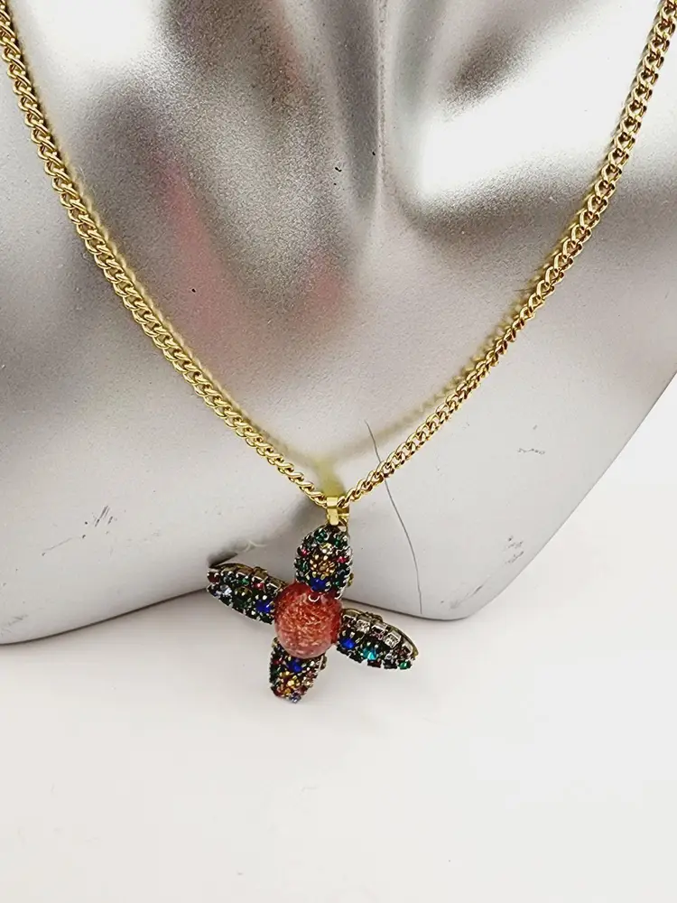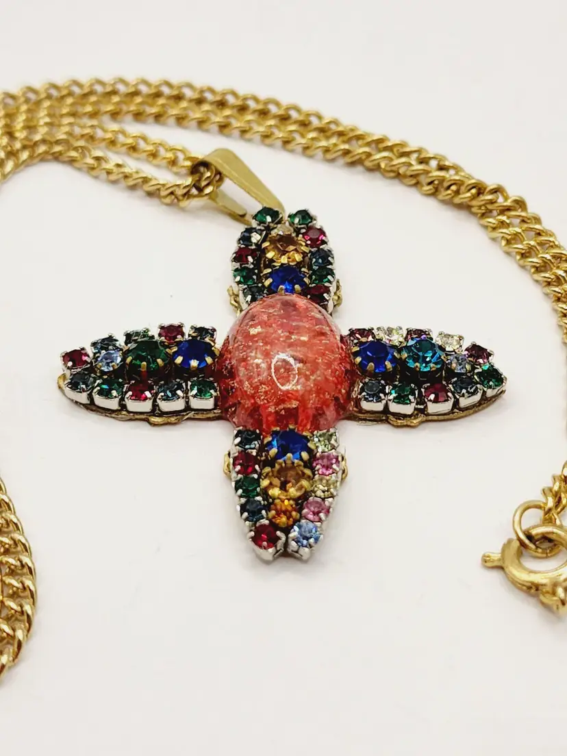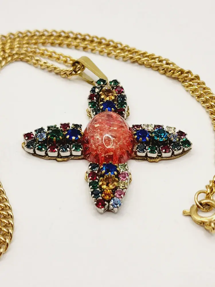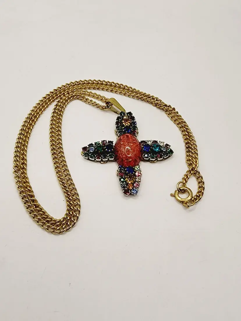 Stunning vintage necklace, gold plated chain with cross pendant that has an amazing center glass and adorned with multicolor sparkling rhinestones. All set in a filigree brass back. Spring ring closure works well. A beautiful addition to your vintage collection.
