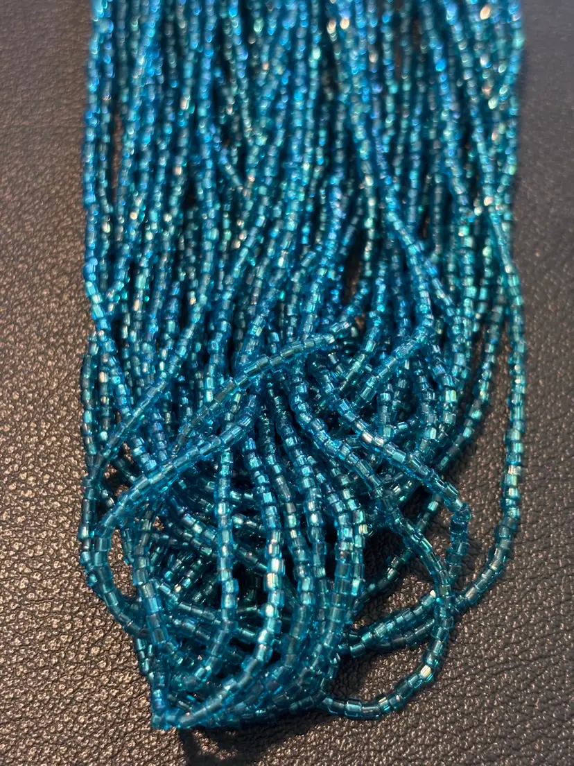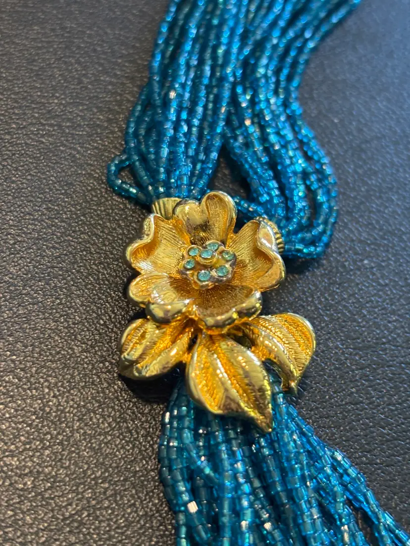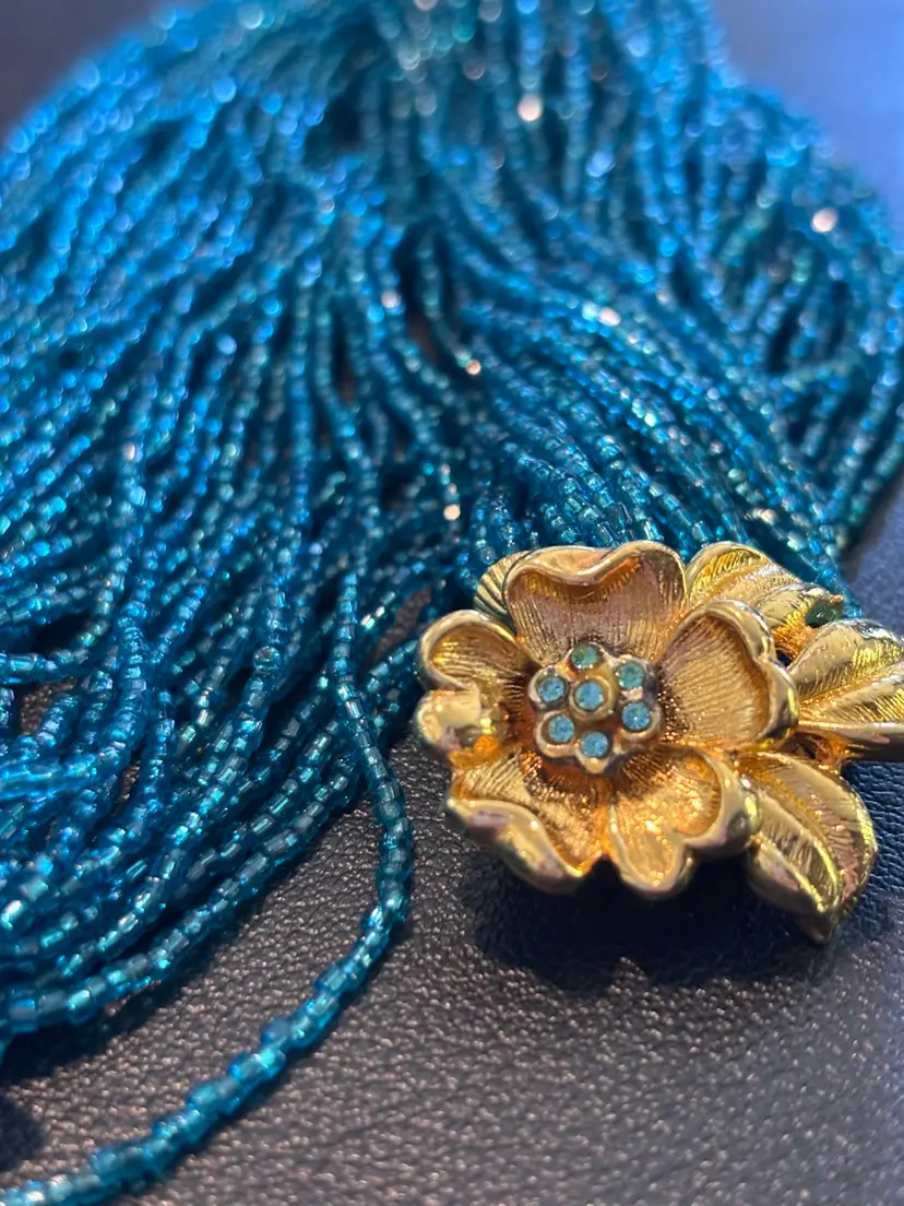 20” Blue glass seed bead necklace with gold toned flower clasp with blue rhinestones