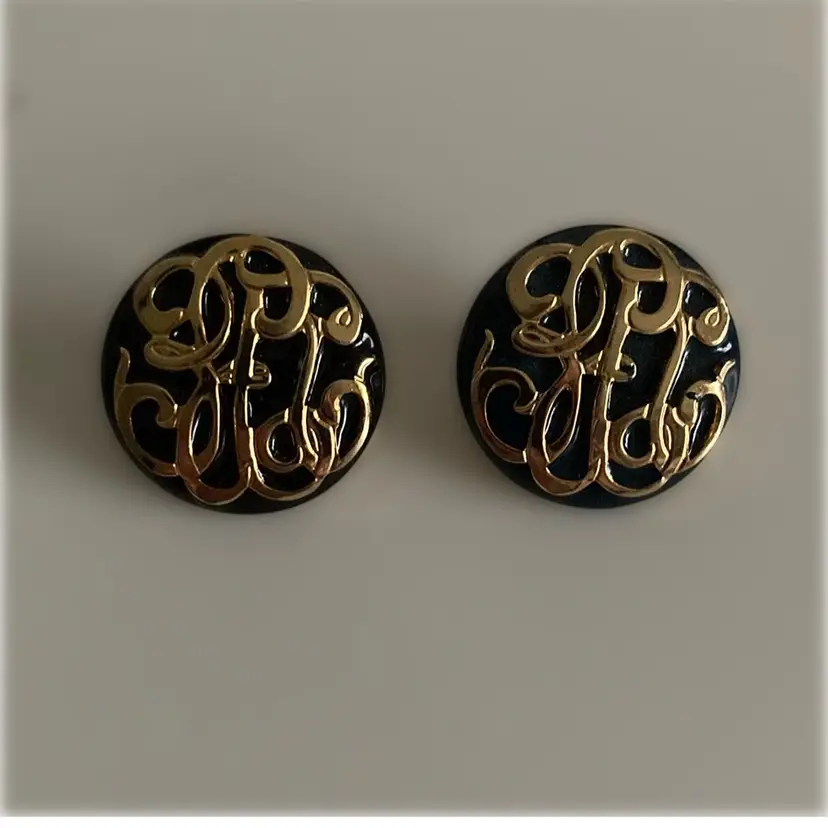 Vintage jewelry designer Ginnie Johansen gold over black monogram button earrings. They measure 1” across.