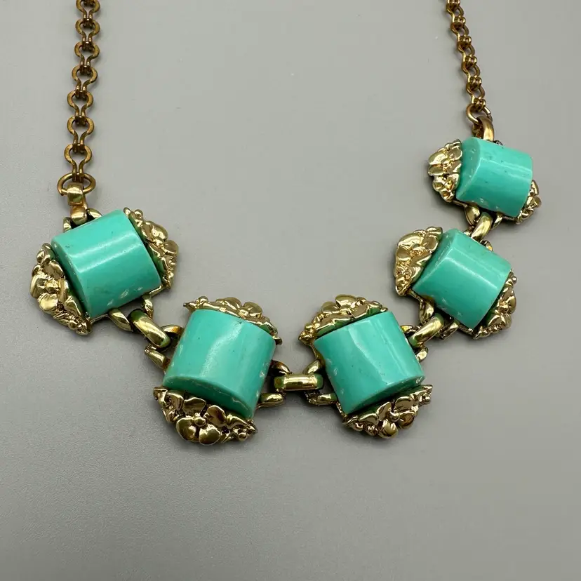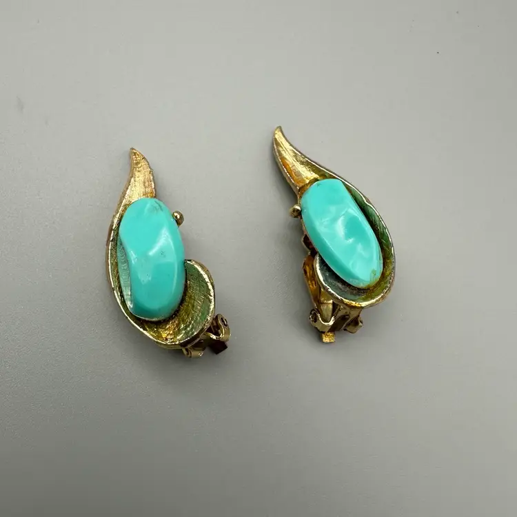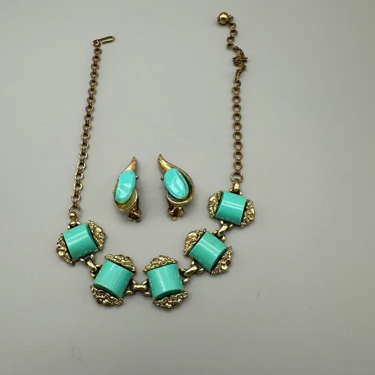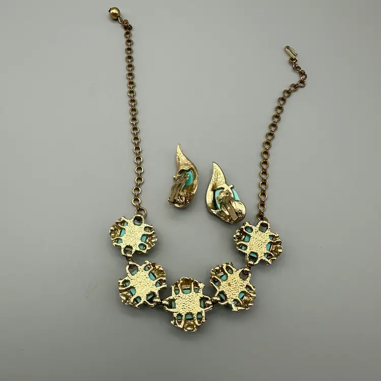Necklace measures approximately 14 inches. Clip on earrings measure approximately one and a half inches. Turquoise color beads and gold tone accents. No makers mark.