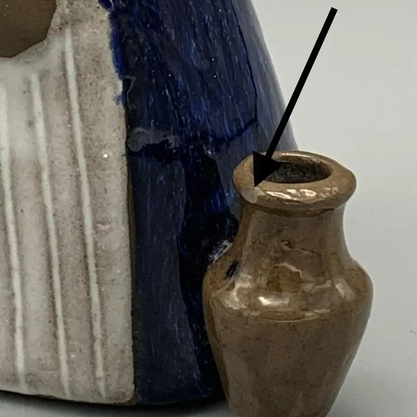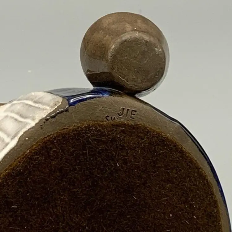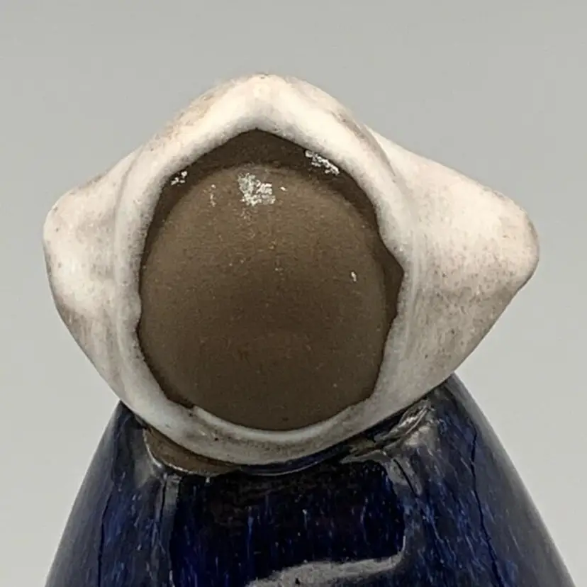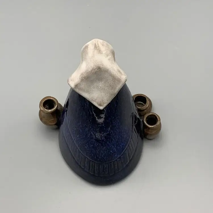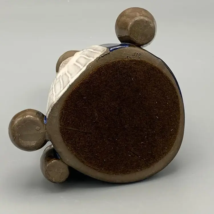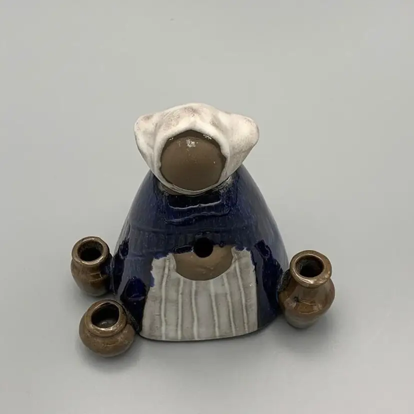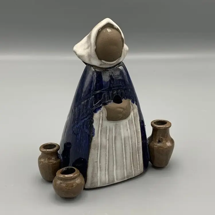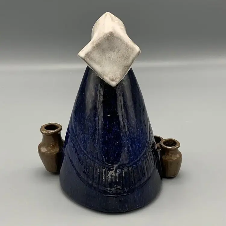 Handpainted & Glazed: Blue speckled fringed shawl & dress White kerchief & apron 3 brown ceramic containers attached to her sides Brown Felt on the bottom