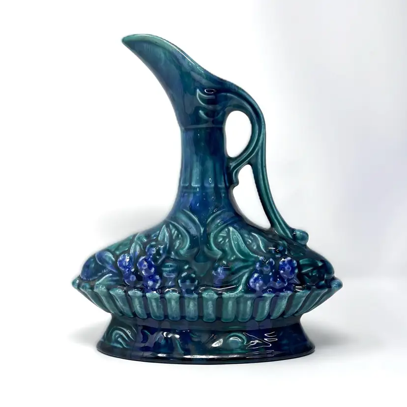 This decanter, titled "156 months Old Bot. 1962" is the indigo and turquoise majolica-style release and features the floral basket design without the gold leaf.