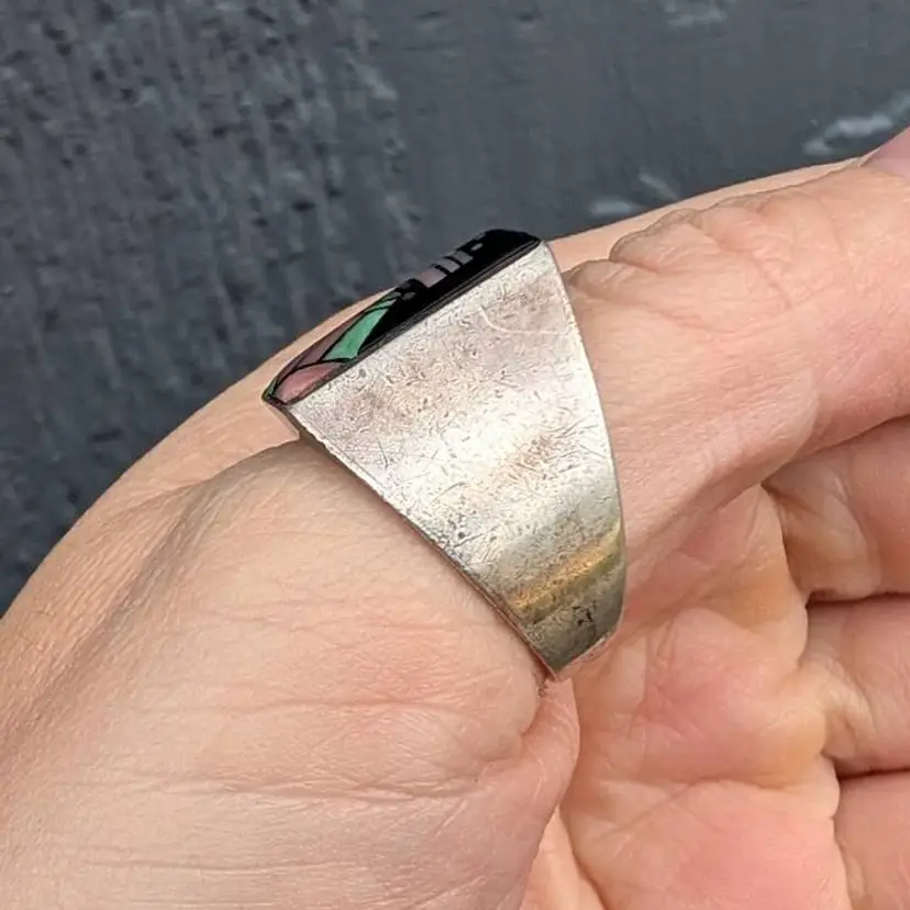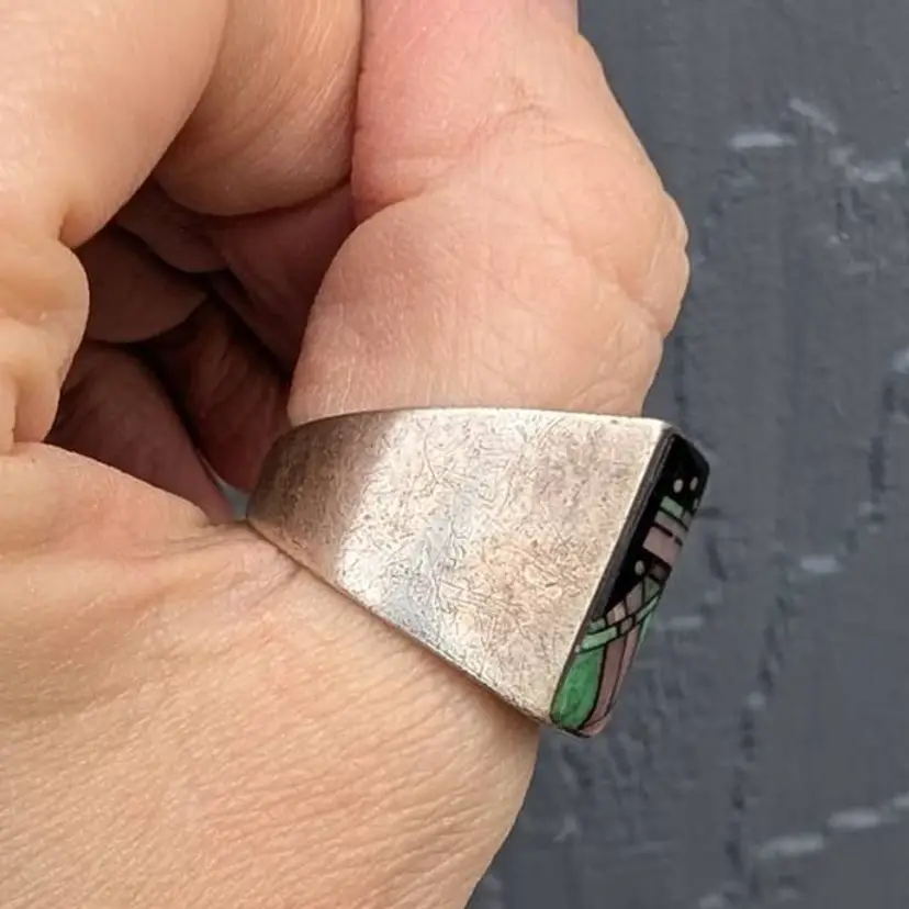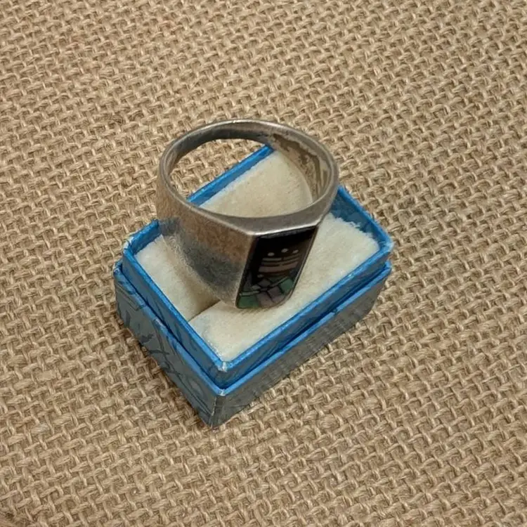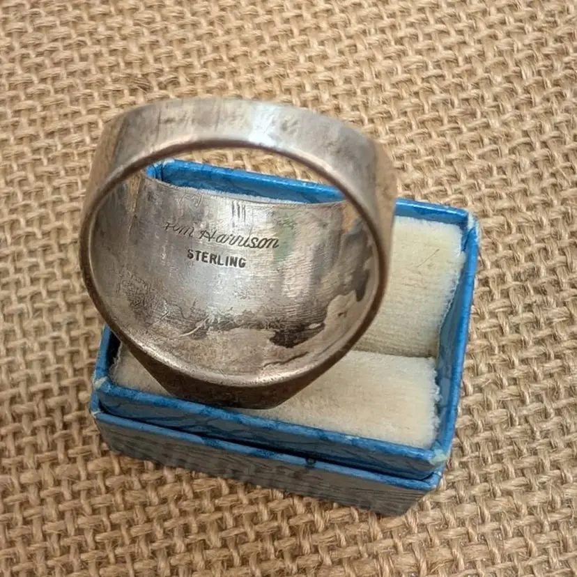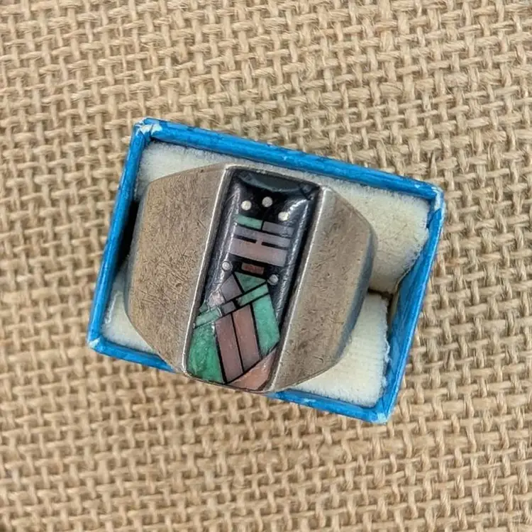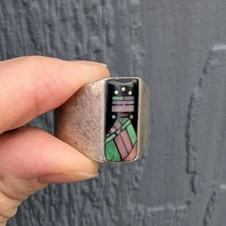 Beautiful, artistry from Jimmy Harrison! This inlay ring depicts a Yei with detailed inlay work. Signed on the inside. It is in used condition with scratches on the sterling and some slight chipping to the stone inlay on the corners (see pictures). Size 11.25