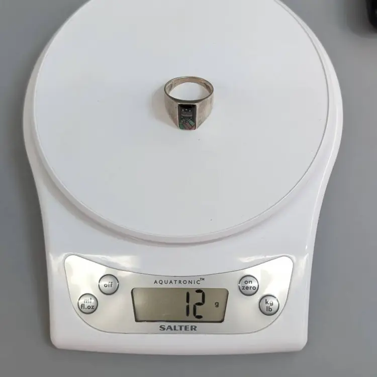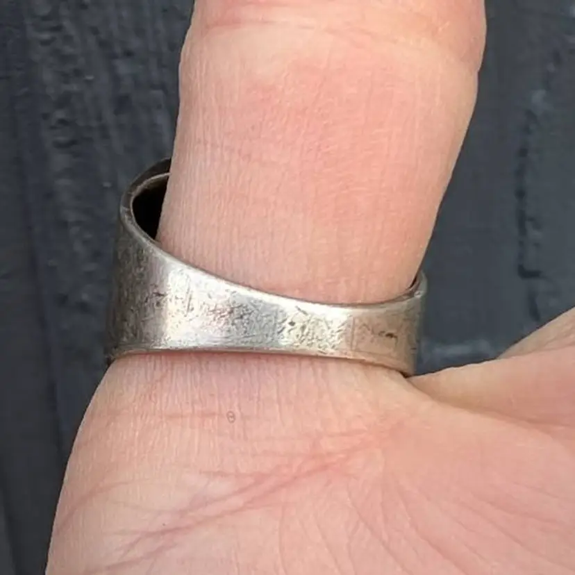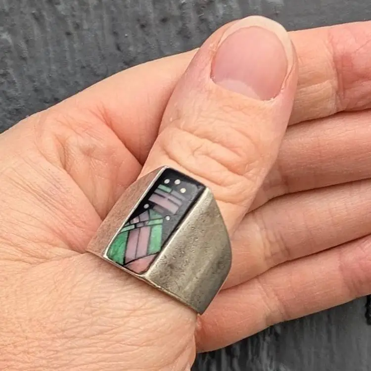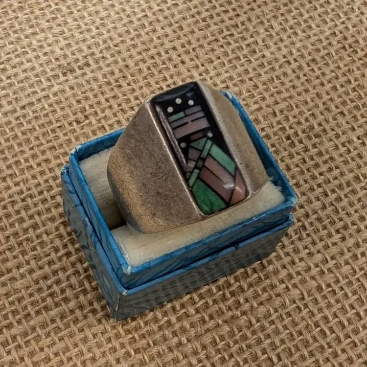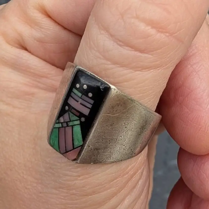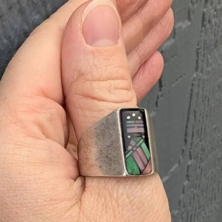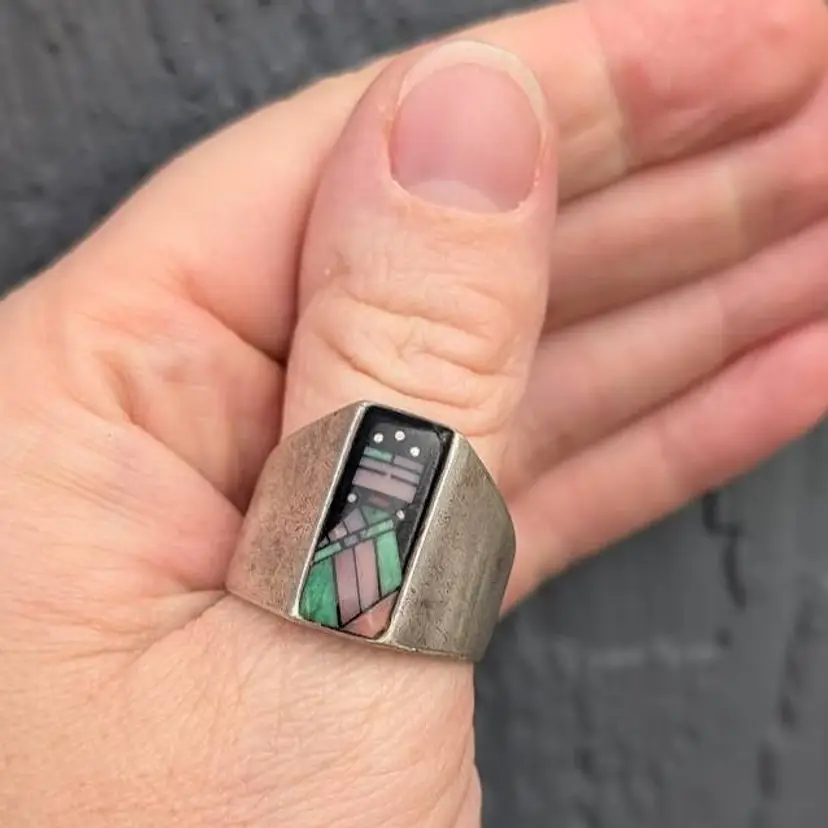 Beautiful, artistry from Jimmy Harrison! This inlay ring depicts a Yei with detailed inlay work. Signed on the inside. It is in used condition with scratches on the sterling and some slight chipping to the stone inlay on the corners (see pictures). Size 11.25