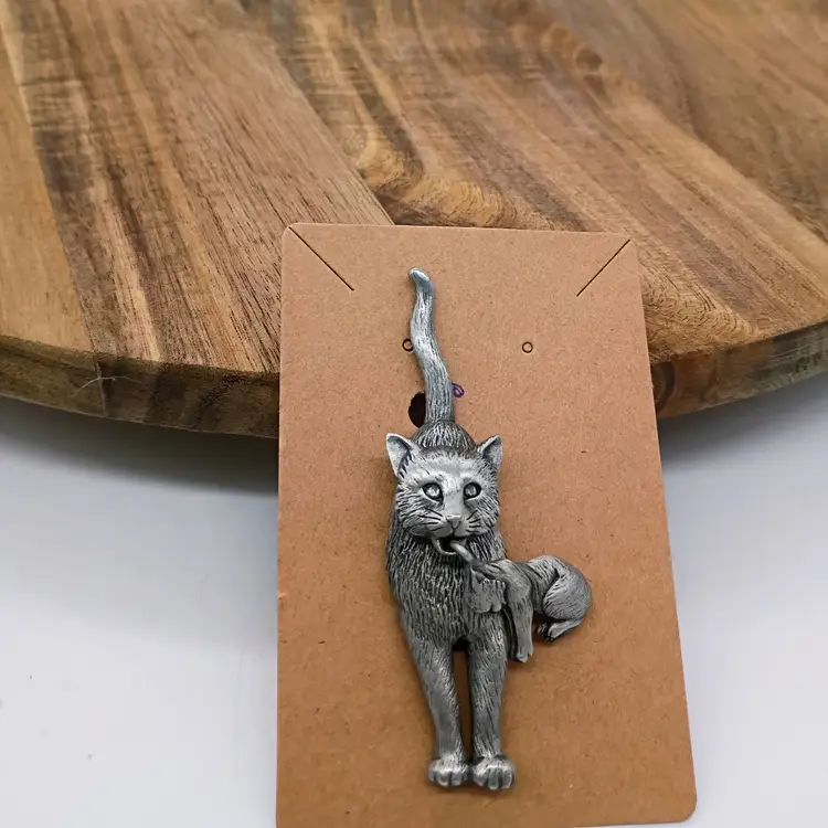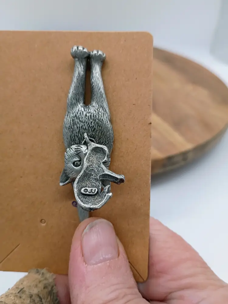 Vintage JJ Jonette Jewelry Pewter Cat carrying kitten Pin Brooch Signed. The kitten will swing side to side depending on movement of person wearing it. This is just under 3 inches tall and 1 inch side to side. This is preowned, No dents dings or damage to pin back. No oixidation or discoloration. Excellent condition. Ships USPS