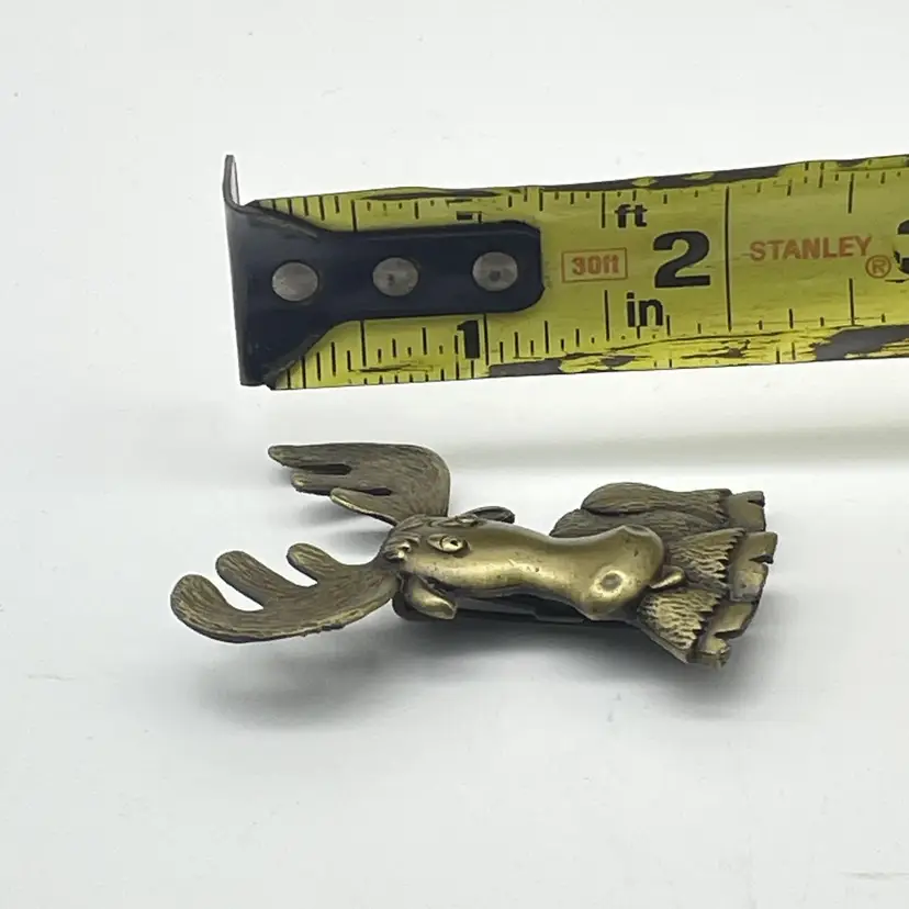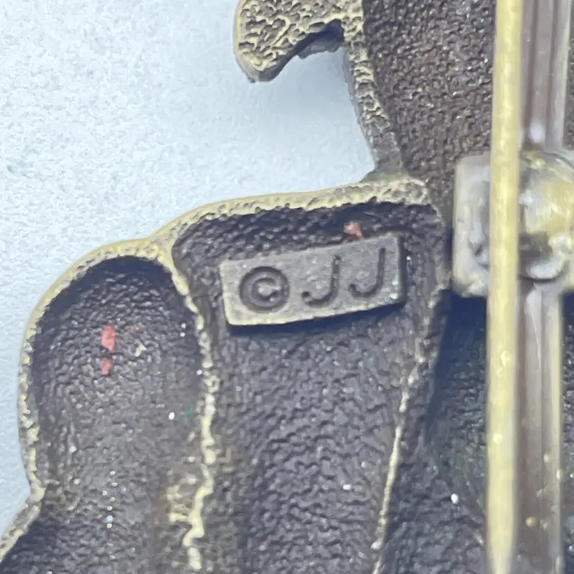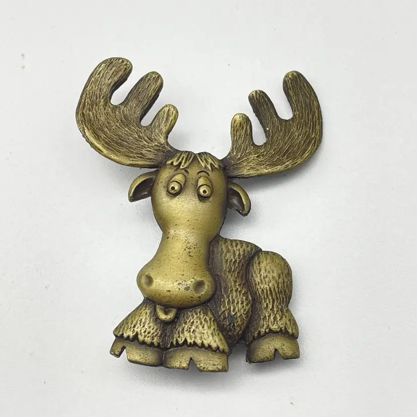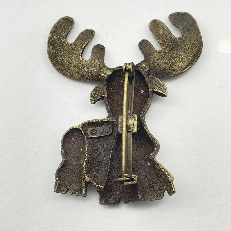 Made of brass tone metal by JJ (Jonette Jewelry Co.), marked © JJ on the back Pin back with secure clasp, fully functional Approximate size: 2 inches wide at antlers Fun vintage statement costume jewelry brooch, perfect for animal and moose collectors