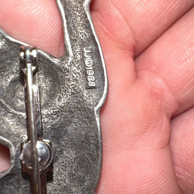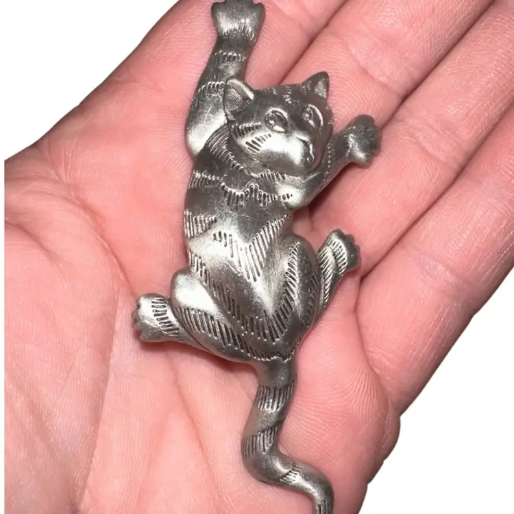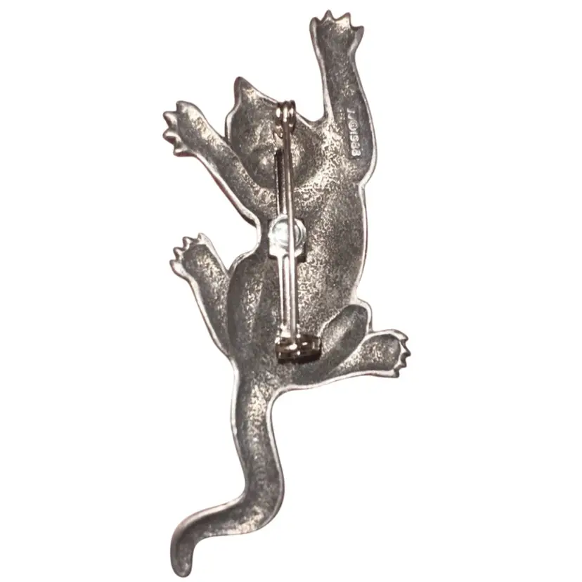 Vintage JJ Signed 1988 hanging cat Silvertone pin brooch 3”