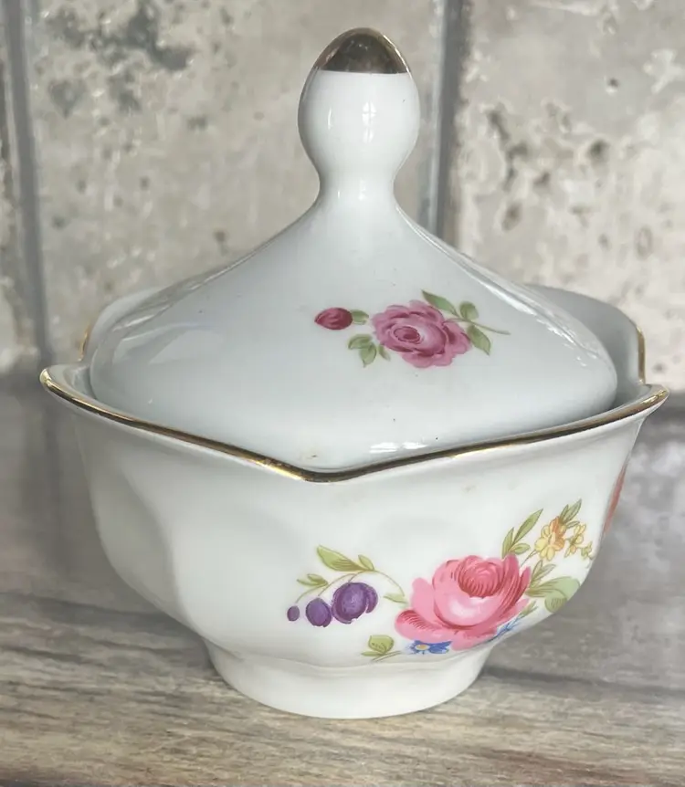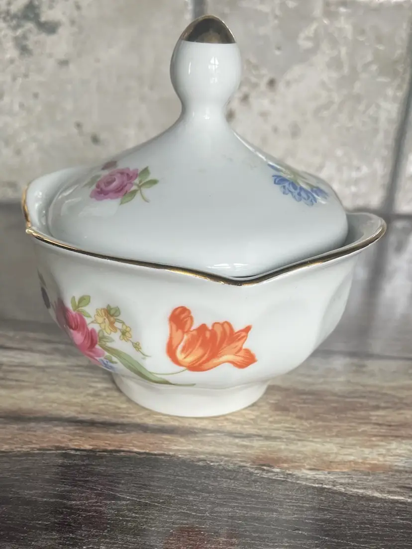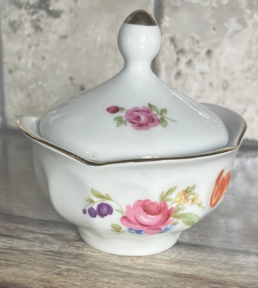 A Vintage JL Menau Graf Von Henneberg Sugar Bowl with Lid. Porcelain. Floral design with roses and tulips. 1970's. German. Marked on the bottom. Use as a sugar bowl, candy dish or display. Approximately 4 1/4 inches tall with the lid and 4 1/2 inches wide. This would also make a nice trinket box.