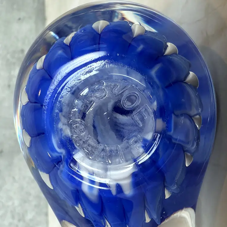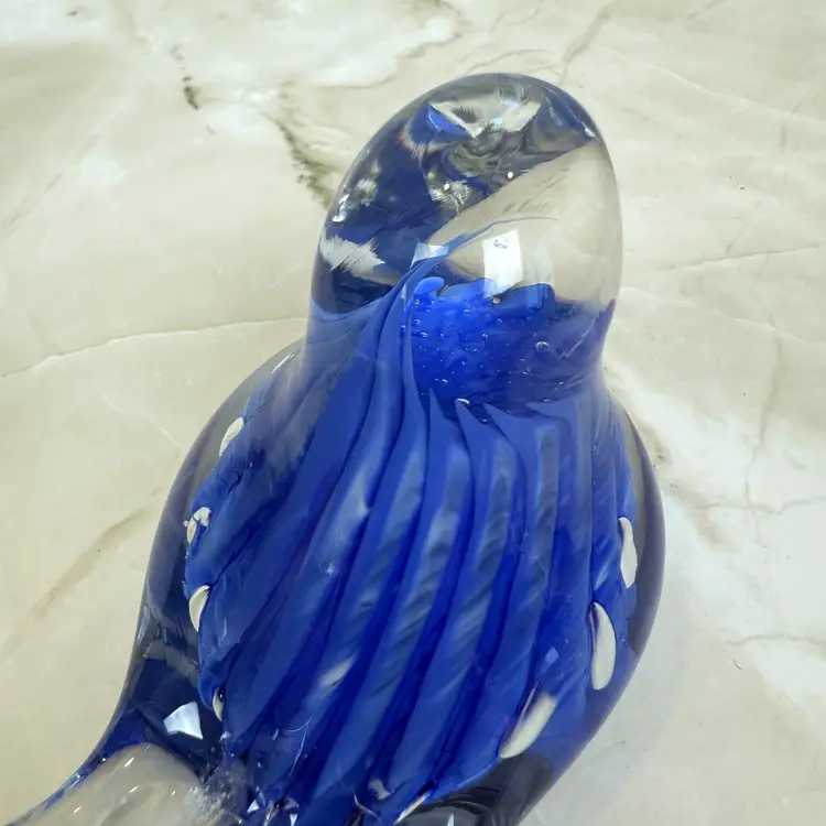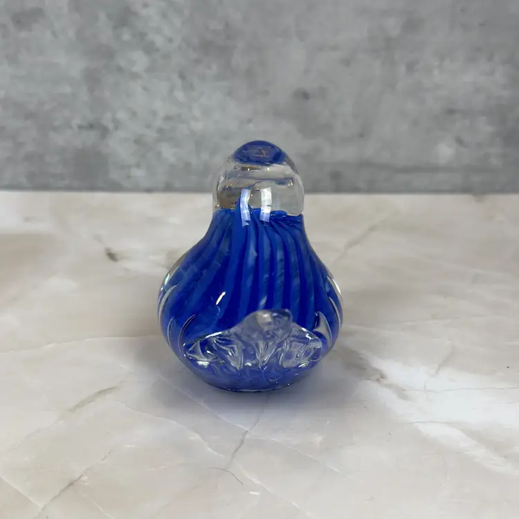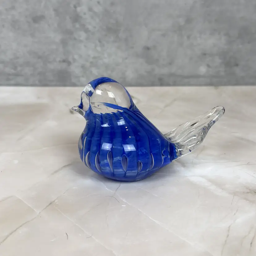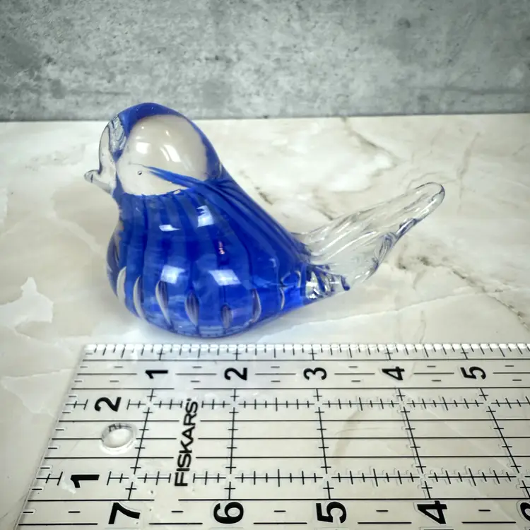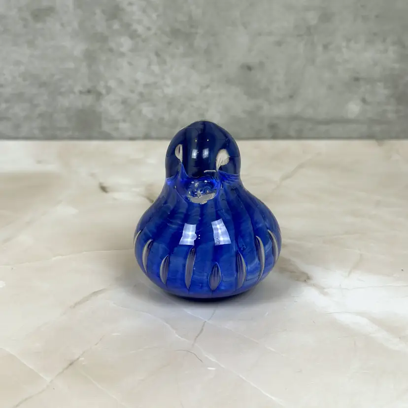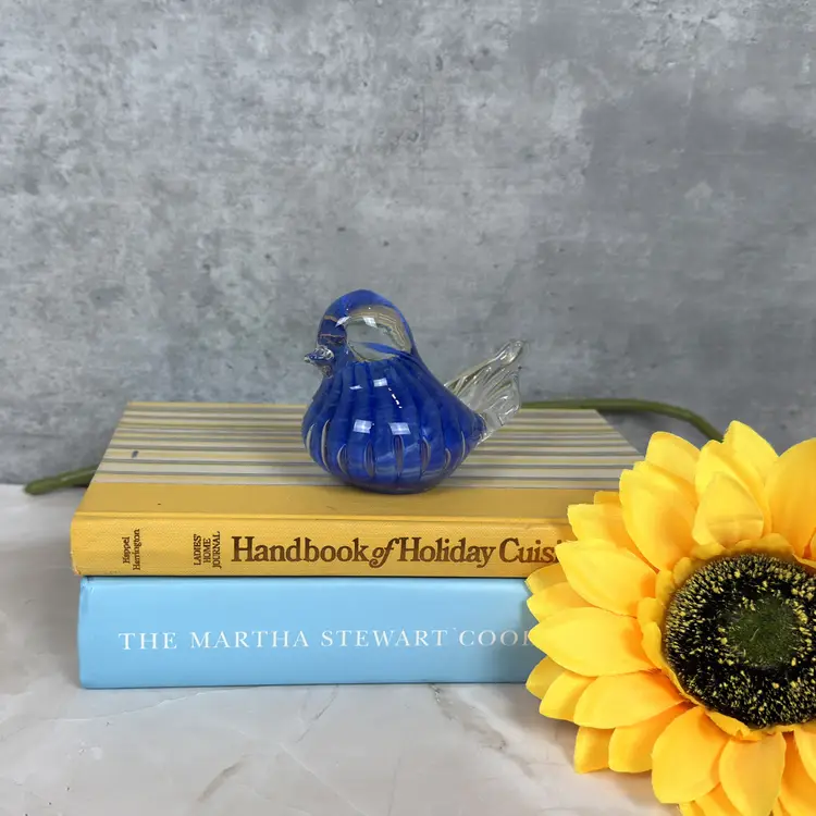 This vintage cobalt blue glass bird is here to bring a little charm and a whole lot of color to your shelf, sill, or curio cabinet. With its swirled body, clear beak and tail, and adorable plump form, this handmade beauty has plenty of personality. Whether you're a birdwatcher, a glass lover, or someone who just appreciates a pop of vintage flair, this chirpy companion is hard to resist.