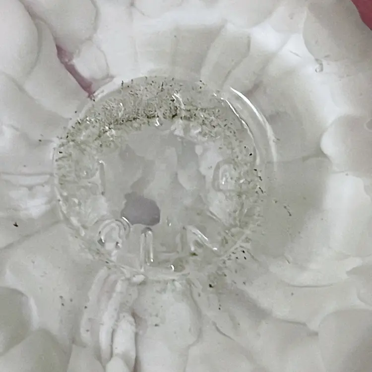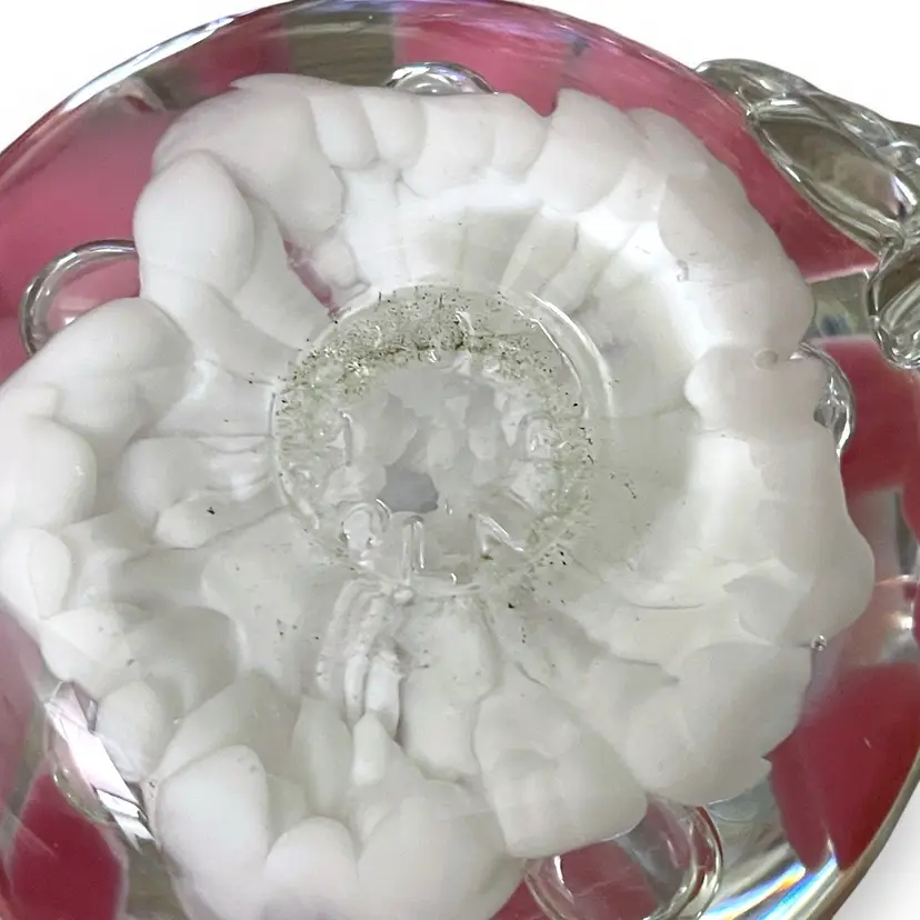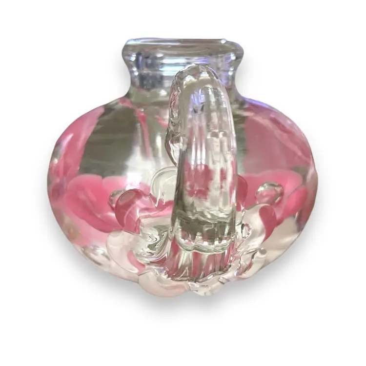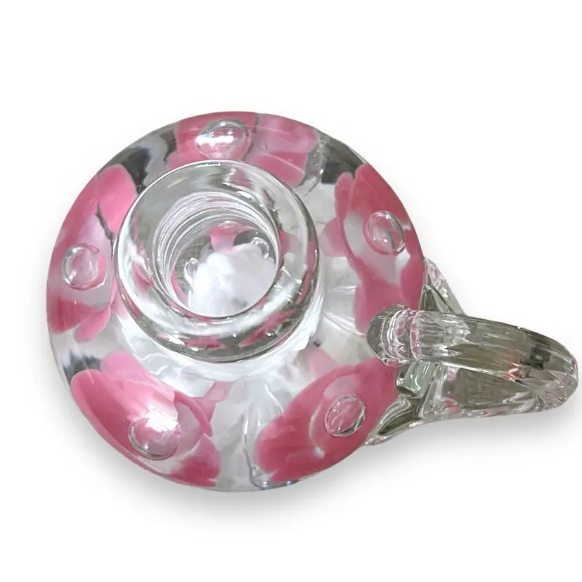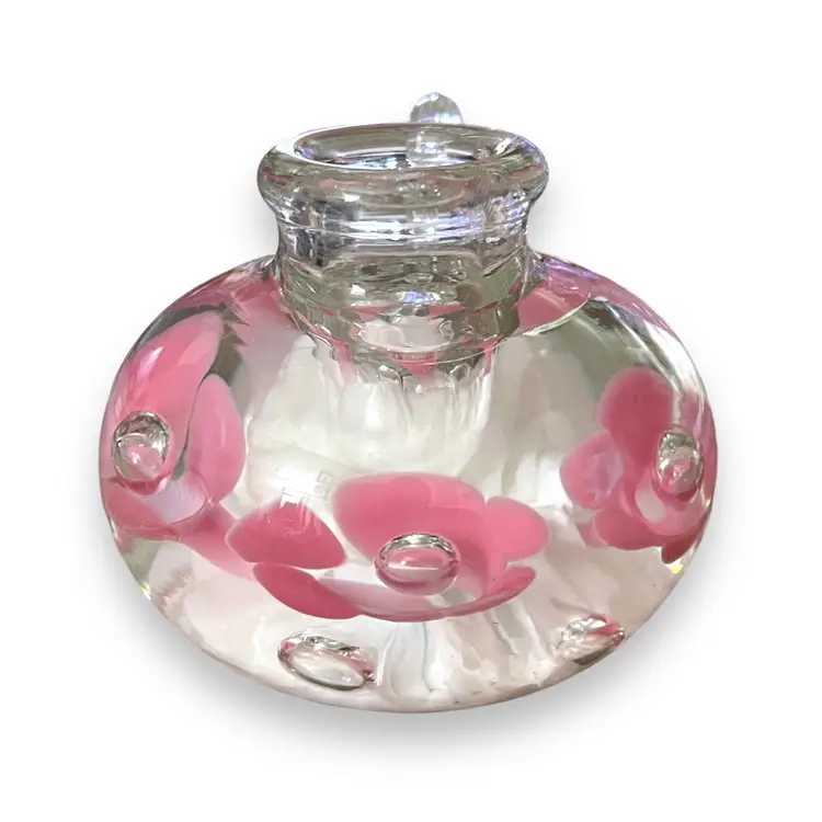 Signed pontil. Pink trumpet flowers with controlled bubbles.