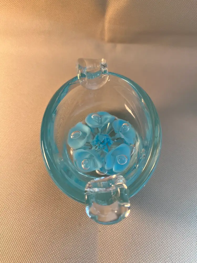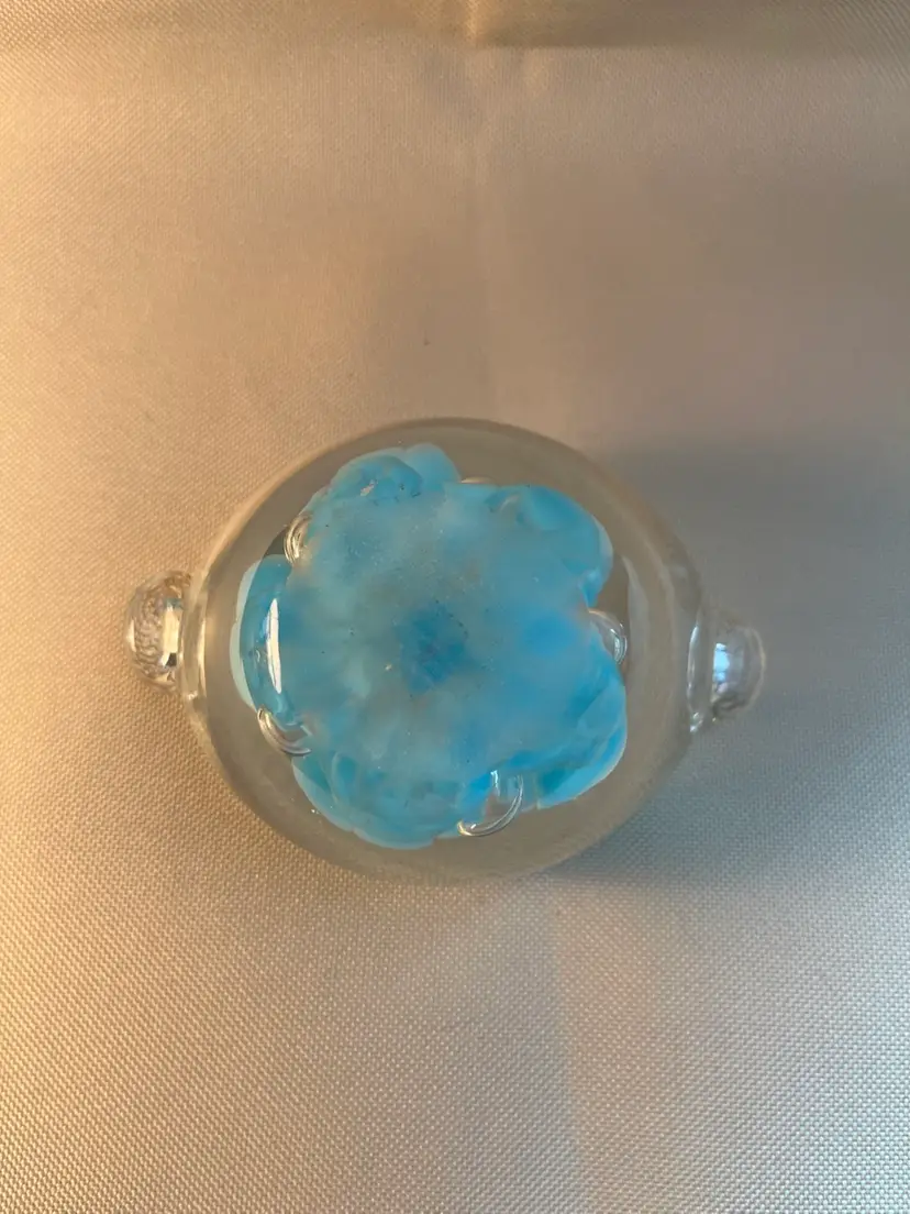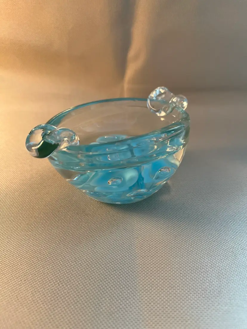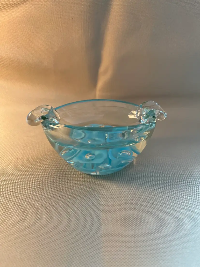 Vintage Joe St. Clair ashtray but can be used as a trinket dish with controlled bubbles and a lovely baby blue flowers inside. Nice sturdy piece. Could also be used as a paperweight as it is nice and heavy.