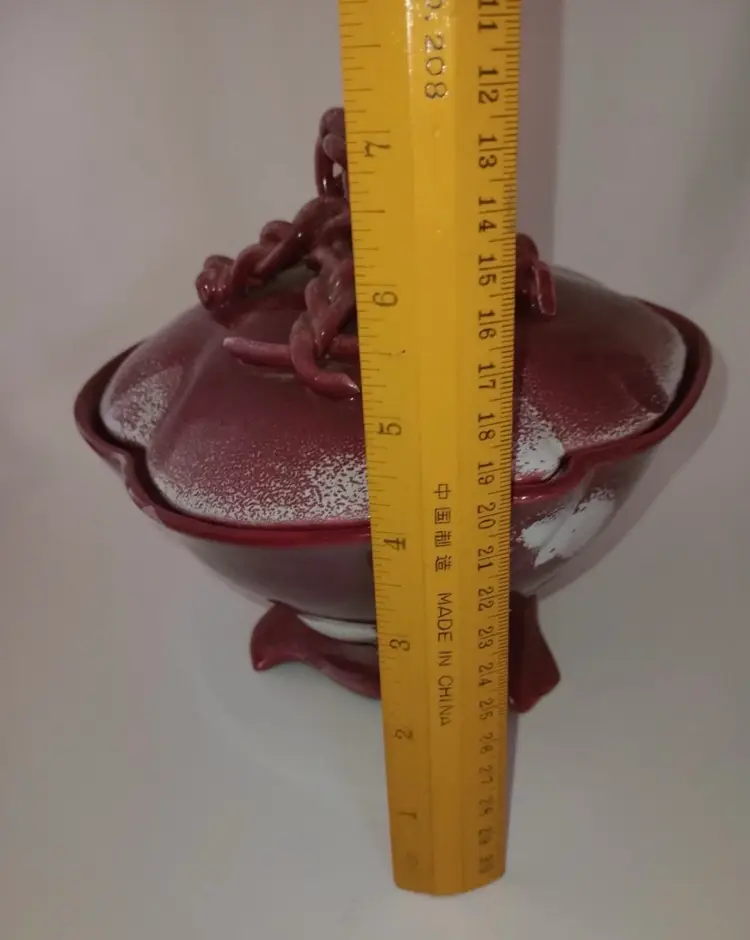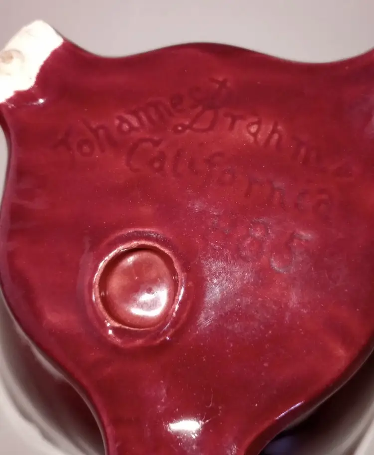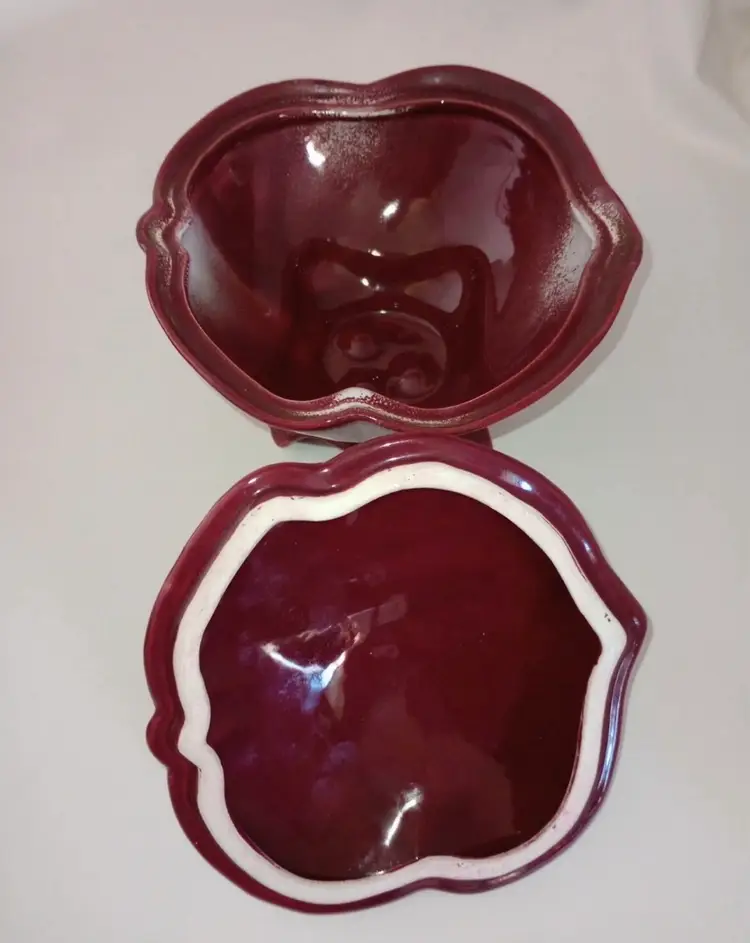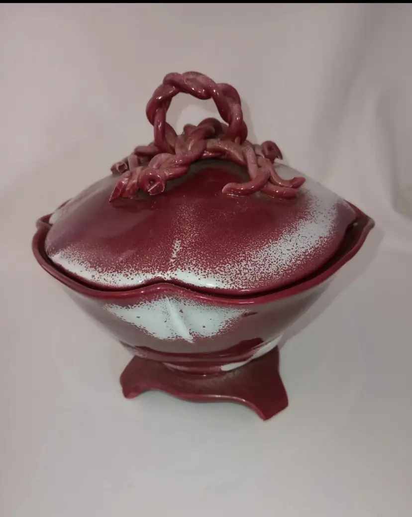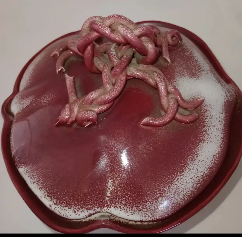 This vintage porcelain bowl is a rare find for any collector. The twisted spaghetti handle and red color make it a unique addition to any kitchen or dining room. Made by Johannes Brahm, a renowned pottery artist from California, this compote is perfect for serving your favorite dishes. Its vintage origin and production technique make it a prized possession for anyone who appreciates fine pottery. The bundle includes one piece and is perfect for adding a touch of vintage charm to your home decor.