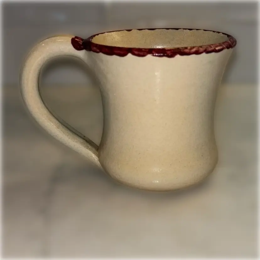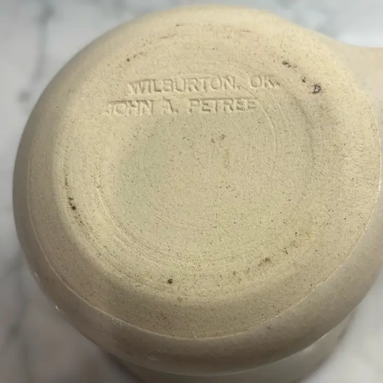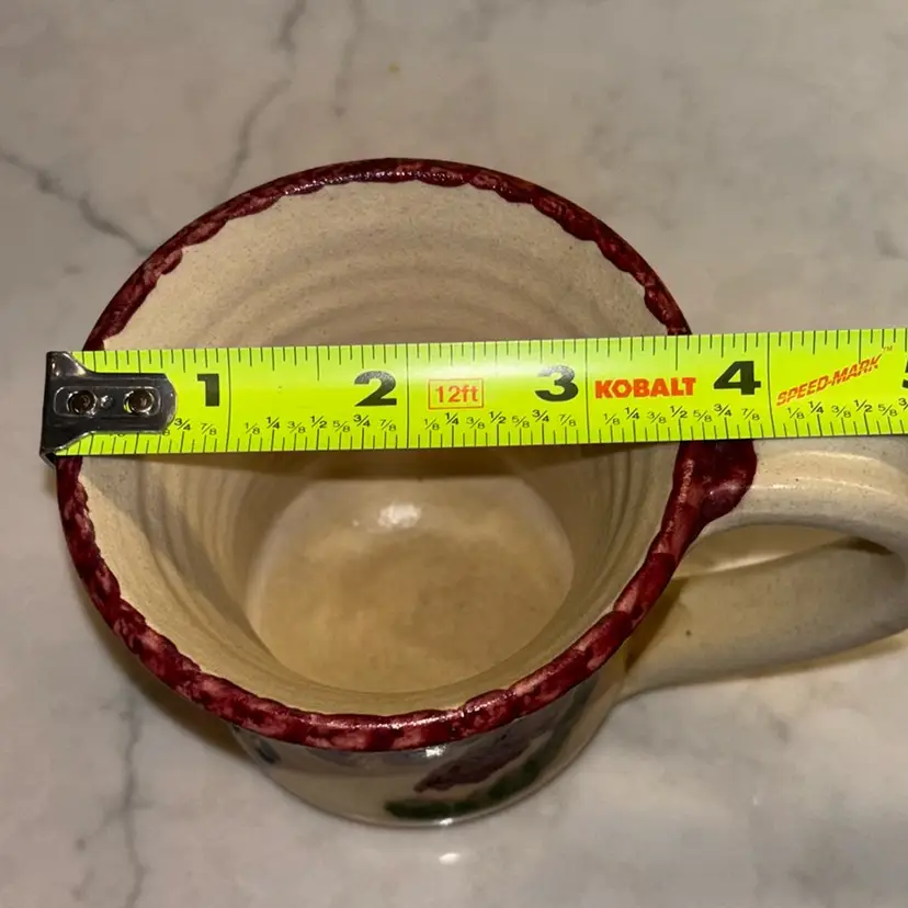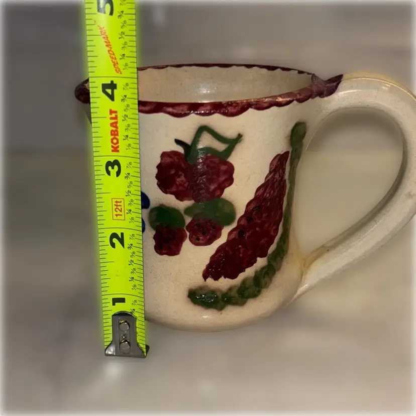 This handmade pottery mug features a hand painted design of various fruits, grapes, raspberries, strawberries, and watermelon. It was made in Wilburton, Oklahoma by John A Petree