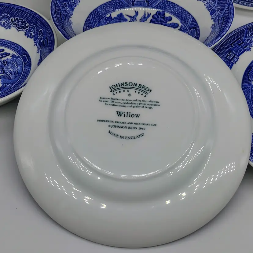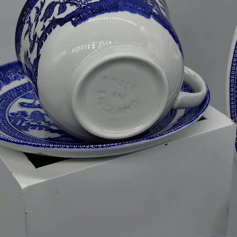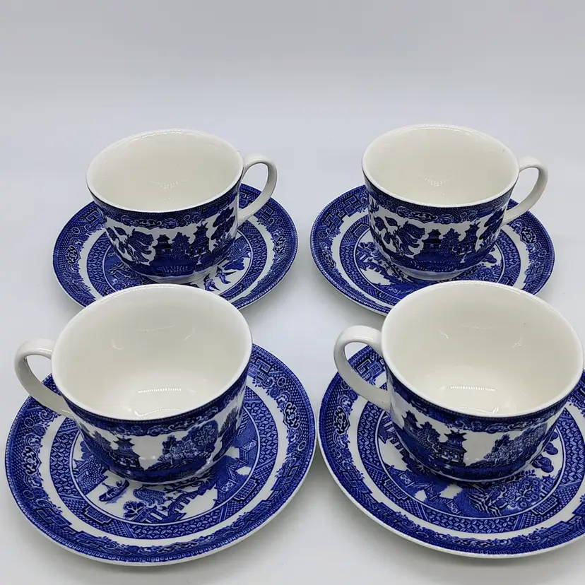 This Vintage Johnson Brothers Blue Willow 8pc Tea Service for 4 is a beautiful and collectible set of cup and saucer sets in the classic Willow pattern. Made of ceramic with a glossy finish, these pieces are a charming addition to any tea party or special occasion. The set includes four cups and four saucers, all in the signature blue and white colors. With its vintage appeal and Chinoiserie style, this tea service is a unique and stylish choice for any tea enthusiast.