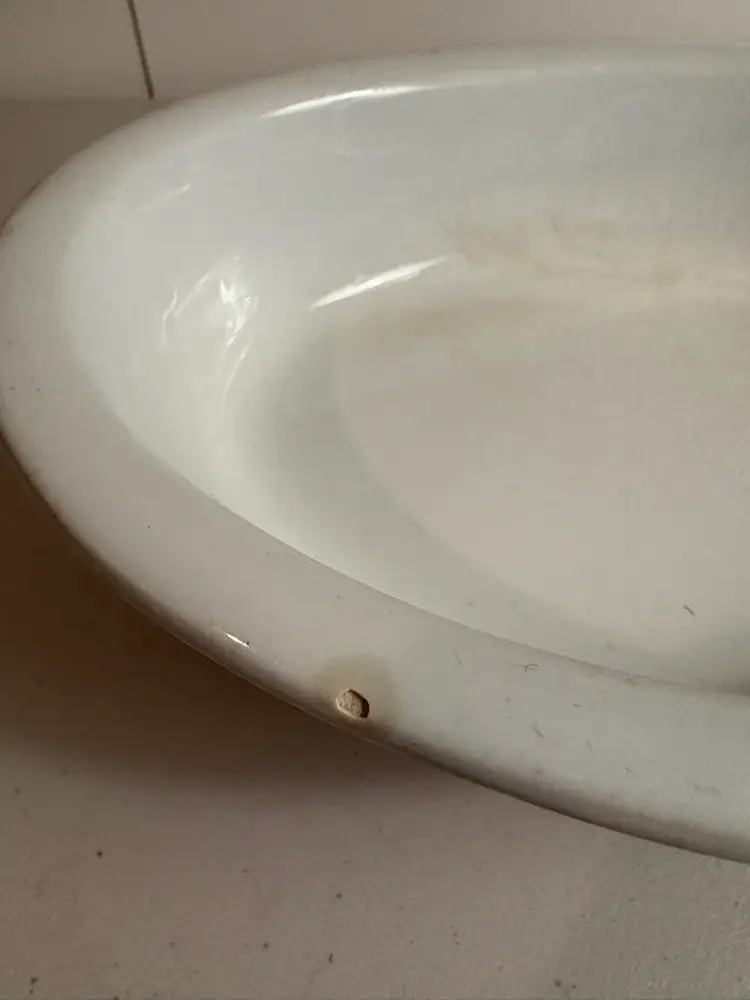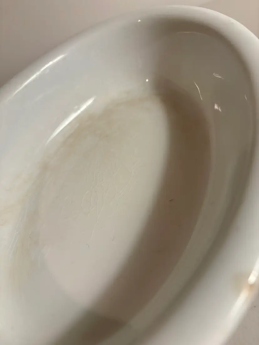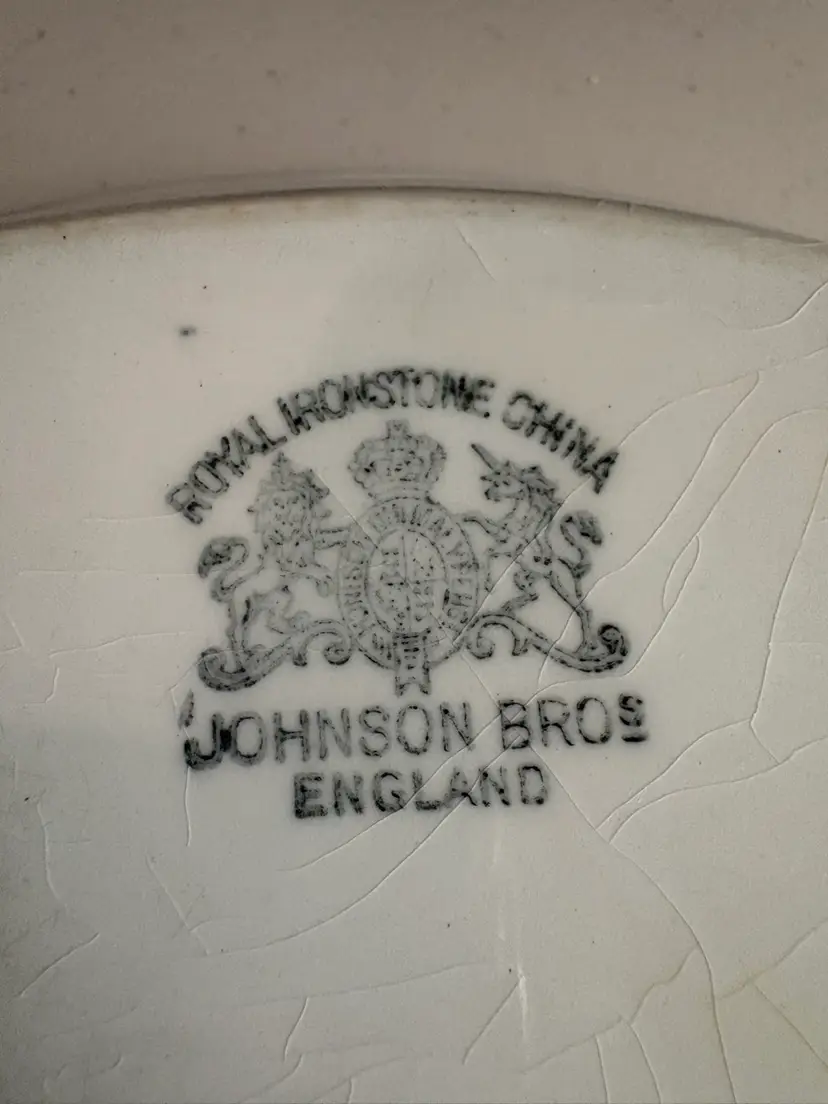 A nice ironstone oval serving bowl with some staining and one small chip. Stamped on the bottom of the platter is Royal Ironstone China Johnson Bros England.