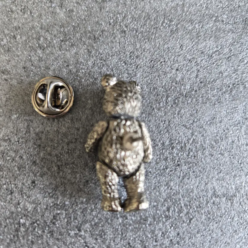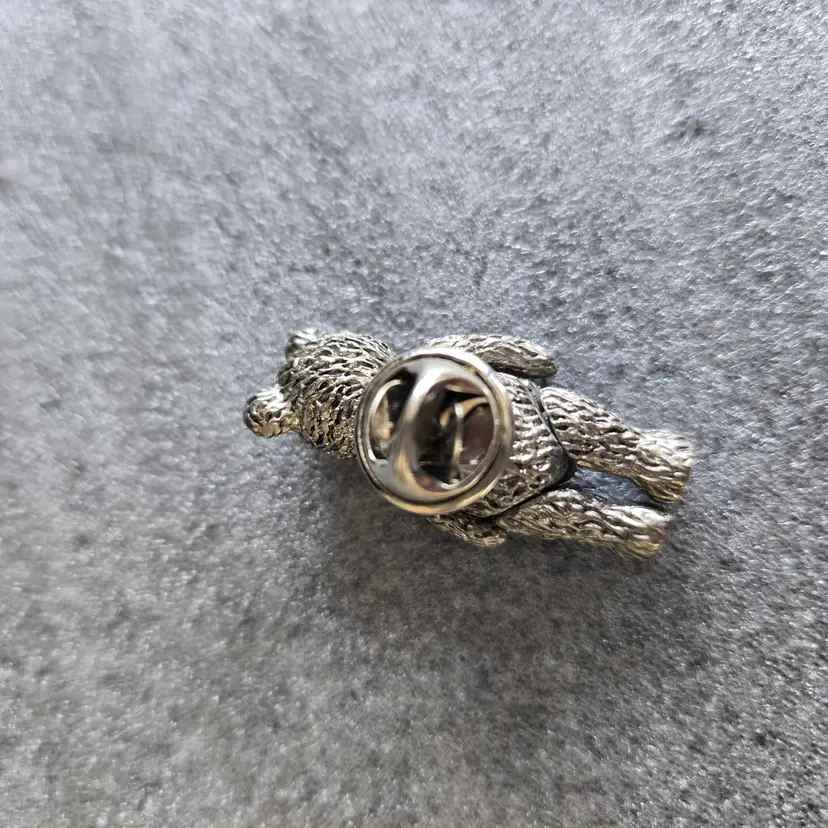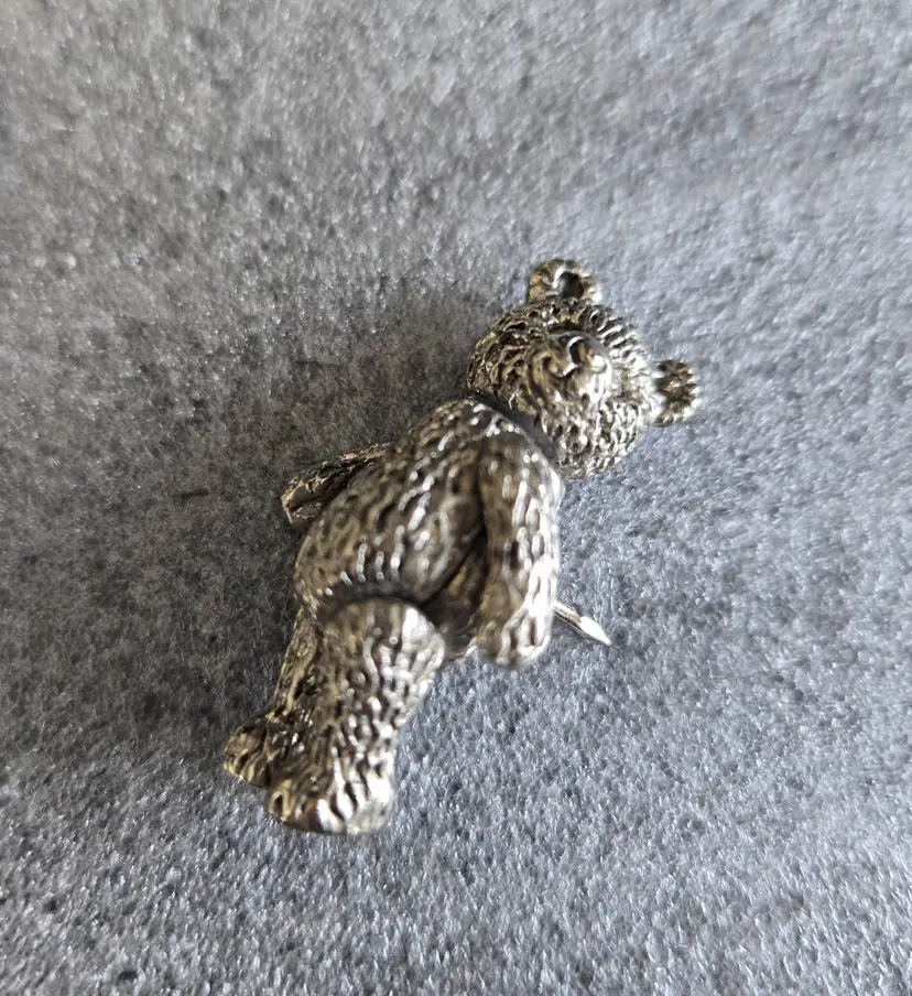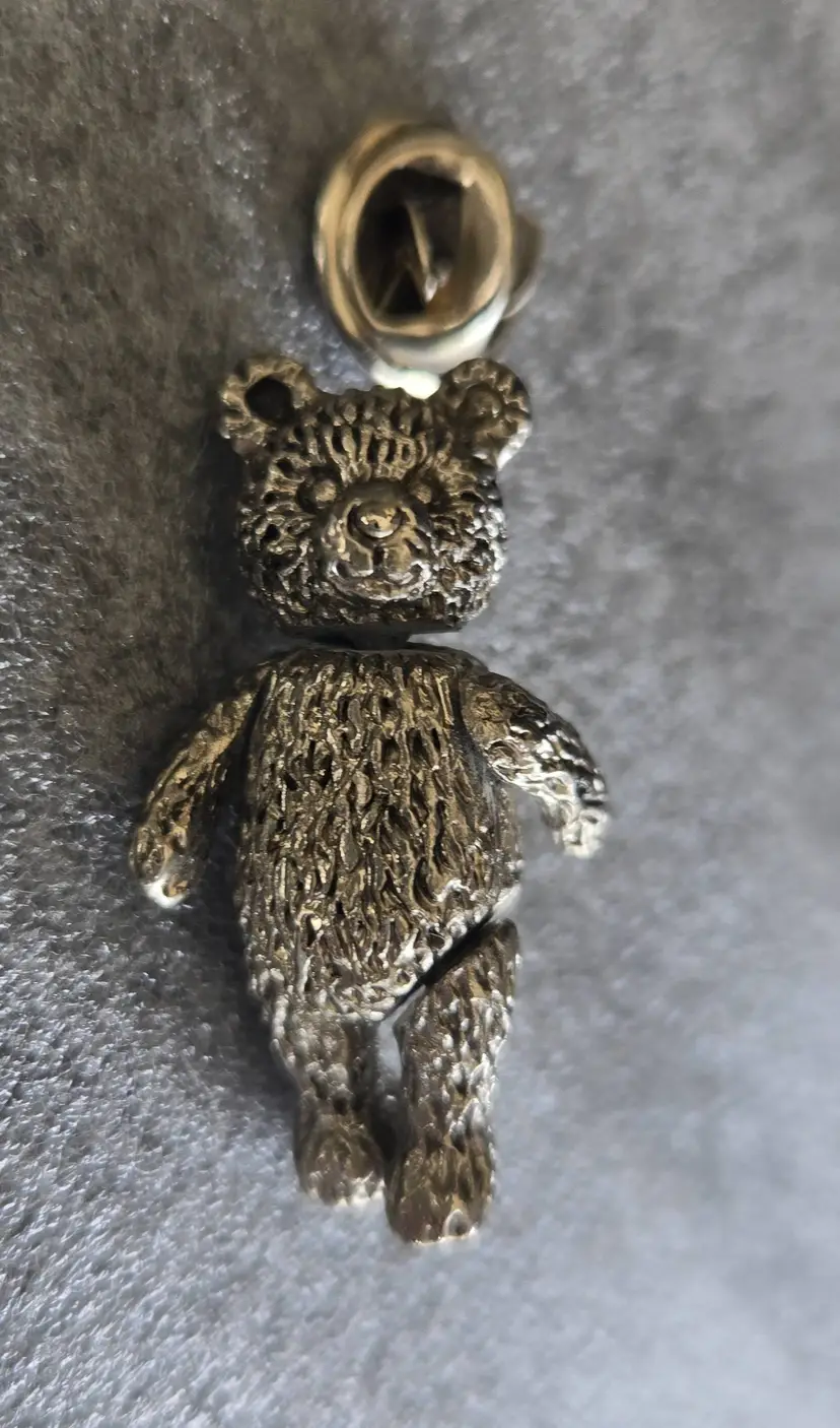 Adorable, articulated bear pin in silver tone. Head, arms, and legs are moveable. Heavy for its size - pewter? No flaws noted.